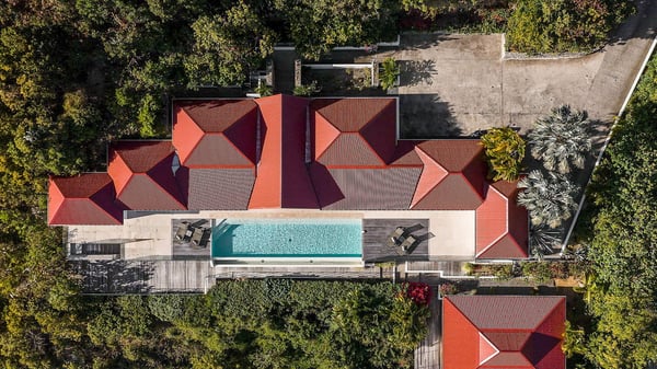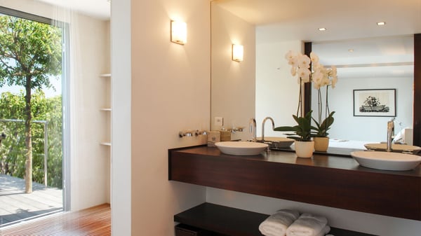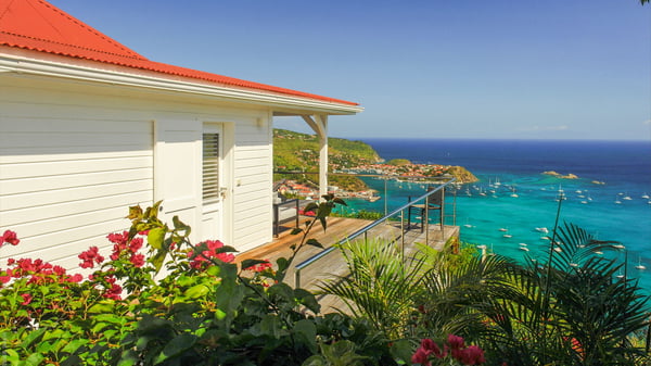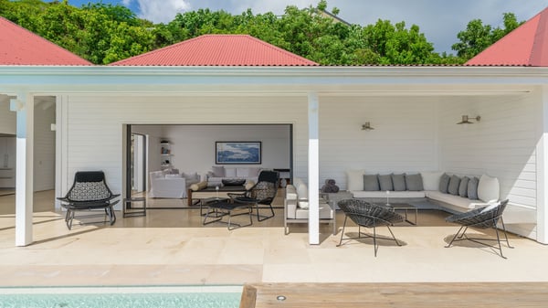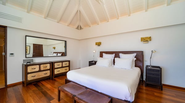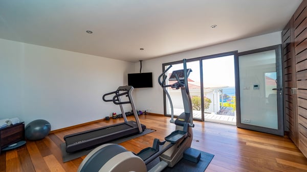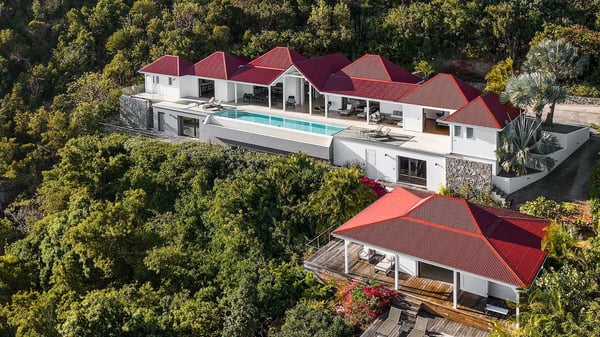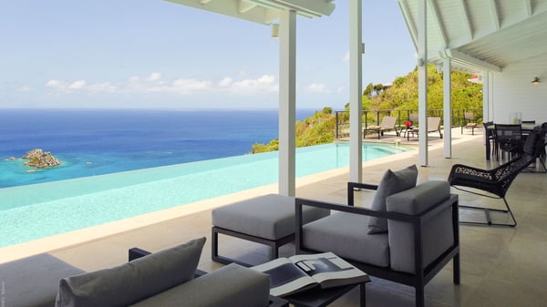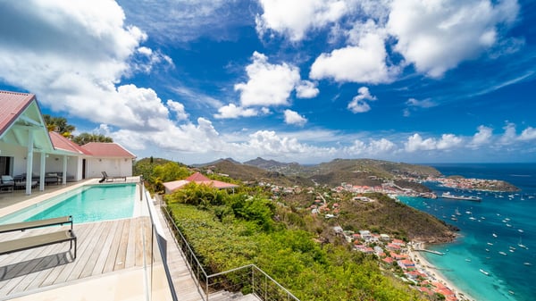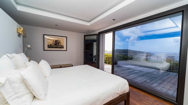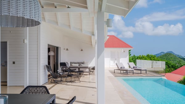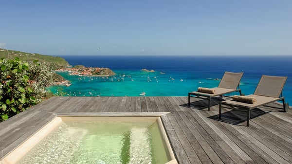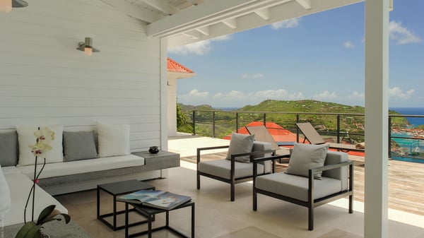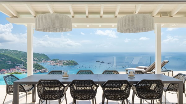 Located in a private area on the heights of Colombier, the luxurious holiday rental The View offers one of the most breathtaking panoramas in St.Barthelemy. Nestled on a hillside, the property offers a spectacular view of Gustavia's harbour and the neighbouring bays, as the perfect place to admire the ballet of yachts in high season as well as the incandescent and mesmerizing sunset shows. The villa is built in a typical colonial style on two levels and several pavilions in front of the amazing view. The elegant and sleek decoration of the villa is light and uncluttered so that hosts feel private and free, and let their thoughts go. The large air-conditioned living room opens onto the terrace with a beguiling infinity-heated pool that seems to melt with the deep blue ocean. Furnished with contemporary sofas under the high mansard and whitewashed ceilings, the living room is quiet and chic and designed to provide a delightfully airy feeling. On the other side of a covered corridor creating two spaces, there is the large kitchen perfect for preparing meals and drinks around the central island. A beautiful indoor dining room can accommodate up to eight guests facing the splendid view over the infinite blue sky. All is warm and modern at the same time, under the high ceilings which create a feeling of a most luxurious volume. On the terrace that runs the length of the villa, the splendid heated infinity swimming pool is surrounded by sun loungers and comfortable outdoor furniture, including a lounge under the covered terrace. A beautiful dining table is also at your disposal for succulent meals, lulled by the island’s soft trade winds. Everywhere you watch, the lush vegetation decorates the panorama with the chiselled leaves of the palm trees and the abundance of bougainvillea flowers with fuchsia tones. The holiday rental villa The View in St-Barts has four beautiful air-conditioned rooms with king-size beds and private bathrooms. All four offer a splendid view and are perfectly appointed. Two suites are located on each side of the terrace, while one bedroom is on the lower floor. The fourth very private bedroom is located in a separate bungalow with its own terrace and a jacuzzi facing the view. A well-equipped fitness room is also available in this exceptional holiday rental in St-Barths.