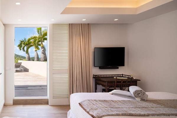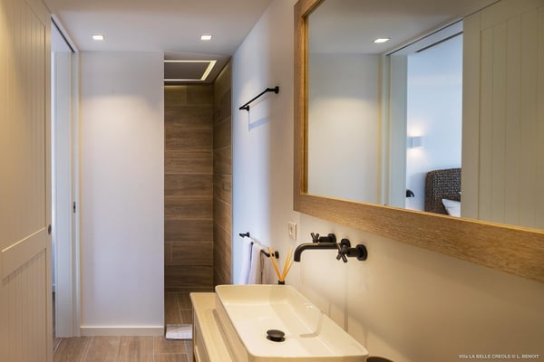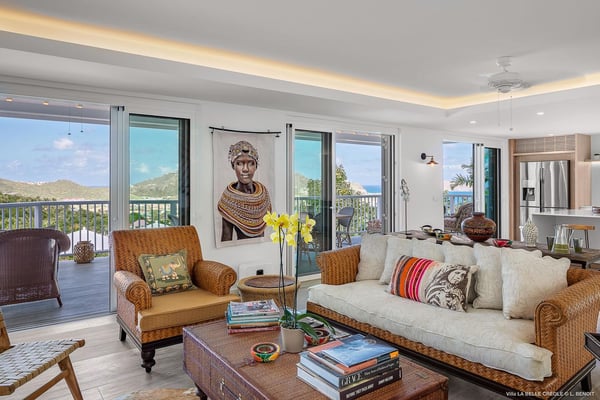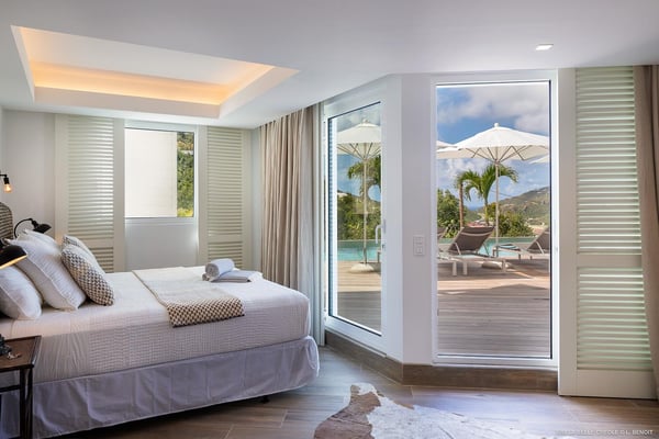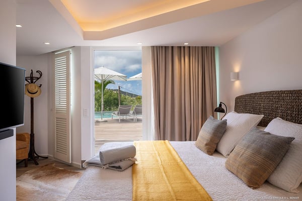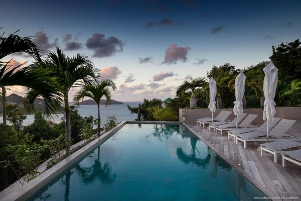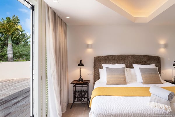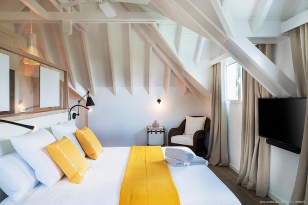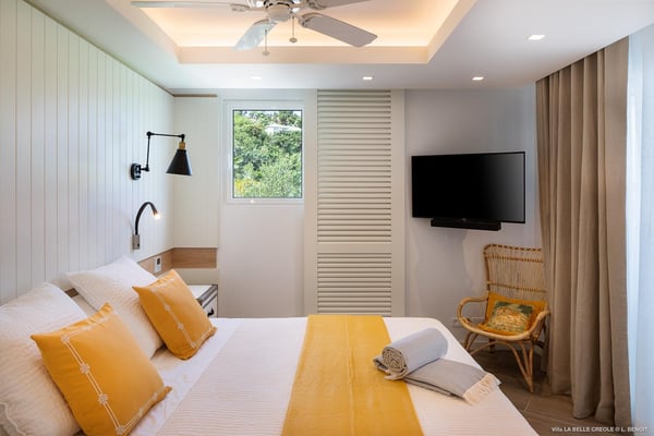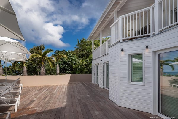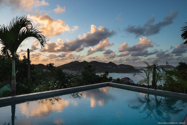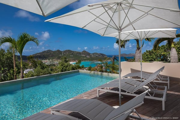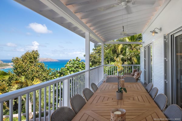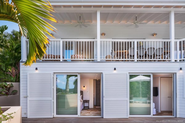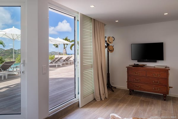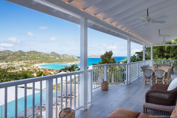 At the top of Saint-Jean Hill, the vacation rental villa La Belle Creole welcomes you in front of a breathtaking panorama over the ocean and the bay. Surrounded by a lush tropical garden, this very private seven-bedroom property in St. Barths is ideal for a group of friends travelling together and looking for a peaceful haven in the heart of the Caribbean. Built on three levels in a colonial style, villa La Belle Creole has recently been completely renovated and decorated in a modern and warm design. The spacious living room opens onto the covered terrace with views over the hills and the ocean; it features West Indies furniture, comfortable wicker sofas and armchairs which create a soft and relaxing atmosphere. The kitchen with a breakfast bar is perfectly equipped to prepare all your meals that can be enjoyed around the large table for ten guests in front of the covered terrace. A pleasant outdoor sitting area is located on the same level, facing the splendid panorama. At the back of the property near the barbecue, a lovely outdoor dining table for six guests is set up in a shaded area surrounded by vegetation, in a quiet atmosphere. On the sunny terrace located on the lower level, there is a beautiful swimming pool with lounge chairs for your sunbathing sessions. In the shade of the large parasols, you’ll marvel at the view over Saint-Jean Bay and its crystal-clear waters. Around the house, the palm trees bring a delicious vegetal touch of chiselled leaves swept by the trade winds. The rental villa La Belle Creole in St-Barths has seven air-conditioned bedrooms tastefully decorated. Four elegant suites with king beds and private bathrooms are located on the lower level overlooking the terrace, while another equivalent room is on the main level near the living room. On the top floor, there are two additional bedrooms sharing the same bathroom, as well as one with a smaller bed perfect for a child (an extra bed is available upon request). The rental villa La Belle Creole in St-Barts is definitely the perfect place for an enchanting family vacation in the Caribbean