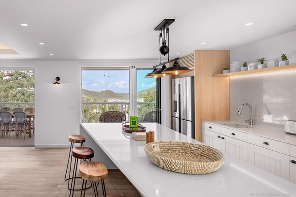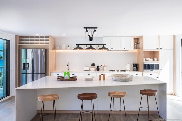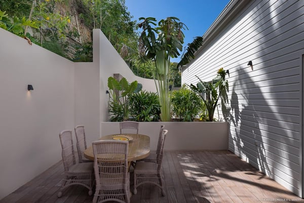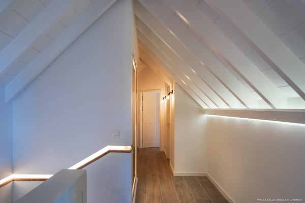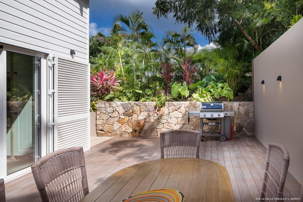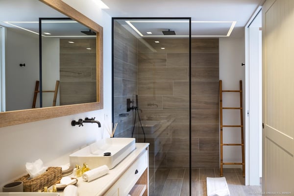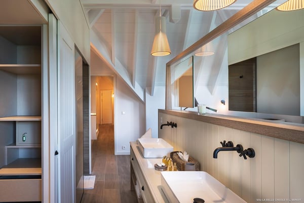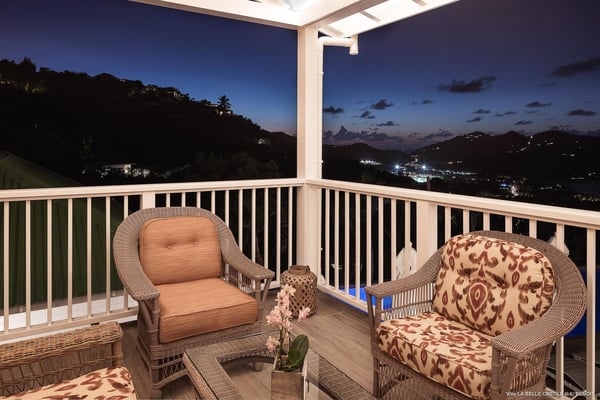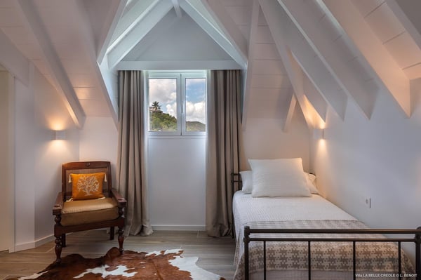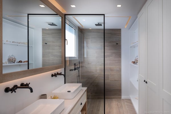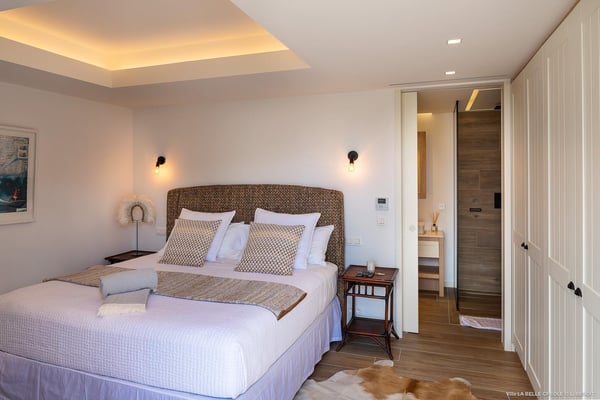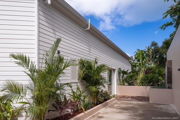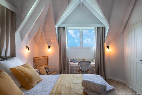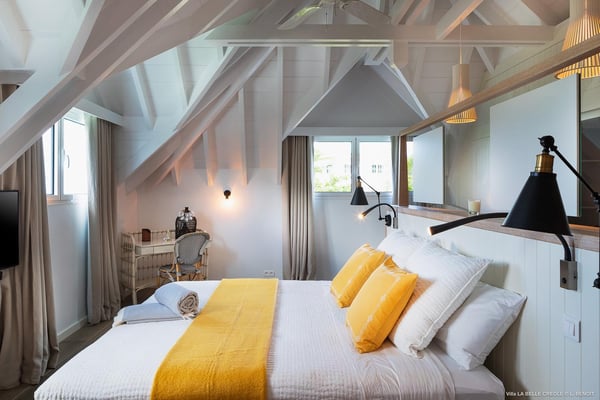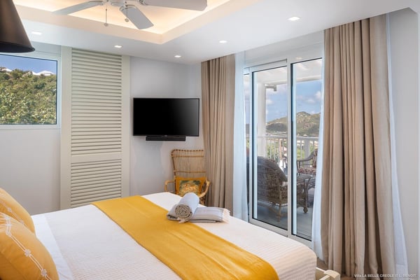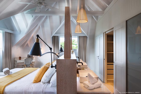 At the top of Saint-Jean Hill, the vacation rental villa La Belle Creole welcomes you in front of a breathtaking panorama over the ocean and the bay. Surrounded by a lush tropical garden, this very private seven-bedroom property in St. Barths is ideal for a group of friends travelling together and looking for a peaceful haven in the heart of the Caribbean. Built on three levels in a colonial style, villa La Belle Creole has recently been completely renovated and decorated in a modern and warm design. The spacious living room opens onto the covered terrace with views over the hills and the ocean; it features West Indies furniture, comfortable wicker sofas and armchairs which create a soft and relaxing atmosphere. The kitchen with a breakfast bar is perfectly equipped to prepare all your meals that can be enjoyed around the large table for ten guests in front of the covered terrace. A pleasant outdoor sitting area is located on the same level, facing the splendid panorama. At the back of the property near the barbecue, a lovely outdoor dining table for six guests is set up in a shaded area surrounded by vegetation, in a quiet atmosphere. On the sunny terrace located on the lower level, there is a beautiful swimming pool with lounge chairs for your sunbathing sessions. In the shade of the large parasols, you’ll marvel at the view over Saint-Jean Bay and its crystal-clear waters. Around the house, the palm trees bring a delicious vegetal touch of chiselled leaves swept by the trade winds. The rental villa La Belle Creole in St-Barths has seven air-conditioned bedrooms tastefully decorated. Four elegant suites with king beds and private bathrooms are located on the lower level overlooking the terrace, while another equivalent room is on the main level near the living room. On the top floor, there are two additional bedrooms sharing the same bathroom, as well as one with a smaller bed perfect for a child (an extra bed is available upon request). The rental villa La Belle Creole in St-Barts is definitely the perfect place for an enchanting family vacation in the Caribbean