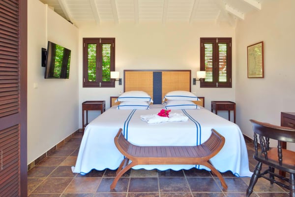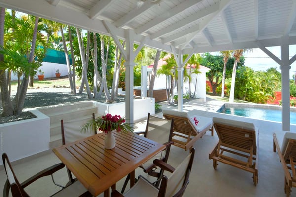 Villa Kir Royal is a 4-bedroom villa located in St. Jean within a short walk of the beach, restaurants, and shopping. Surrounded by palm trees, this villa enjoys a landscape view. The living room is furnished with a Rattan sofa and chairs, and opens to an outdoor living under a covered terrace. The living room shares its space with a well-equipped kitchen and a small dining table with bench seating. The kitchen opens to a covered terrace, which houses a large dining area outside with seating for 8 guests alongside a gas grill. The villa is comprised of three separate dwellings. The pool is centrally located between them. The master bedroom is located in the main house with the living space and kitchen behind the pool. Two bedrooms are located to the right of the pool, and the last bedroom is located to the left of the pool. All of the bedrooms have king-sized beds. A small yard with bougainvillea lies next to the spacious pool deck. Loungers and palm trees surround the non-chlorine pool, making this an ideal spot for either sunbathing or reading in the shade. The house also has WiFi, a fax machine, an outdoor shower, and U.S. satellite TV. Villa Kir Royal comes with house cleaning services six days a week, except on holidays. During the December holidays, the villa rents at the full occupancy rate regardless of how many bedrooms are used. This villa is suitable for young children.