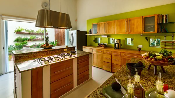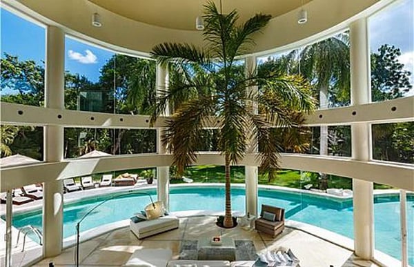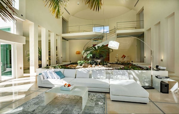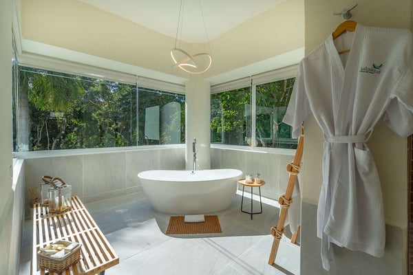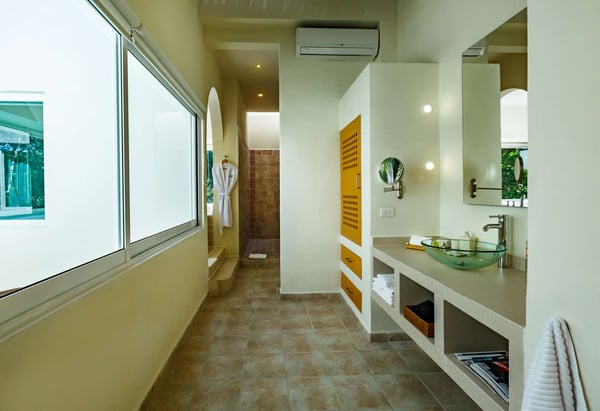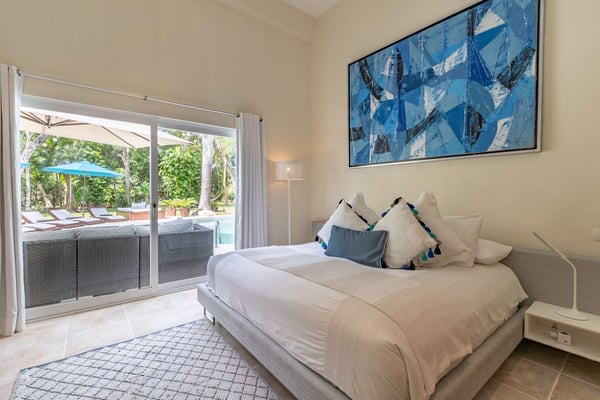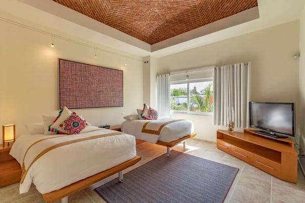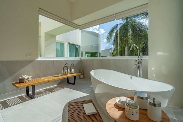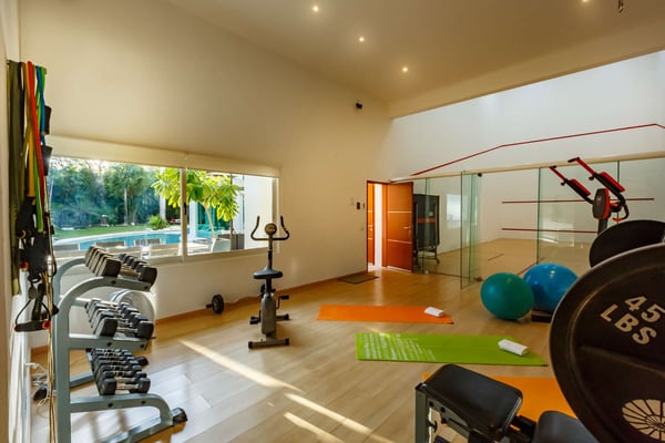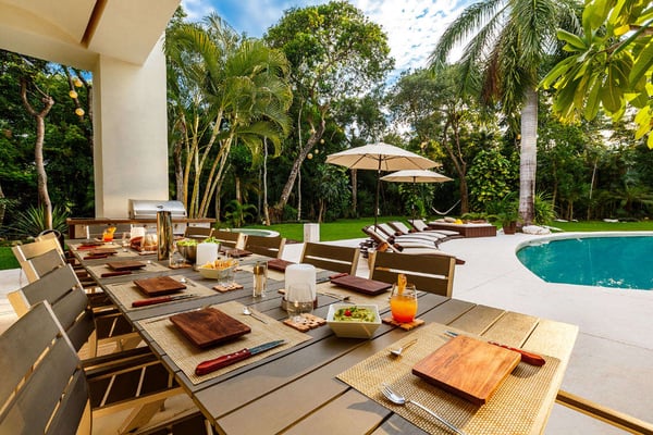 From indoor palm trees and woodfired ovens to squash courts and lounge pits, the pop-art quirkiness of this five-bedroom villa in Playa del Carmen gives you something most holiday rentals can't - a sense of fun materialized in every detail. Designed with a cubist flair and unafraid of adding a touch of color, Villa Aqua combines lush outdoors with interiors full of refreshing details. The moat-like swimming pool wraps around the main turret, where an indoor palm tree adds dimension to the double-height spaces and the panoramic views you can enjoy from the living room. The kitchen is equipped with professional-grade appliances, while the dining table can sit up to ten people. Outdoors, framed by the handsomely manicured garden, guests will find a jacuzzi, an alfresco dining table, a woodfired pizza oven, and even a sunken trampoline. The residence also has a fully equipped gym and a squash court. And then there’s the game room, with a stocked bar and a lounge pit with a large TV screen. Lastly, the bedrooms are spacious and comfortable, each with its own bathroom. The master suite boasts a free-standing bathtub too. Further, the home is located in Playacar, the city's most exclusive neighborhood, about a 15-minute walk away from the beach and the famous Quinta Avenida. Overall, Villa Aqua promises a fun experience for travelers seeking privacy in a unique vacation home.