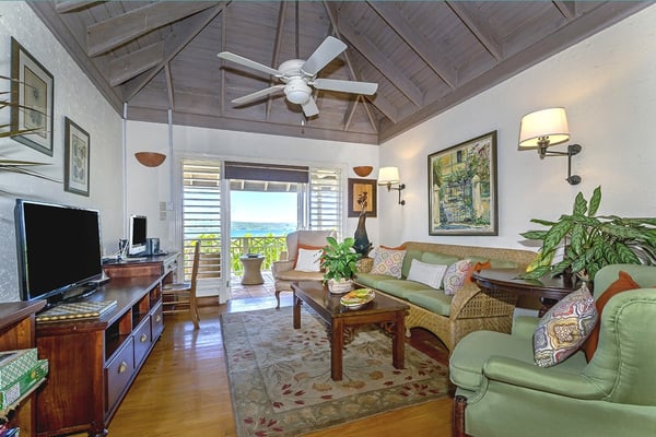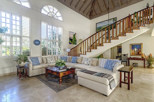On its own sugary white sand beach lapped by the turquoise waters of Discovery Bay sits the exquisite home Sugar Bay. Interiors have just been refreshed throughout and are distinguished by elegant custom-designed furniture, gleaming breadnut floors, and fascinating objets d`art from around the world. There has also been an addition of a brand new air-conditioned Gym! A sweeping staircase curves gracefully through the dramatic living room to a minstrel's gallery and cozy upstairs second sitting area with satellite/DSS television and VCR. Quadraphonic speakers fill the vaulted living room, verandah, and pool area with sound. Salmon-hued Italian tiles, the blue mosaic pool, flower-draped balconies and porches, and textures of terra cotta and stone create a Mediterranean ambiance. From the large verandah, the soft grassy lawn gently slopes 30 feet to the 100-foot private beach. Home-cooked meals are served on the verandah ~ or guests may opt to dine in the country-French indoor dining room, a quietly elegant space featuring a unique hand-carved sideboard and rush-woven chairs. As a special treat, the staff will plan a torchlight beach party ~ with chicken, lobster, tenderloin, or fresh fish grilled on the outdoor barbecue. The seaside gazebo provides a wonderful platform for watching glorious sunsets across the water and dining romantically by candlelight. Stargazing from this spot is magical. Water sports are available just a few minutes' drive from Sugar Bay. In lively Ocho Rios, 25 minutes away are nightlife, excellent restaurants, shops, open-air craft markets, more water sports, Prospect Plantation Great House, rafting on the Martha Brae, jitney tours of a working plantation, and dramatic Dunn's River Falls. The driving time from Montego Bay Airport to Sugar Bay is approximately 55 minutes. Discovery Bay is a pristine aqua jewel on Jamaica's north coast, boasting some of the Island's most beautiful private homes. Sugar Bay is one of the best.