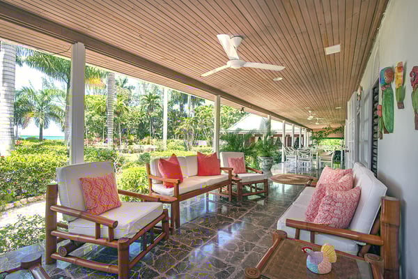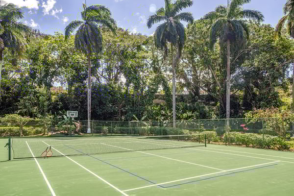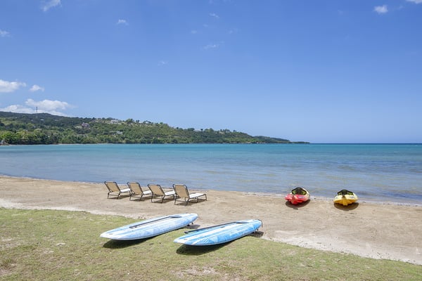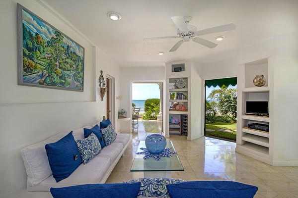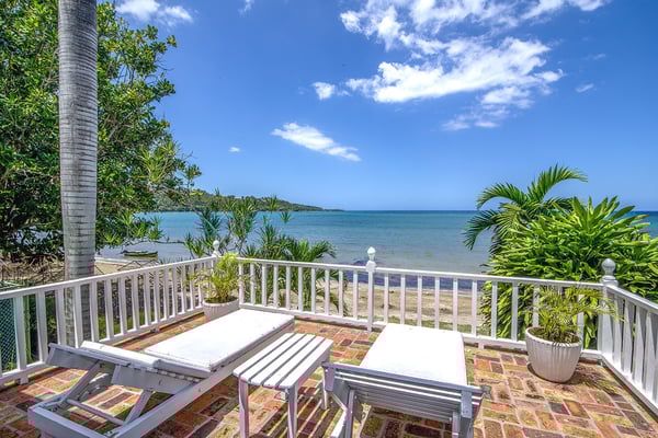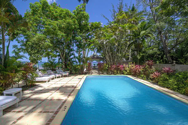 True to its name, Tranquillity is a place for relaxing into the calm ambiance of an exquisite home on a waterfront site while being gently pampered by a competent staff. The well-appointed rooms of Tranquility stretch over 6,300 square feet of rich marble floors. Artful landscaping ensures year-round flowers in bloom, which in turn ensures regular visits from hummingbirds and parrots. The grounds resemble a private park dotted with mango, guava, banana, plantain, lime, soursop apple, and papaya trees. The entrance draws you past an indoor waterfall garden as you approach the spacious Great Room, which opens to an 86 furnished verandah. Meals are served by the butler on the verandah overlooking two acres of landscaped grounds and the sea ~ or served in the inside formal dining room ~ or, as a special treat, served in the romantic waterfront gazebo by candlelight. On calm nights, two or three local fishermen may ease through the water beyond the gazebo carrying torches and laying nets for the fresh catch they will deliver to your chef the next morning. The overall ambiance is quite beautiful. Two large primary suites are privately located in a wing on the east end of the villa. Two smaller bedrooms are beyond the living room on the west end of the villa. The fifth, sixth, and seventh bedrooms are in the Beach Cottage across the lawn on the water’s edge. All bedrooms are air-conditioned. The state-of-the-art kitchen in the main house includes a six-burner Vulcan gas stove, microwave, and double fridge with ice maker. Paddle boards and sea kayaks are among the complimentary water sports available. 100 yards offshore is Holden's Reef, a continuation of the barrier reef complex that fronts much of Jamaica's north coast. Easily reachable by kayak, this live reef is home to a myriad of tropical fish and corals. At low tide, portions protrude above the water so you can step from your kayak to snorkel in shallow water. On the ocean side, deeper waters beckon the more adventurous or scuba-equipped. Tranquillity shares a basketball hoop and private tennis court with neighboring Serenity on the Beach (bring racquets and balls). Combining Serenity and Tranquillity creates an 11-bedroom compound with 2 pools, a tennis court, a long beachfront, and a staff of 10. Both villas are child-friendly and very private from each other. If you’ve left your pets behind, be advised that Tranquillity is home to a friendly dog named Gus. He is not permitted in the house or on the verandah; his accommodations are an on-site kennel area. But Gus does spend days in the yard and on the beach, and the staff cares for him. He is gentle, well-behaved, and loves guests if you want to interact with him.