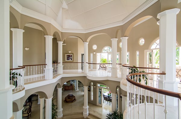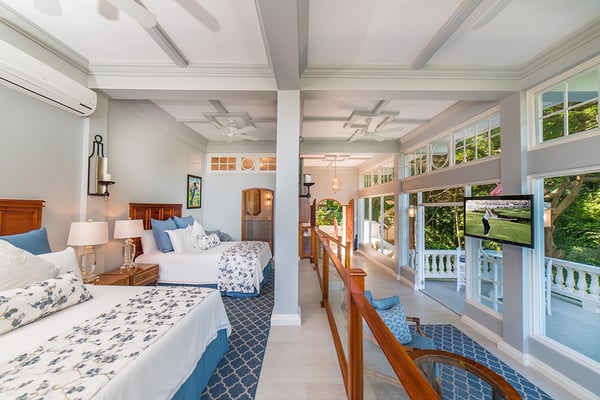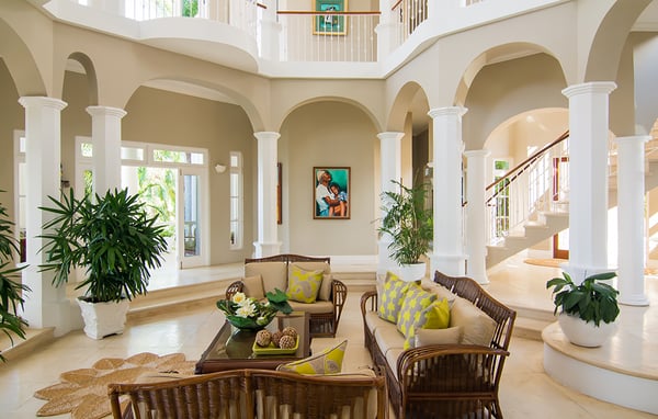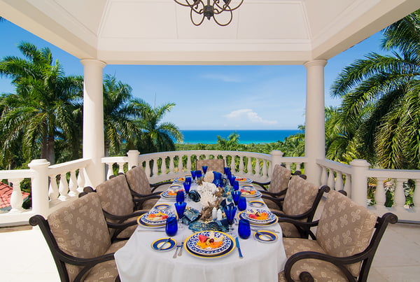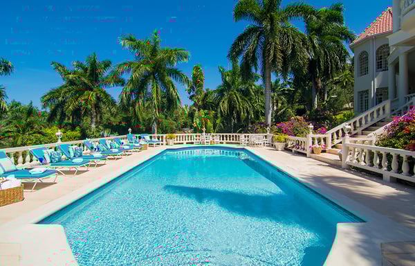 Endless Summer is a turreted mansion with views of the Caribbean Sea. From the porte-cochere, bevelled glass doors open to a dramatic 80-foot columned space. A sweeping white stone staircase curves gracefully from the foyer to a balustrade gallery encircling and overlooking the sunken living room, topped high above by the dome of this home's highest turret. From the gallery, as from all main villa bedrooms, a wall of glass doors opens to the deep wrap-around porch and panoramic vistas over the golf course and the turquoise waters outlining the horizon. Interiors are designed against a clean backdrop of mushroom-coloured walls crisply trimmed in white. Mediterranean-style floors, smooth as marble underfoot, were custom-made on-site, creating an overall palette of soft minimalist colours. On fine Lenox china, dinners are served in the downstairs dining alcove, north veranda, or on the upstairs balcony as the sun sets over the sea. Strategically-placed Bose speakers create surround sound in the villa, verandas, balconies, and pool area. Colourful Montego Bay and the "hip strip" are just 15 minutes away. Half Moon - with a private beach, tennis, fitness center, water sports, food and beverage, and dolphin lagoon - is just five minutes downhill from the villa. It would be an oversight not to mention that this spacious home is ideal for weddings, from a marriage ceremony on the upper balcony (with adequate space for many guests) to a grand reception on the wide veranda and pool terrace, to the dramatic tossing of the bridal bouquet from the upper gallery.
