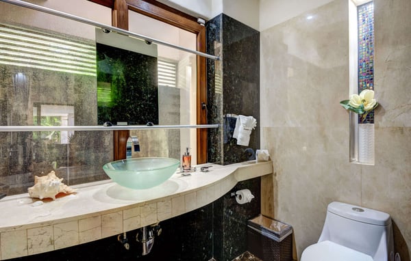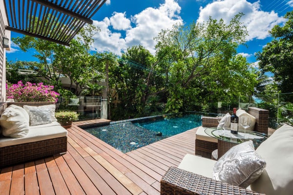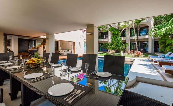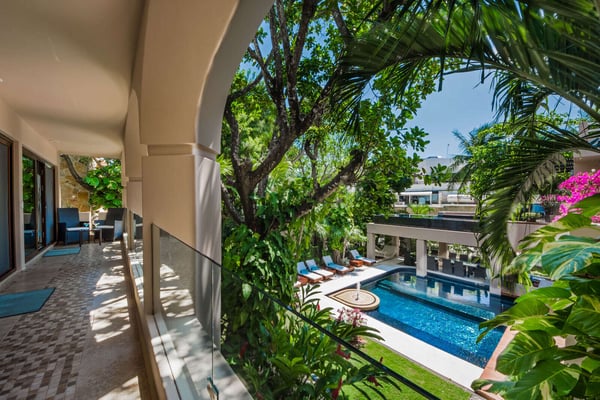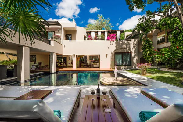Located in very private and quiet gated community of Playacar, Quinta Clara is a magnificent luxurious villa that boasts the utmost privacy and tranquility. In addition to its convenient and hidden location in the heart of Playa del Carmen, Quinta Clara is located just steps from the pristine white sandy beach and blue Caribbean waters. Although not beachfront, the villa maintains the privacy for low-key yet discerning travelers looking to spend their vacation relaxing and getting pampered by the villa staff. Quinta Clara features a primary bedroom with its private infinity pool, and six additional equal suites with their own private entrances. The villa wraps around the ground pool and open garden areas, creating a large private courtyard for the guests to enjoy. In addition to the large exterior spaces, the villa offers a fully equipped kitchen, media room and living area. Quinta Clara is your home away from home and we look forward to welcoming you to this amazing luxury oasis!