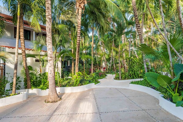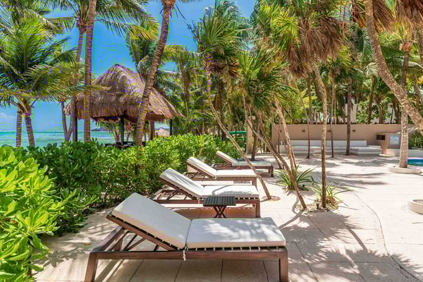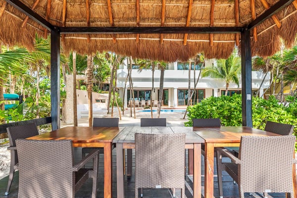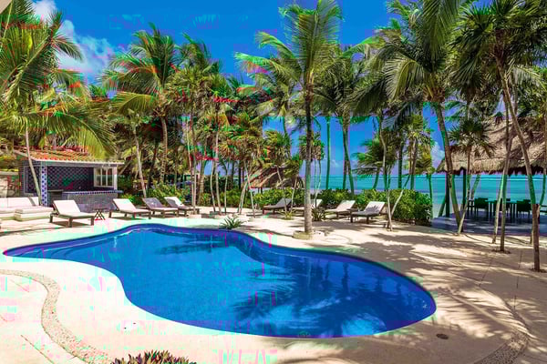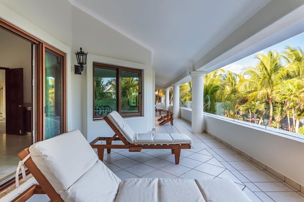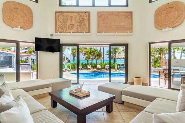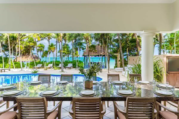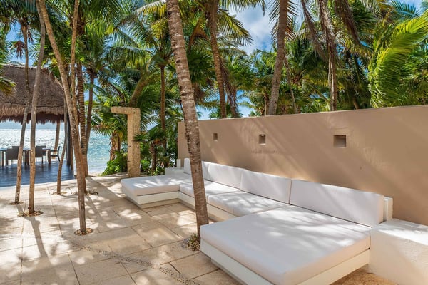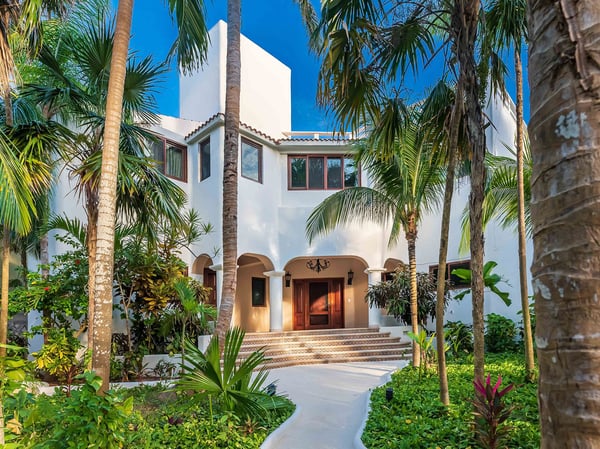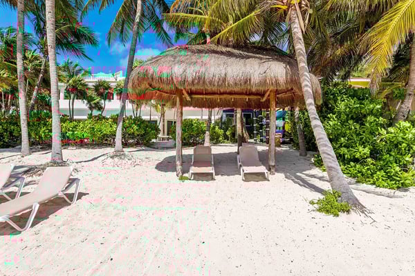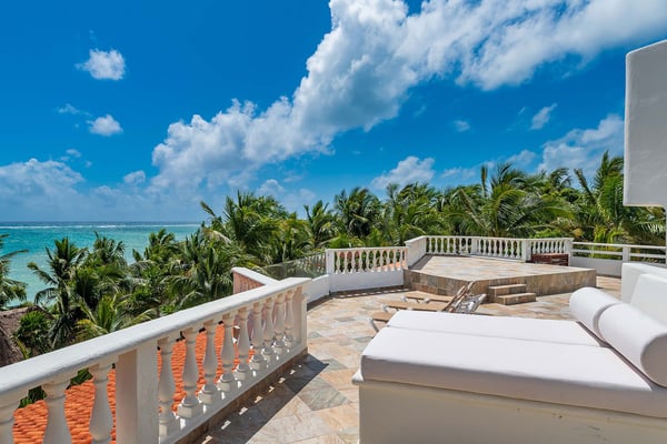 Please note the villa is accessed via an unpaved road, which may vary in condition depending on the season. Whether you would like to take a swim in our 20′ x 45′ swimming pool, or go snorkeling in the beautiful aquamarine waters of the bay, what is most satisfying is that you could relax afterwards under the palapas in our hammocks by the beach or on the lounge chairs by the pool. When it is lunchtime, the chef could prepare a gourmet meal or even a BBQ on our outside kitchenette charcoal grill; it’s located by the pool so that you don’t miss out on the beautiful sun. Later, have a cold refreshing lemonade in the large and beautiful garden at the entrance of Casa Yardena and enjoy the natural view and the fresh air while listening to the chanting birds. There are five artistically designed air-conditioned bedrooms with 14-foot ceilings inside the villa; 2 bedrooms are furnished with 2 queen-size beds, two bedrooms are furnished with 1 king-size bed and 1 bedroom is furnished with 1 queen-size bed. There are also 4 lovely guesthouses located outside; 2 of the guesthouses are furnished with 2 king-size beds and the other 2 guesthouses each have 1 king-size bed. Each of the 9 bedrooms is equipped with ceiling fans and a security safe. Casa Yardena’s magnificent decor was inspired by Mexican architecture and craftsmanship. Every bedroom has its private luxurious marble bathroom and the primary bathroom has a Jacuzzi tub with an incredible view of the Caribbean. Casa Yardena’s observatory rooftop balcony is equipped with an impressive lounge seating area, parasols, bar and a breathtaking view of the bay, the ocean and the vast jungle. The enchantment is complete as the sun romantically sinks beyond the horizon after another fabulous day. Casa Yardena is truly elegant, deliciously secluded and incredibly spacious, a beachfront paradise home that charms its guests with its beauty, comfort and luxurious design, an exclusive property located on 80 feet of the private white sandy beaches of Tankah on Soliman Bay in the Caribbean, the world’s second longest coral reef, home to colorful tropical fish and many varieties of coral and sea plants. The decor of this villa is absolutely outstanding. There are beautiful tile floors, huge windows and sliding glass doors that facilitate views of the ocean from all rooms. There are gracious Spanish archways, fabulous outdoor gardens and immense balconies with ocean views. Its spacious living room offers a 30-foot ceiling, an impressive half circle lounger that can seat its guests together comfortably with a spectacular view of the pool and the beach, which is ideal for relaxing and entertaining. The pool area is also equipped with an outside shower for your comfort. Free internet access is available which makes it ideal for modern vacationers.