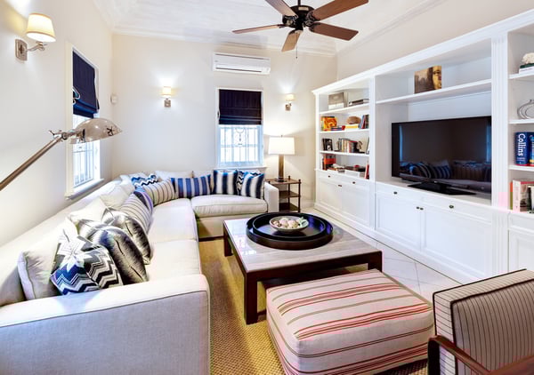 Guests staying within the world famous Sandy Lane Estate will have complimentary access to all Clubhouse facilities including beach chairs, umbrellas and tennis courts. Windward - a luxurious two-story villa on Cooper Hill within Sandy Lane Estate in Barbados with a swimming pool featuring 5 bedrooms suites and 6.5 bathrooms. The villa sits in over 1.5 acres of carefully landscaped grounds featuring “secret” sitting areas with benches for guests to escape and relax in spectacular tropical gardens. The property is private, fully enclosed and gated, with a main front foyer and a side entrance via the courtyard. Within the grounds there is a separate building housing a fully equipped gym, garage and storeroom. On entering Windward through the main entrance foyer, a beautifully designed double staircase finished with a wrought iron railing leads upstairs to the stunning master suite, study and two additional bedrooms. All bedroom suites are air-conditioned with ceiling fans, safes and cable TV. The en suite bathrooms feature marble finishes, double vanities and rain showers, with the exception of the master which includes a tub, large rain shower. There is also a powder room by the main foyer. The main living area is open plan, with French doors extending the length of the room which, when open to the spacious covered veranda, creating an expansive space for combined indoor/outdoor entertaining. Steps from the main veranda lead out to the garden and pool.