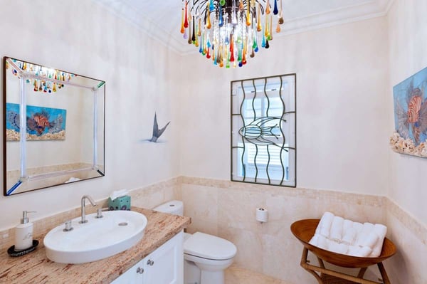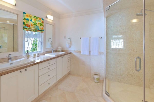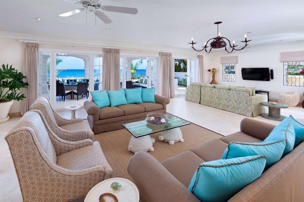 Still Fathoms is a modern and stylish villa located directly on the ocean at Reed's Bay on the West Coast of Barbados. Guests can sunbathe in the beachfront garden or around the plunge pool, or relax on the shaded terrace with a cool drink while still enjoying the Caribbean Sea view. This vacation rental features five bedrooms, which are located on the upper level of the villa, with the master bedroom and bedroom 2 having balconies directly overlooking the garden and ocean. All of the bedrooms are air-conditioned, with ceiling fans and en suite bathrooms. There is also a small TV room on the upper level. The décor of the villa is stylish, featuring cool blues and bright tropical colours with whimsical touches of an "undersea" theme. For relaxation, spend time in the spacious living room and TV area that opens directly onto the covered terrace, offering plenty of comfortable seating as well as an alfresco dining area. The modern kitchen is also fully equipped, as it is only a few steps away. It's no more than a 10-minute drive to either Holetown or Speightstown for shopping, restaurants, and other entertainment. Golf and other activities are available nearby, and water sports can be easily arranged.