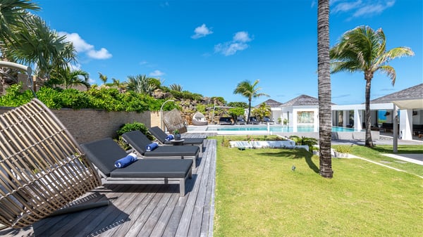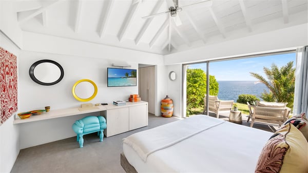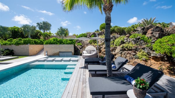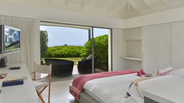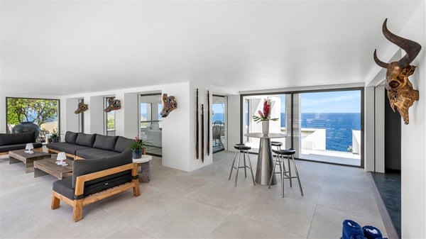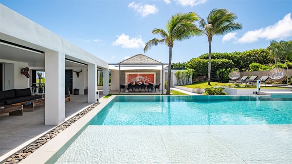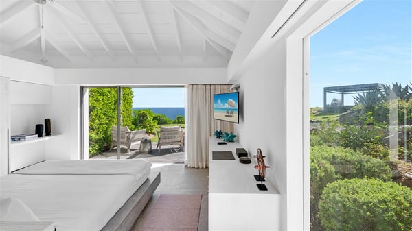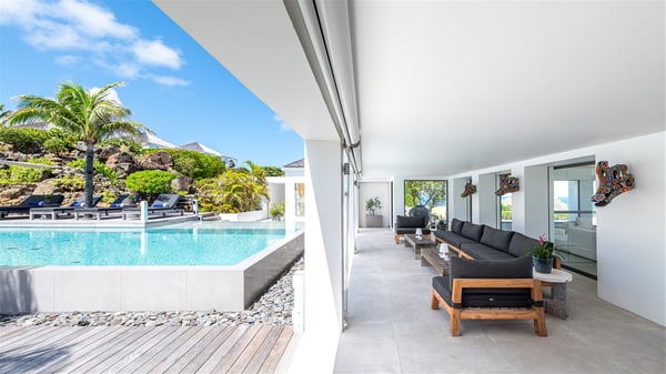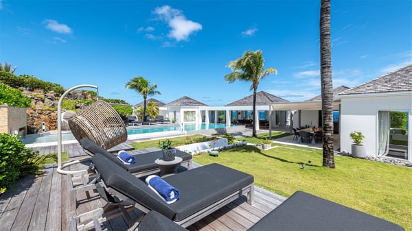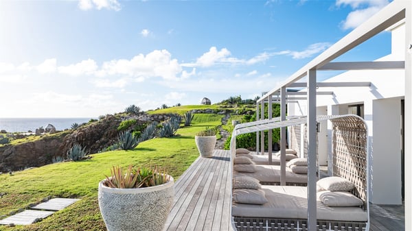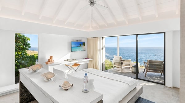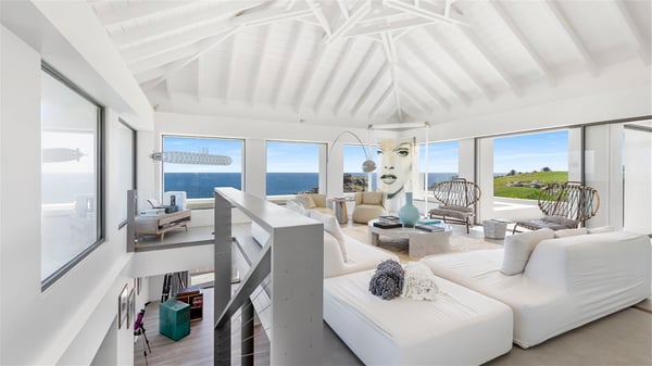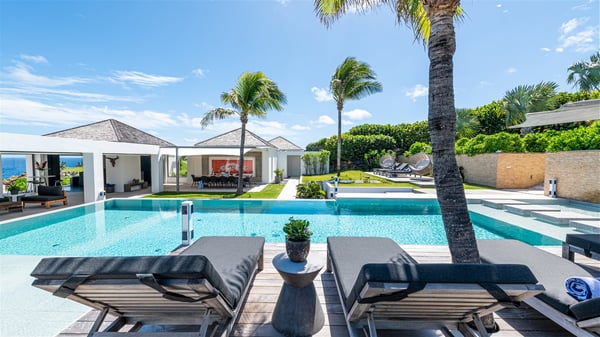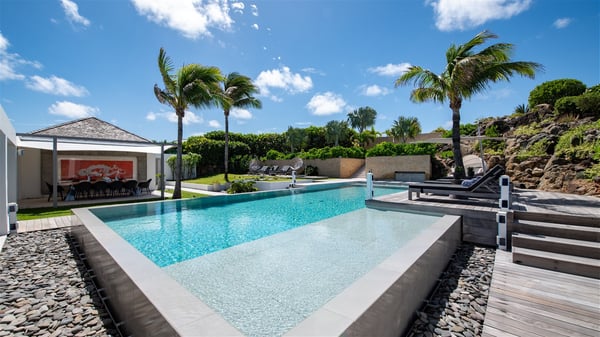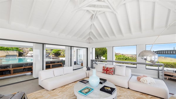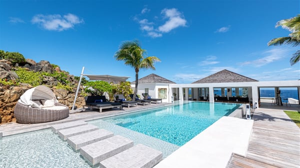 Located in the private estate of Domaine du Levant in Petit-Cul-de-Sac, the luxurious vacation rental Casa Del Mar is one of the most outstanding properties in St. Barths built over a private domain of more than three hectares. Recently renovated, this beautiful property originally consisted of two villas, which now connect in an exclusive and very private luxury complex. Facing the cliff and the ocean, you will love the trade winds and the panoramic view over a breathtaking show. The large modern living room has many windows opening onto the outside, and is furnished with a large white sofa and armchairs around a coffee table, facing the panoramic view over the cliff and the ocean. Decorated with art, this welcoming room is very bright and luminous. Another lounge is located on the lower floor and comes with a cinema projection room for pleasant movie nights in a warm atmosphere. Indoor and outdoor dining rooms welcome you and your guests for delicious meals cooked by the private chef at your disposal during your stay. Outside, you’ll find a beautiful terrace with two sumptuous swimming pools (one of which is heated), loungers shaded by palm trees, as well as a jacuzzi lit at night in a fairy-tale atmosphere. The vegetal environment provides a delightfully fresh touch to the whole. A little further up the cliff, there is a private area furnished with sofas for pleasant relaxing sessions overlooking the ocean. The luxury vacation home Casa Del Mar is composed of six air-conditioned bedrooms with king-size beds and private bathrooms. They are prettily decorated with original colours which provide a pleasant touch for an unforgettable stay in St. Barths. Each bedroom has its own private terrace for relaxing moments in utmost privacy. Two of them are located in a building featuring the smallest swimming pool and a large private lounge. The other four suites are in the second property. A well-equipped fitness room is also available for your stay. The luxury villa Casa Del Mar is a true Caribbean gem, a perfect spot for a fantastic stay in St-Barths.