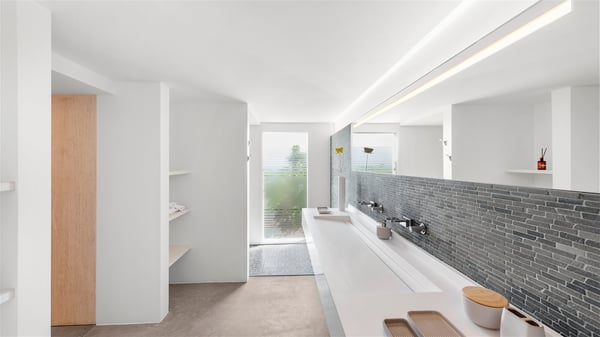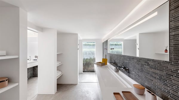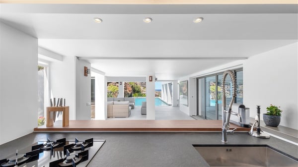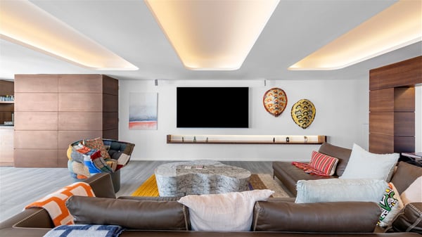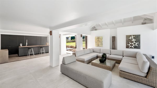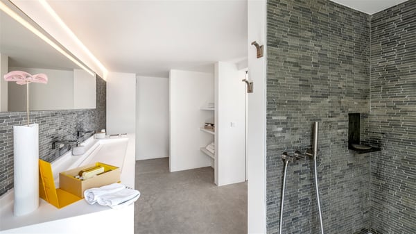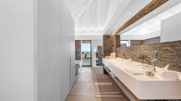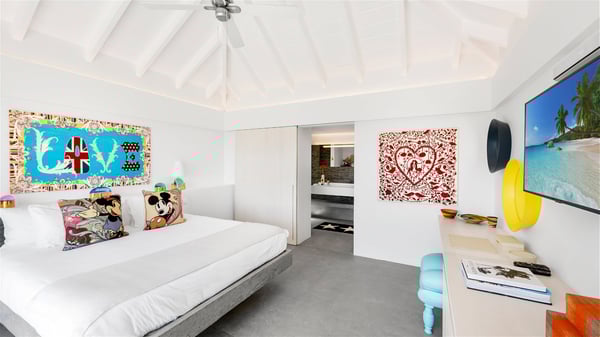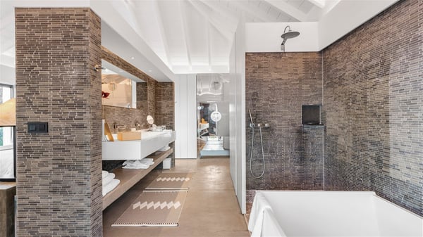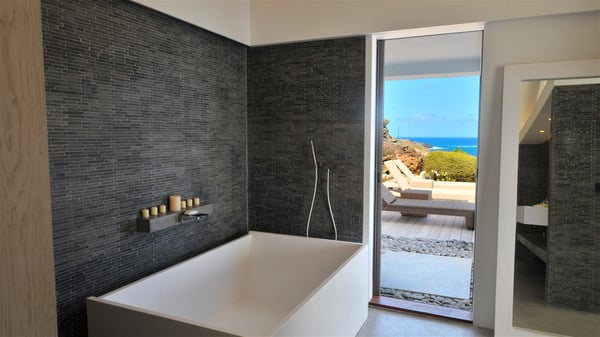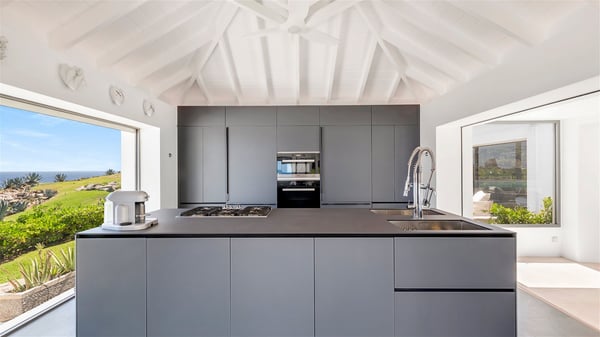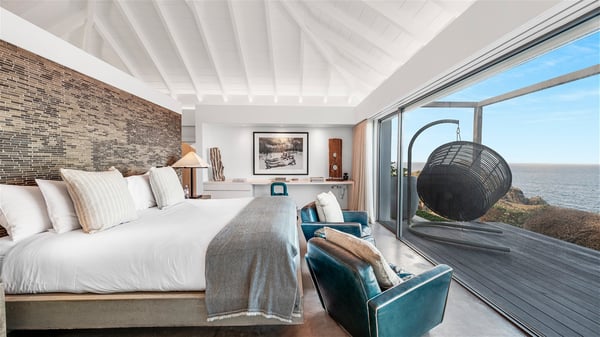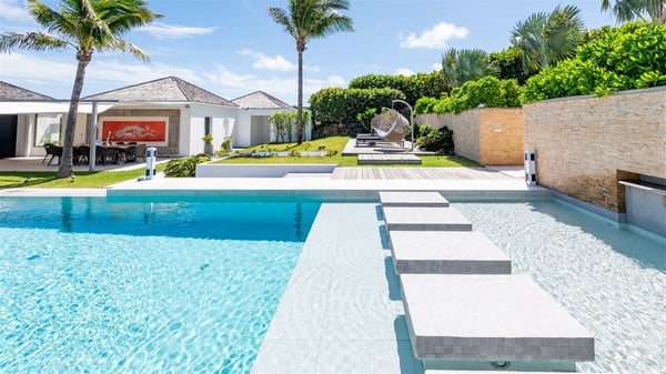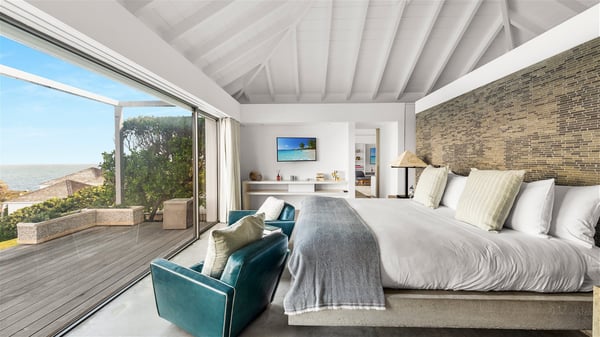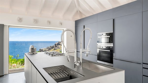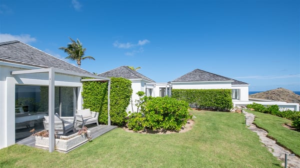 Located in the private estate of Domaine du Levant in Petit-Cul-de-Sac, the luxurious vacation rental Casa Del Mar is one of the most outstanding properties in St. Barths built over a private domain of more than three hectares. Recently renovated, this beautiful property originally consisted of two villas, which now connect in an exclusive and very private luxury complex. Facing the cliff and the ocean, you will love the trade winds and the panoramic view over a breathtaking show. The large modern living room has many windows opening onto the outside, and is furnished with a large white sofa and armchairs around a coffee table, facing the panoramic view over the cliff and the ocean. Decorated with art, this welcoming room is very bright and luminous. Another lounge is located on the lower floor and comes with a cinema projection room for pleasant movie nights in a warm atmosphere. Indoor and outdoor dining rooms welcome you and your guests for delicious meals cooked by the private chef at your disposal during your stay. Outside, you’ll find a beautiful terrace with two sumptuous swimming pools (one of which is heated), loungers shaded by palm trees, as well as a jacuzzi lit at night in a fairy-tale atmosphere. The vegetal environment provides a delightfully fresh touch to the whole. A little further up the cliff, there is a private area furnished with sofas for pleasant relaxing sessions overlooking the ocean. The luxury vacation home Casa Del Mar is composed of six air-conditioned bedrooms with king-size beds and private bathrooms. They are prettily decorated with original colours which provide a pleasant touch for an unforgettable stay in St. Barths. Each bedroom has its own private terrace for relaxing moments in utmost privacy. Two of them are located in a building featuring the smallest swimming pool and a large private lounge. The other four suites are in the second property. A well-equipped fitness room is also available for your stay. The luxury villa Casa Del Mar is a true Caribbean gem, a perfect spot for a fantastic stay in St-Barths.