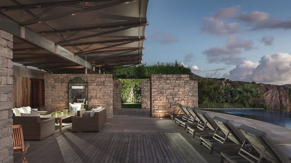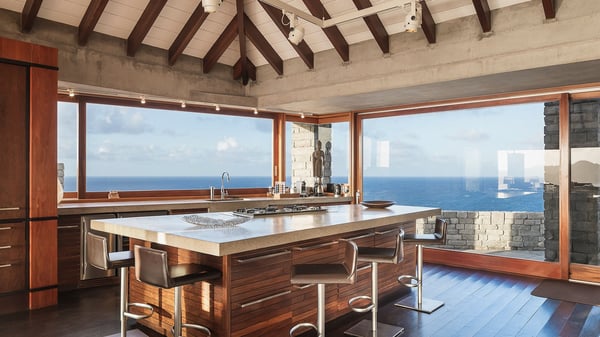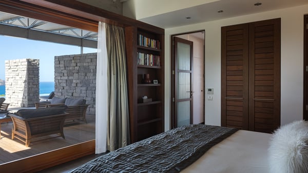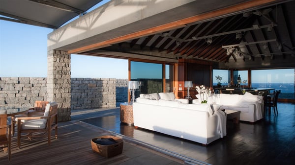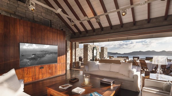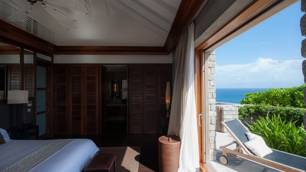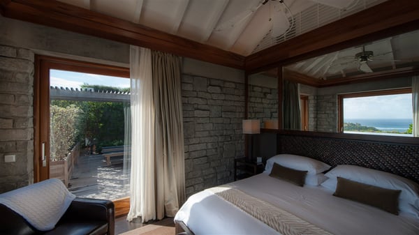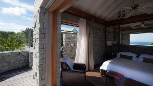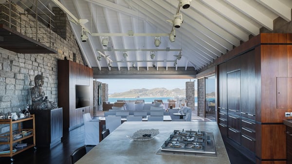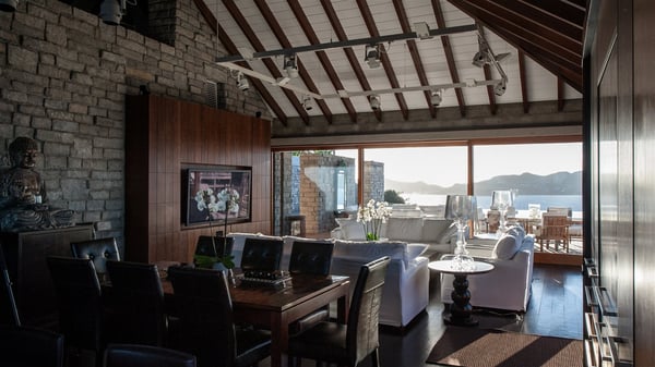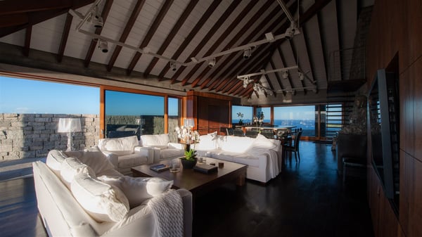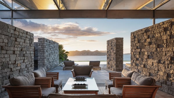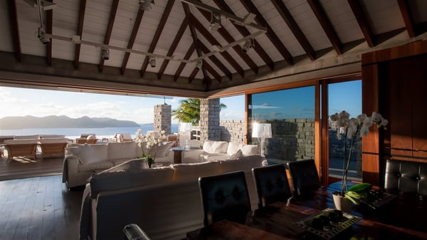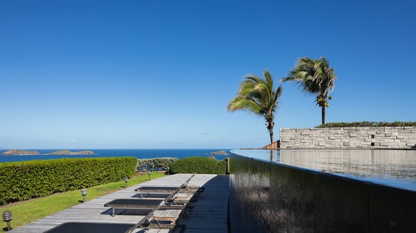 Located in the private domain of Pointe-Milou, the luxurious villa La Danse Des Etoiles faces a spectacular view over the bay of Lorient and the neighbouring island's Turtle and Frégate. The house is a true architectural art influenced by the American Arts & Crafts movement. It was built on two levels facing the panoramic view. Thanks to an east to west exposure, guests enjoy some of the most beautiful sunsets in St. Barths in the evening. Villa La Danse Des Etoiles is composed of a large living room with stones, parquet and woodwork under a beautiful mansard ceiling. Decoration and furnishing are most luxurious and beautiful: there are soft sofas covered with cream-coloured cushions in a cozy atmosphere brought by comfortable fabrics and contemporary lighting. The large windows let the light and sea breeze come into the large living space. The well-equipped and modern kitchen opens onto the indoor dining room with brown and black tones creating a pleasant contrast with the striking brightness of the stone walls. Outside, the magical view is stunning all day long. As soon as the sun rises behind Turtle Island, guests can admire the sun's path over the long, heated infinity swimming pool, and marvel at the fantastic sunset panorama in the evening. It’s the very best place to relax while sipping a drink, or enjoy an alfresco meal under the stars around the large dining table. The glowing sun rays light the covered terrace furnished with deckchairs set up near the superb swimming pool perfect for pleasant swimming sessions (more than 20 meters). The luxurious villa Danse Des Etoiles is composed of five large bedrooms, three of which are located on the living room and pool level, and two on the lower floor, which is furnished as a contemporary loft. All feature king-size beds and en-suite bathrooms. The villa also has a fitness room, an air-conditioned massage room and an outdoor pool table. Ideal for a stay with family or friends, this beautiful vacation rental in St. Barths is a very private home providing utmost comfort and ultimate luxury.