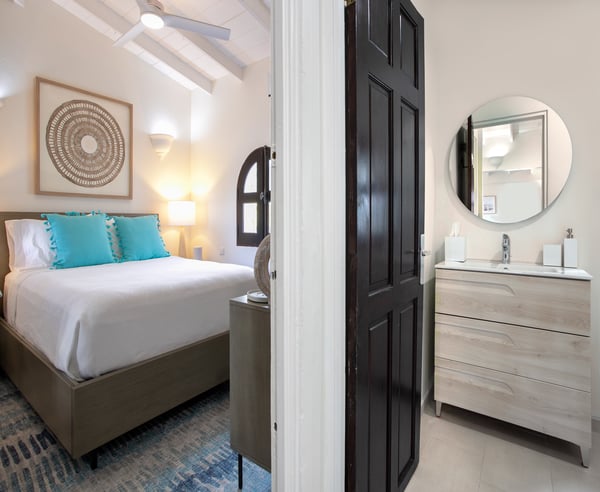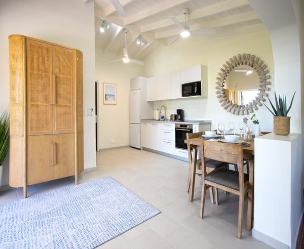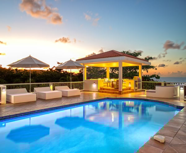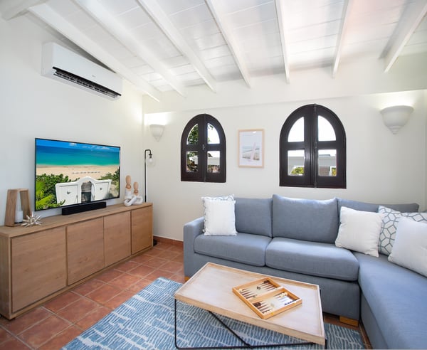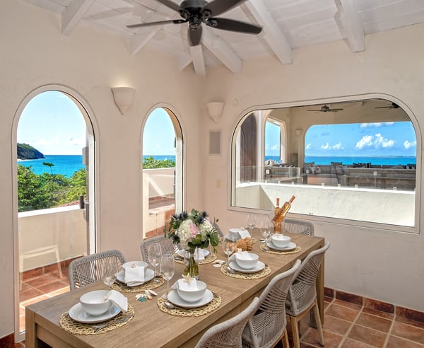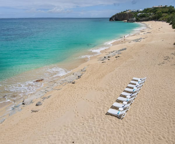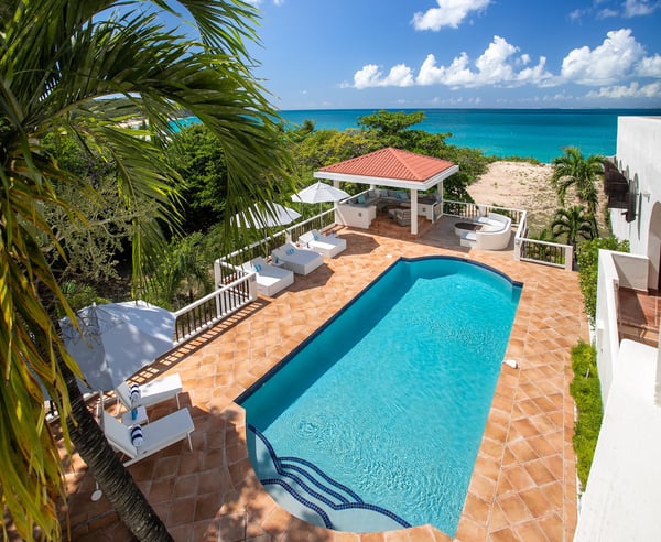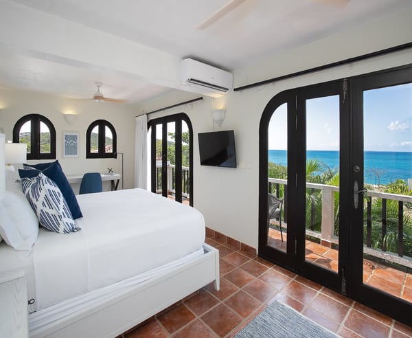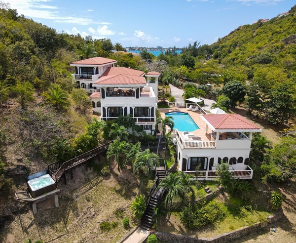 Villa Joie de Vivre is located directly on Baie Rouge beach, one of the most prestigious and serene beaches in French Saint Martin. This exceptionally private villa overlooks four secure acres surrounded by tropical gardens and endless breathtaking views of the ocean. Villa Joie de Vivre is a fully air-conditioned, multi-level villa that has been completely refurbished inside and out for 2024 with a modern coastal aesthetic to complement its Mediterranean architecture. The main living area is comprised of an open-plan living and dining area with a fully-equipped kitchen featuring stainless steel appliances, a gas range, a wine fridge, and a coffee/espresso bar. Step outside to enjoy one of the three covered gazebos for alfresco dining or lounging on one of the multiple plush seating options while enjoying scenic views at every turn of the Caribbean Sea and Anguilla. Ideal for a group of friends or family, you are sure to be happy with whichever of the king-size bedrooms you select. Each has a balcony, walk-in closets, safes, and its own en suite bathroom with double vanities and oversized showers. Wake up refreshed in the villa’s Heavenly® Beds, complete with luxurious linens and pillows. One bedroom also features a sleeper sofa and two rooms have desks. All bedrooms and bathrooms have 110v/220v 60Hz outlets with USB connections. Renovated in 2025, the newly added fourth bedroom is a beautifully remodelled 500-square-foot cottage, located just 150 yards from the main house. This standalone guest house has been completely transformed in the same contemporary style as the villa. Inside, you'll find a queen-size bed, an en-suite bathroom, a kitchen equipped with modern appliances, and a cozy living room with a sofa bed—ideal for a couple and a small child. Adding to its charm, the front porch offers stunning ocean views, while the back sundeck overlooks the tranquil waters of Simpson Bay, creating the perfect setting to relax and unwind. One of the main attractions of Villa Joie de Vivre is its direct access to the very peaceful and secluded Baie Rouge beach. The villa is perfect for those who want to be right on the beach while maintaining their privacy. Guests can snorkel in the calm waters or sunbathe on the provided chaise lounges, then slip back through their private locked gate to relax in the hot tub. The property’s other centerpiece is the pool deck with its 18’ x 35’ heated saltwater pool, lined by double sunbeds, a shaded gazebo lounge, BBQ area with a fridge and bathroom. Guests can stay connected with the Villa Joie de Vivre’s interior and exterior high-speed wireless internet, relax to music via the zoned Sonos speaker system throughout, or binge their favorite show on smart TVs provided in the kitchen, living room, and all bedrooms. Unwind by playing one of the well stocked board games or singing a favorite song on the portable karaoke machine. Baby monitors and an AED defibrillator are also located onsite. There are many ways to experience the “joy of living” at Villa Joie de Vivre. Skip the airport or ferry and have a helicopter pick you up directly in the backyard to fly you within minutes to St. Barths for lunch or Anguilla for a round of golf. The expansive grounds make it an ideal setting to accommodate a glamorous wedding reception after you walk down the aisle on the beach. Or perhaps you are a land-lover seeking a break from a boat charter, where you can easily tender back and forth from your yacht via the beach.