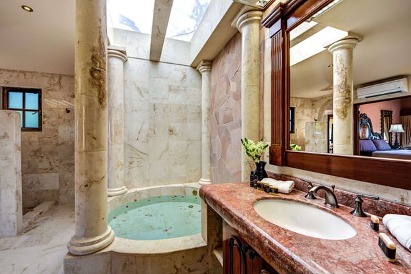Indulge your senses with an exclusive getaway to Casa GiGi, Playa del Carmen. Whether you are enjoying the lush gardens or admiring the sunset views from the top of the watchtower, this beautiful castle-esque villa will make you and the entire family feel like royalty in the Caribbean. Built six years ago, Casa GiGi stands out in the Riviera Maya due to its unique architecture. Enjoy breakfast in the shade of the courtyard, surrounded by plants and flowers, or wake up to the Caribbean Sea views from the royal king bed in the master bedroom. Show your competitive side with a game of shuffleboard or just sit back and relax in the 1st-floor plunge pool, overlooking white sandy beaches and shallow turquoise water. The villa offers four en suite bedrooms in total, with three sharing stunning views across the sea. Downstairs you will find a fully equipped kitchen. The bustling courtyard provides the centrepiece of the house while the Watchtower makes for an experience like no other within Playa del Carmen. Make sure to head up there as the sun sets and the sky turns a magical pink. Located in the exclusive gated community of Playacar Phase 1, Casa GiGi is a pleasant stroll from the buoyant Quinta Avenida, known for its charming restaurants, trendy bars, and diverse range of shops. While you will also find plenty of activities in the neighborhood like enjoying a rally of tennis overlooking the Mayan ruins or learning to kitesurf on the distinguished Playacar beach. However, if you desire to spend your time at Casa GiGi, one thing is for sure... You will feel like royalty.