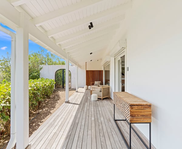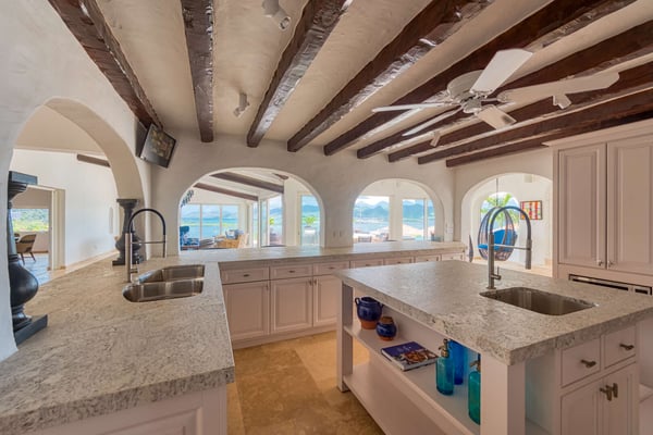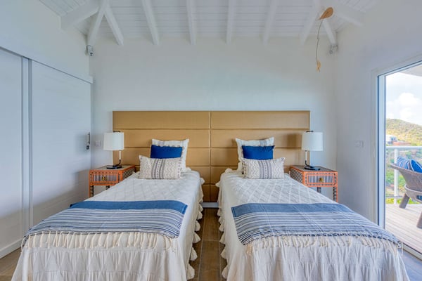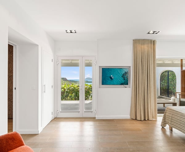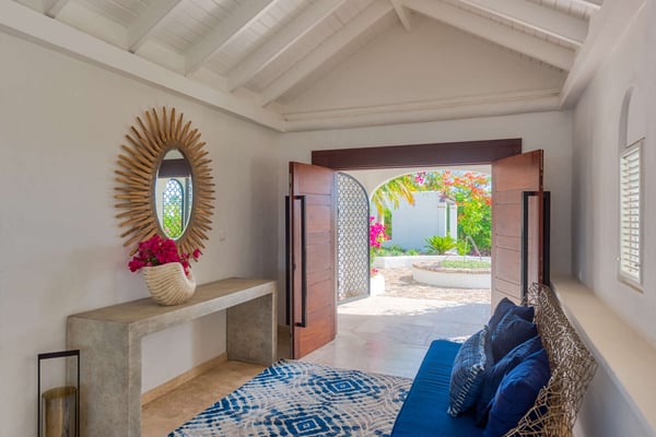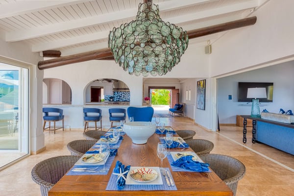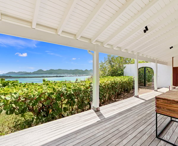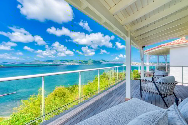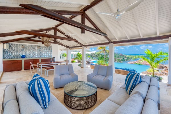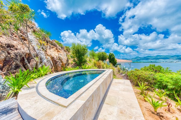 The stunning Villa Le Rocher is a five-bedroom jewel, it sits in the hills of the Terres Basses area of St. Martin and offers visitors stunning views of Simpson Bay as well as uninterrupted views of both the Atlantic and Caribbean. Tucked in a gated community, this villa epitomizes luxury design with its expansive natural stone terrace, classic terracotta tile roofing, lush gardens, and stylish indoor and outdoor living spaces. The focal point of the property is its infinity-edge pool that offers natural stone accents and a waterfall feature. The terrace abounds with comfortable sitting areas, full sun beds, and al fresco dining spots. Step beneath the shelter of the portico to discover an outdoor dining area, barbecue, and lounge facing both the pool and Zen garden. An elevated lookout on a knoll above the villa offers unparalleled panoramic views, as does the eight-person hot tub nestled in the rocky hillside below. Head inside, and you enjoy the same range of impressive spaces, including a formal lounge and dining room, an enormous gourmet kitchen with island and professional-grade appliances, and an additional large living space with a game table and large-screen TV. The primary suite is adjacent to the pool and offers magnificent sunrise views, luxurious furnishings, and indoor and outdoor showers. Visitors are utterly charmed by the stone tunnel that leads to three guest cottages featuring king beds, indoor and outdoor showers, covered decks, and gorgeous views of the lagoon. The secluded yoga studio with a shower doubles as a private massage room. Ideal for a group or family holiday, the Villa Le Rocher is a must for those seeking a refreshing island escape.