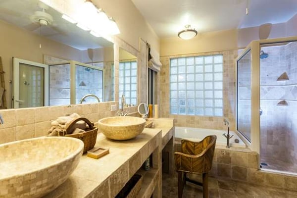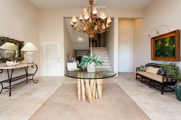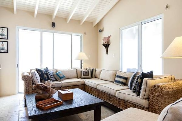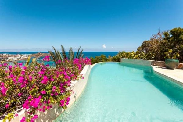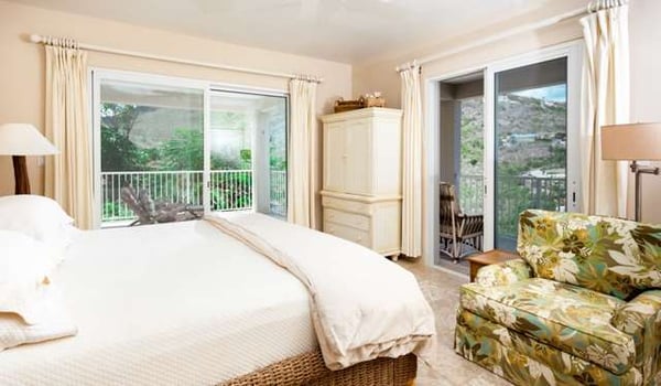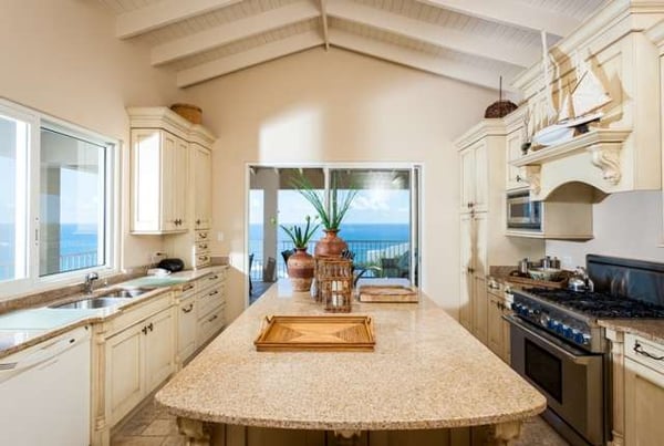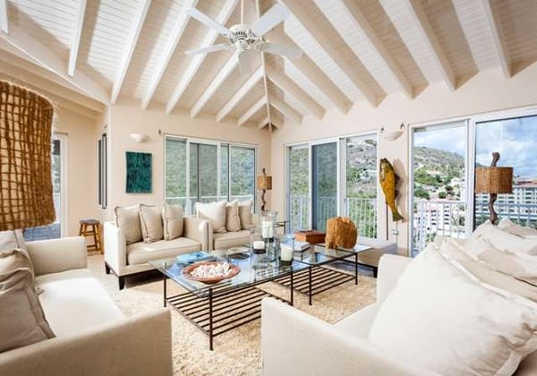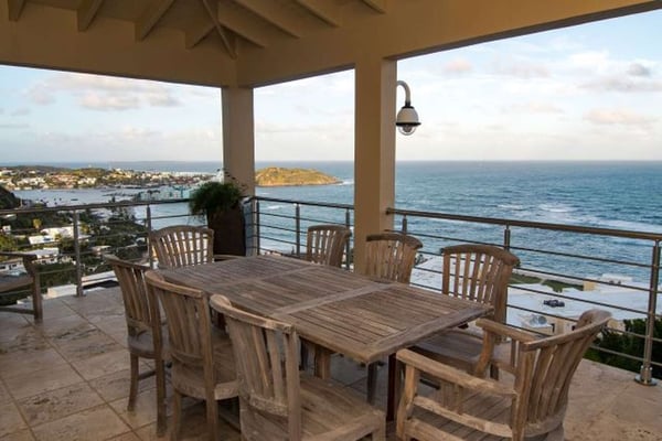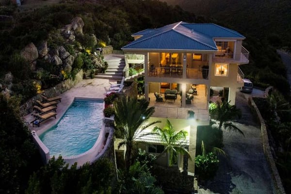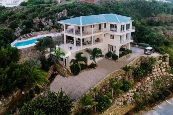 Villa Bougainvillea, located in Dawn Beach Estates, is a very stylish villa with fabulous views overlooking Dawn Beach & St. Barths. Every attention to detail has been made in this new deluxe villa. The property is surrounded by natural rock walls. The 3-story villa offers six bedrooms and six bathrooms. The primary bedroom has a king size bed and full bathroom with a jacuzzi and a shower. The second bedroom has a king size bed and a bathroom with shower. The third and fourth bedrooms have two twin beds in each room and attached bathrooms with a shower. The fifth bedroom is a separate loft area with a kitchenette located on the lower level with its own private entrance. The sixth bedroom is part of the apartment with the fifth bedroom and kitchenette. All bedrooms are air-conditioned. The swimming pool with its multi-level decks offers spectacular ocean views and is equipped with a gas grill. Enjoy the stunning views of Dawn Beach and the wonderful breezes. The living room is spacious with top-of-the-line décor done in soft neutral tones and the dining area accommodates 10 persons. The fully equipped gourmet-style kitchen has granite countertops and stainless steel appliances. In addition, this villa offers an elevator, gym and steam room. At Villa Bougainvillea, you'll have a truly memorable experience, watch the spectacular sunrise, enjoy the panoramic views while sipping a cocktail on the spacious decks, have a bar-b-que under the stars, take a dip in the pool while overlooking the ocean, and stroll down to Dawn Beach - one of the best snorkeling beaches on the island.