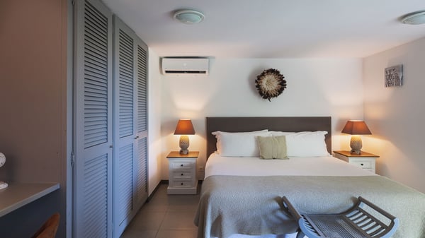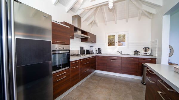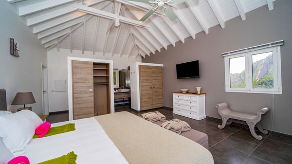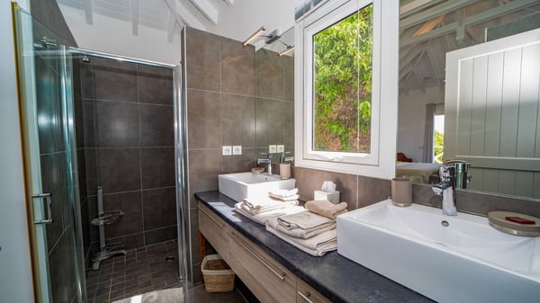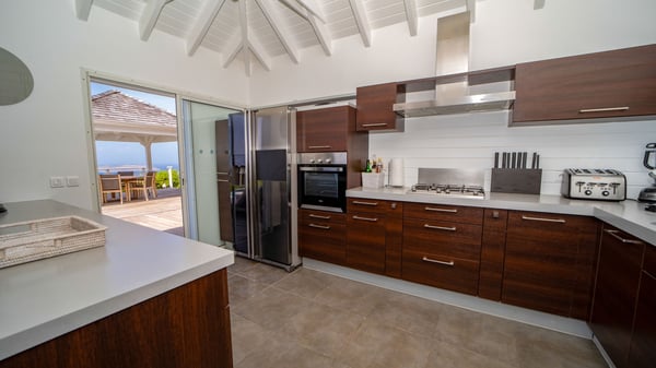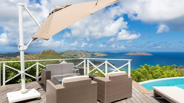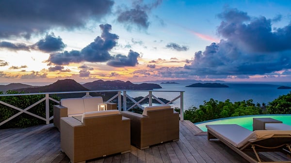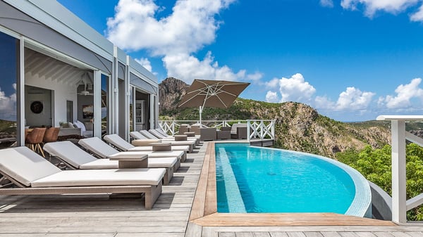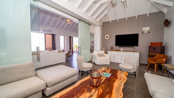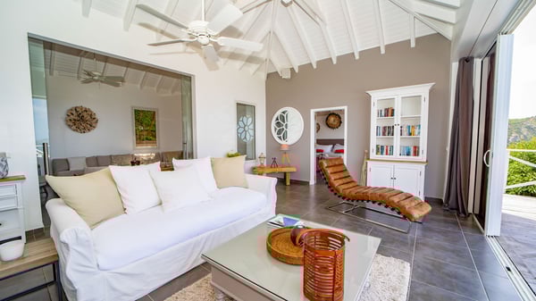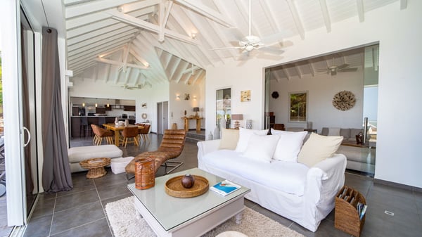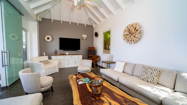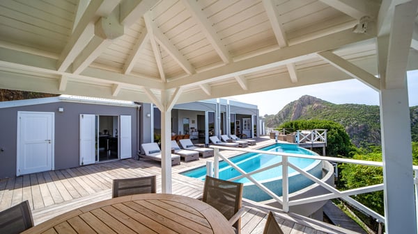 Nestled on a hillside in the quiet Petite Saline neighbourhood, the vacation villa Azetes is a charming property with breathtaking views over Lorient Bay, the islands of St. Martin and Anguilla, and the glorious sunsets. This four-bedroom luxurious rental is the perfect place for an idyllic stay with family or friends in Saint Barths. Designed in a very contemporary style, villa Azetes is well decorated in a refined and warm atmosphere. The large living room is composed of a modern lounge with sofas and armchairs with wood hints. A second living room, which can be closed and air-conditioned, is located at the back in a very private atmosphere, a perfect place for movie nights. The kitchen is well equipped for meals preparation to be enjoyed around the large table that can accommodate up to ten guests under the high vaulted ceiling. With beige and caramel-tone colours, woven fibres and soft cushions, the open-plan living room of villa Azetes is truly dreamy, facing the breathtaking view over the tropical vegetation, the ocean and the neighbouring islands. The front terrace stretches across the width of the villa on a wooden deck featuring a splendid half-moon-shaped heated infinity swimming pool. Deck chairs are set up along the pool facing the ocean view, and a lovely garden lounge is at one end of the deck under a parasol. On the other side of the pool, there is a lovely gazebo with an outdoor dining room for eight guests for alfresco dinners cooked on the barbecue in the mild Caribbean air. All around Villa Azetes, the tropical garden provides a pleasant vegetal touch to the enchanting scenery. The luxurious villa Azetes has four air-conditioned bedrooms with private bathrooms. Two of them are located on the main level and open onto a splendid ocean view. The other two are on the lower level, one of which is slightly smaller, perfect for staff or for a teenager. All are furnished with king-size beds that can be converted into twin beds in a refined and cozy atmosphere. Luxurious and comfortable, villa Azetes is the haven of peace you're looking for for your next stay in St. Barths.