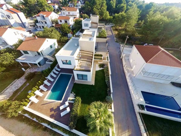 Modern beachfront rental villa Trogir Twins 1 is situated near the ancient city of Split and the town of Trogir both with its UNESCO world heritage sites. Since the island Ciovo is a kind of extension of the city of Trogir, it offers a lot of possibilities for vacation, recreation and swimming, as well as numerous historical monuments. The Mediterranean vegetation, archipelago with small picturesque little islands, mild climate and most beautiful beaches in hidden bays, will certainly make your stay unforgettable. Luxury five-star Villa Trogir Twins 1 with outdoor and indoor swimming pool is located first line by the sea, in Okrug Gornji only 5m from beautiful sea and pebble beach. This elegant and modern villa was built in 2015 and it is a combination of elegance and luxury amenities you would expect from a 5-star villa. Within the exquisite and elegant exterior of this villa, you will find a very beautiful and functional interior that is ideal for enjoying a vacation with family or friends. This marvellous 6-bedroom villa has a modern and open interior which provides our guests with comfort, privacy and a sense of being in a small, luxurious oasis. The property itself covers 600 m², while the villa is divided into the basement, ground, first floor and high attic. The 300m² of the villa provides comfort, spaciousness and style in every room: 5 en-suite double bedrooms, 1 en-suite single room, 1 extra bathroom, a fully equipped kitchen – a dining room and a living room. Villa Trogir Twins 1 is great accommodation for 11 people. The basement of Villa Trogir Twins 1 is designed as a recreation area with a gym, sauna, an indoor swimming pool (20m²) and an entertainment room with a billiard. The ground floor consists of an elegant living room framed by large glass walls, which can also be opened as an additional exit to the outdoor terrace. There is also a dining area with a dining table and a fully equipped kitchen. The first floor and high attic are designed as a sleeping area with 5 double bedrooms and 1 single bedroom with en suite bathrooms. The master bedroom has access to the spacious terrace with an outdoor table and chairs, a sun lounger and a breathtaking sea view. Spacious terraces and balconies with outdoor tables and chairs, sun loungers and a breathtaking sea view complete the feeling of being in a small paradise. The complete outdoor area of this villa is just as impressive as its stylish interior. There is 35m² big outdoor swimming pool, loungers, garden furniture and an outdoor fireplace which give a distinctive Mediterranean charm to the entire estate. The villa offers 4 parking spots for the guests and a buoy for boats is available at request. Croatia Luxury Villas Trogir Twins 1 and Trogir Twins 2 are located next to each other and offer the possibility of accommodating larger groups for weddings, team buildings, family gatherings, and more.