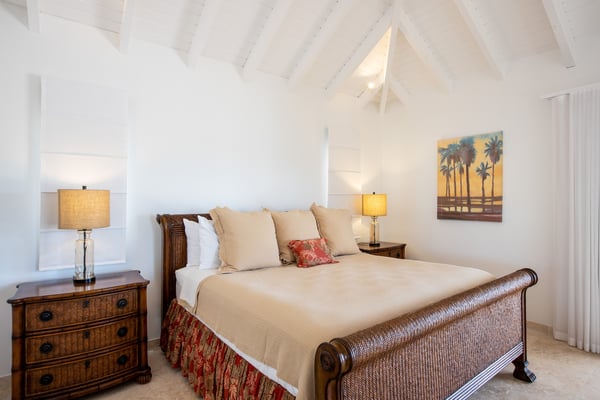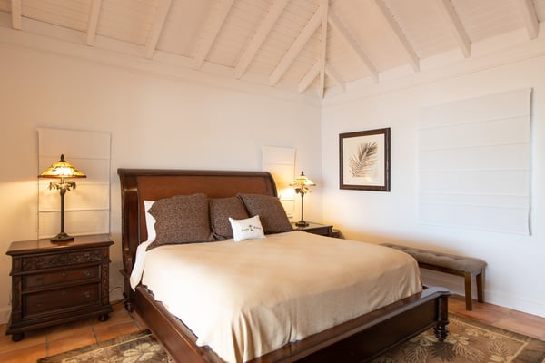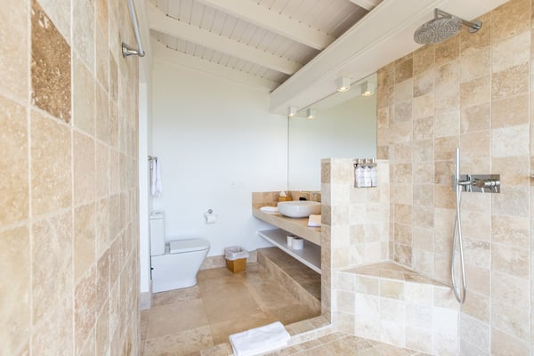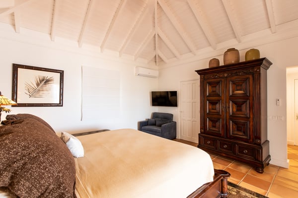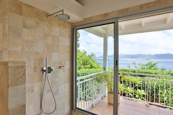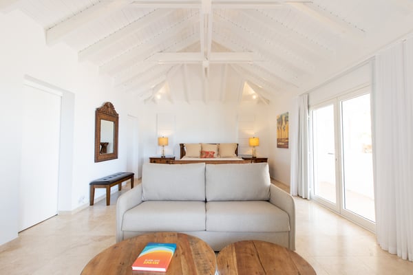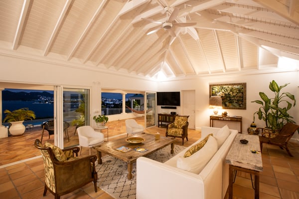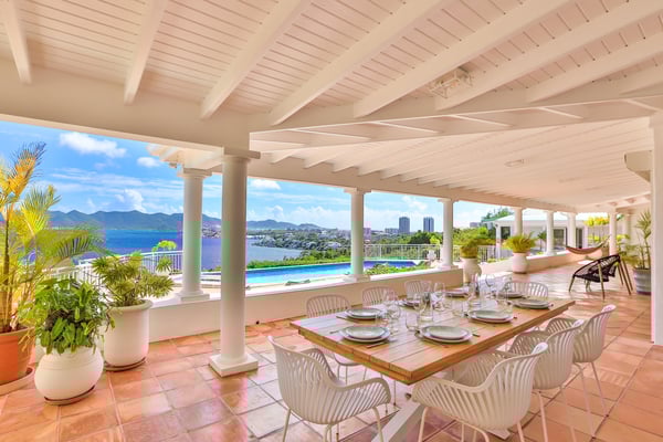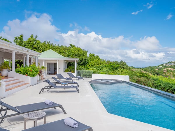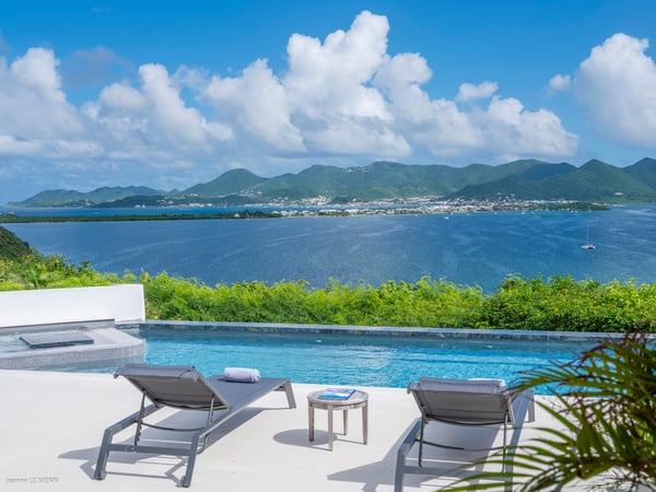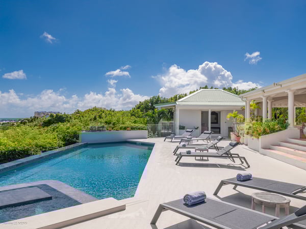 Welcome to Fields of Ambrosia, a stunning 4-bedroom luxury villa located in the exclusive area of Terres Basses on the island of St. Martin. This cliff-side villa offers amazing views of the Simpson Lagoon and the gorgeous verdant mountains of St. Martin. Discover a unique location for your home away from home. The soul of this St Martin villa is that of a West Indies plantation house. It features beautiful Tommy Bahama’s furniture modernized with contemporary interior decor selected by Bleu de Perse, home design specialists. This charming luxury villa perched on a hillside, boasts breathtaking views from every living area and bedrooms. It houses four spacious bedrooms, three kings and a twin bedroom. Each bedroom has its own ensuite bathroom. The indoor living quarters commune effortlessly with the ample and elegantly furnished terrace that is the preamble to the stunning outdoor swimming pool. The pool has an inset small pool with a table, allowing guests to spend a carefree day as they soak in the warm Caribbean sun while enjoying the views from its gorgeous setting.