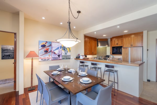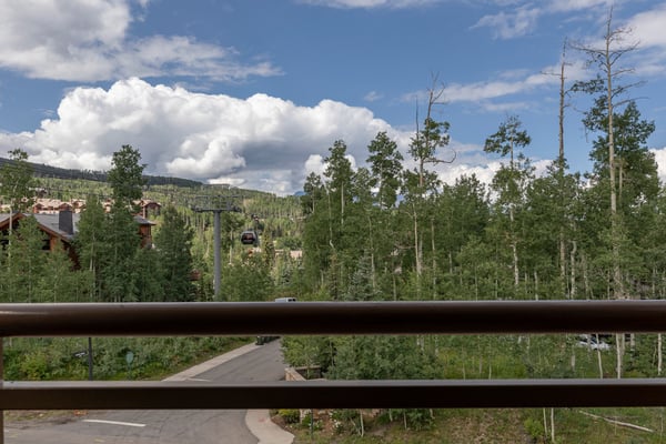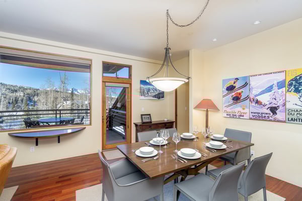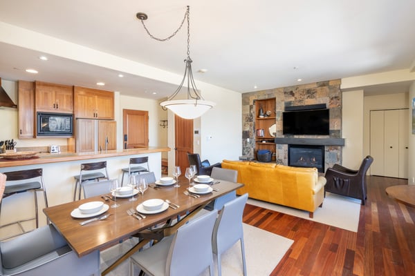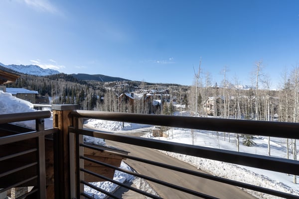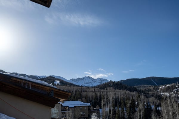 When your idea of a picture-perfect Rocky Mountain holiday includes being right in the center of nearly everything, then this two-bedroom Mountain Village condominium was designed just for you. Located in the elegant Granita building, you'll be perched right at the top of the Meadows ski run and chair lift 1. You'll also enjoy idyllic views of the mountain ridge, a dedicated parking space, three sunny patio spaces, and a cozy gas fireplace. You'll also be steps away from the dining, shopping, exciting live music, and nightlife in the village core. Located on the third floor, the living and dining areas are wide open to one another. A large picture window is flanked by two glass doors that lead outside to the terrace and allow for magnificent mountain views from nearly every spot in the room. A leather sofa and two armchairs surround the slate-tiled fireplace and the large flatscreen HDTV, creating a comfy space to kick back and unwind with a great movie or your favourite TV show. Warmed wood plank flooring leads into the dining area, where you'll find a formal table with seating for six, and three more stool seats at the peninsula bar. The kitchen is small but well-designed, with natural wood cabinets and gleaming countertops. The refrigerator is panelled to match the cabinets, and the gas range sits kitty-cornered and is finished with a matching backsplash and a premier vent hood. The kitchen also includes a microwave, a dishwasher, and a deluxe coffeemaker for fueling up before hitting the slopes. In the premier bedroom suite, a king-size bed sits underneath a gorgeous, wood-detailed vaulted ceiling and faces glass doors that lead out to the private terrace. This relaxing room also includes an armchair, HDTV with Apple TV, desk space, and an ensuite bathroom with a step-in shower. The second bedroom also boasts a gorgeous, private balcony, and has a split king bed, which can be converted to two twins, HDTV with Apple TV, reading lamps, and a side chair. A second full bathroom has a tub/shower combo. The location of this luxurious home is tough to top. From your private balcony, you can sip your morning coffee while gazing out at the mountain views or the bustling village below. There's also a barbecue on the balcony for grilling burgers or steaks for dinner. When you want to hit the slopes or maybe head out for a hike, the Meadows ski run and numerous hiking trails are right outside your door. You'll also be mere steps away from the village core restaurants, cafes, shops, and pubs. TMV BL# 005750