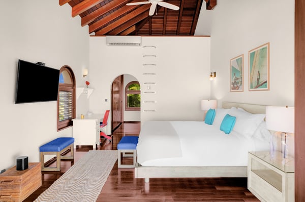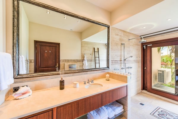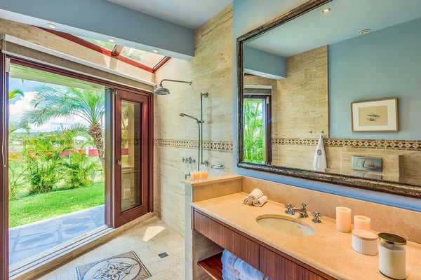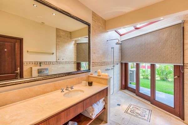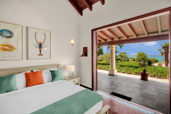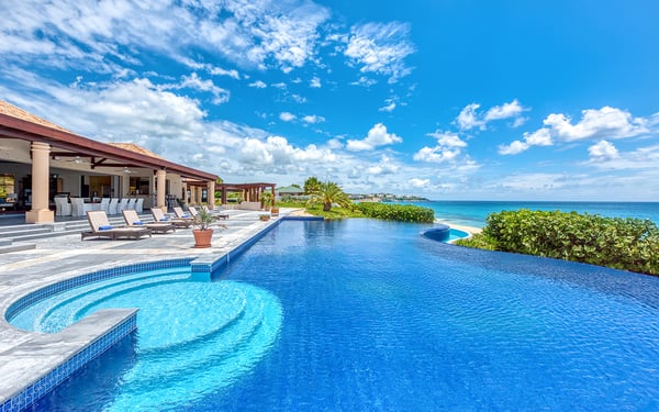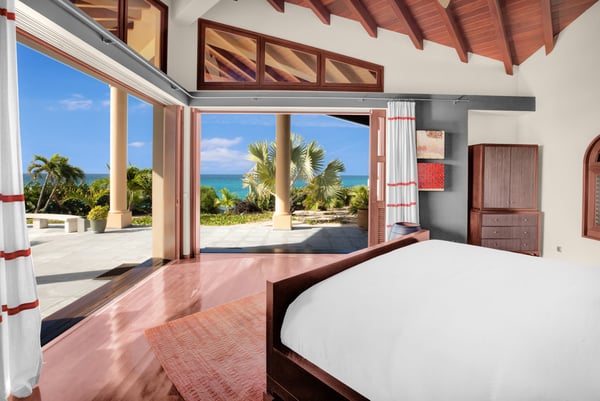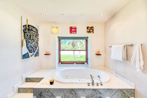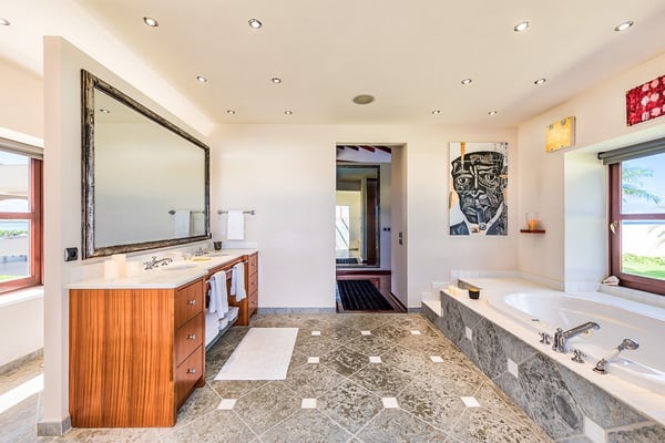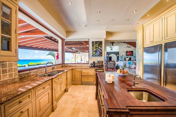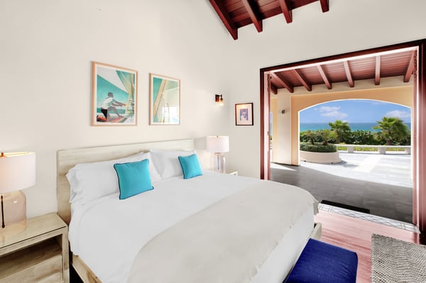 As you step through the front door of Villa Casa de la Playa, you'll be greeted by a breathtaking view of the pool and the blue of the Caribbean Sea beyond. The open and spacious layout of the villa allows for seamless indoor-outdoor living, immersing you in the beauty of the surroundings. The large gourmet kitchen, attached to the Great Room, is a chef's dream. Guests may choose to enjoy the villa with or without chef service, depending on their preference. The in-house Chef prepares three meals per day: breakfast, lunch, and dinner - cost of food and beverages additional. The five bedrooms in Villa Casa de la Playa are strategically laid out to offer beach views and privacy. Each bedroom has its own private access under the covered terrace, allowing you to enjoy the stunning scenery at any time. The primary bedroom, located separately from the Great Room, features an en-suite bathroom with a soaking tub and a spacious rain shower, creating a tranquil oasis for relaxation. The other four bedrooms are split into two sets of two on either side of the Great Room. They offer similar amenities and each has a large en-suite bathroom with views of the garden. This setup is perfect for families. Villa Casa de la Playa is designed to provide both luxury and comfort, making it an ideal choice for families or groups of friends. Enjoy the stunning views, indulge in gourmet meals, and relax in the privacy of your own en-suite bedroom. Your stay in Villa Casa de la Playa will be an unforgettable experience in the beautiful island of St. Martin.