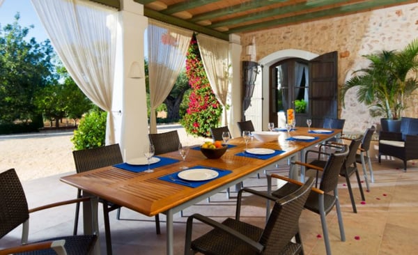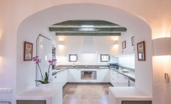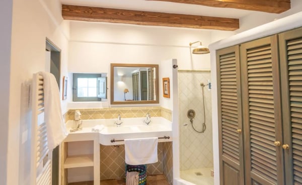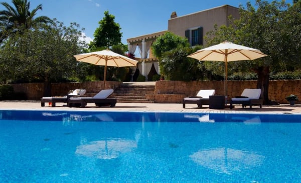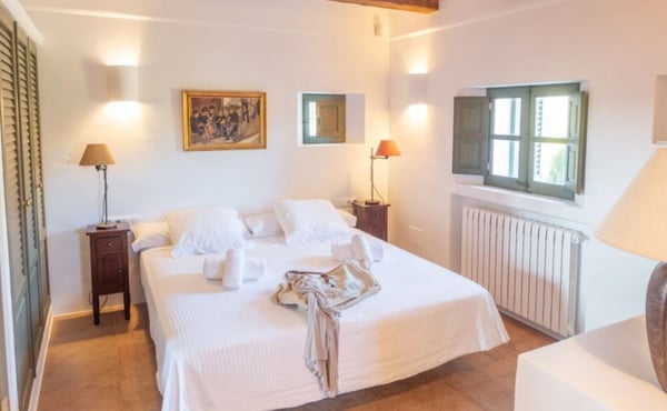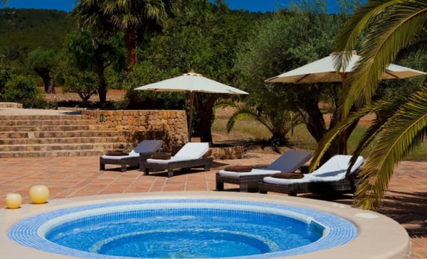 Surrounded by extensive private grounds this newly built, traditional-style villa with pool and jacuzzi is perfect for a relaxing holiday in the green heart of Ibiza, close to St Eulalia. The property boasts 720 square metres of living space built within a 40,000 square metre plot with beautiful countryside views of the mountains in the Santa Eulalia area. Private grounds comprising wonderful gardens and orchards. You will find a swimming pool with Roman-style steps, an outdoor jacuzzi, sunbathing area, a covered terrace with lounge facilities on the first floor. a fully equipped pool house, private garage and ample parking within the property. Please note: the service rooms are only to be used by staff members working on the property or children up to 12 years.