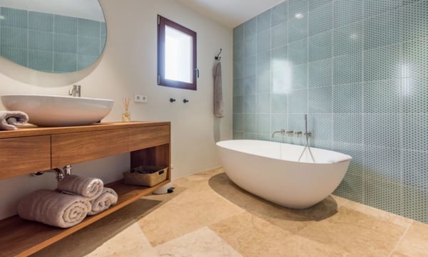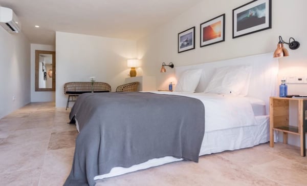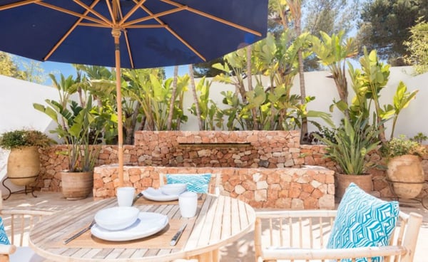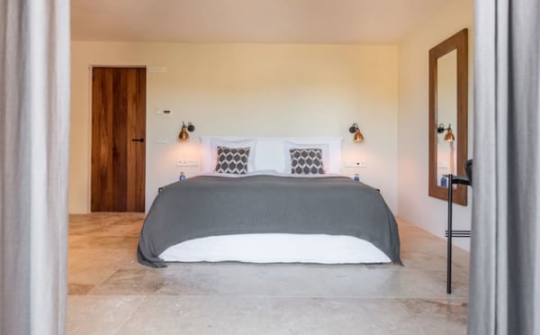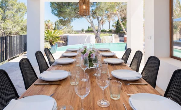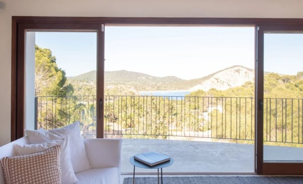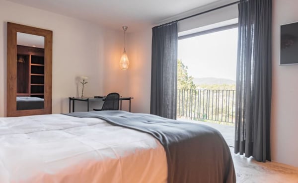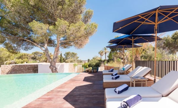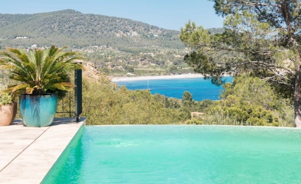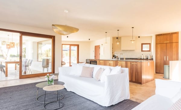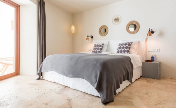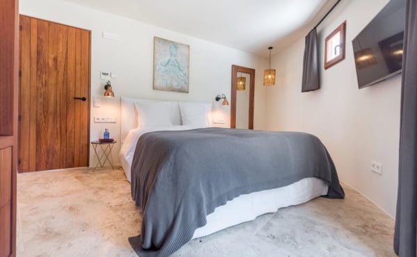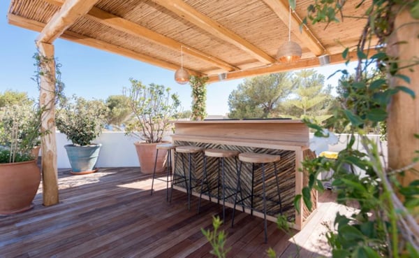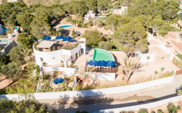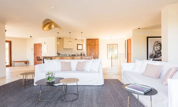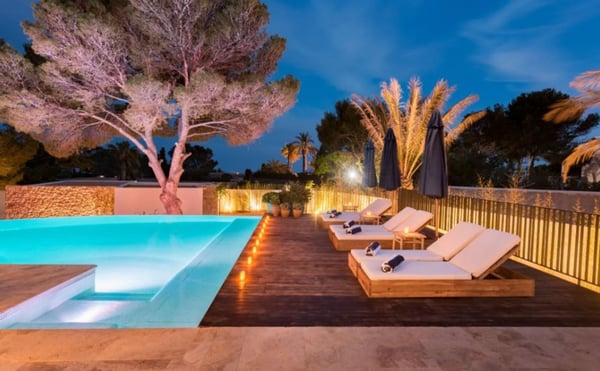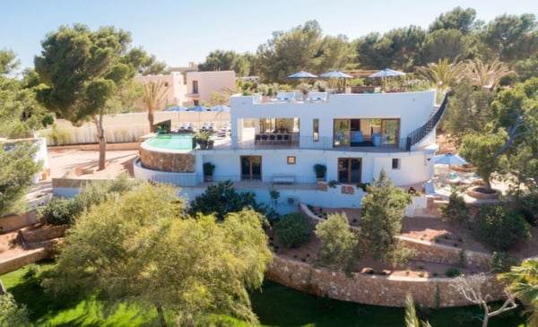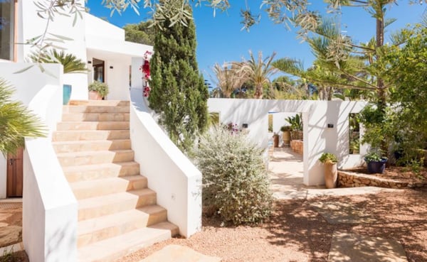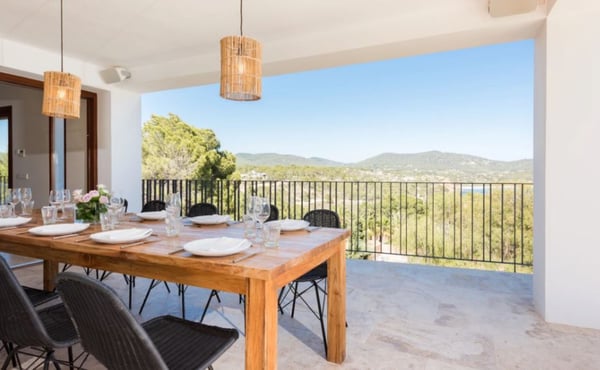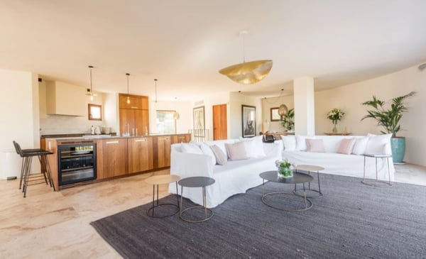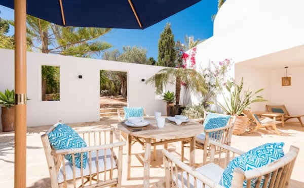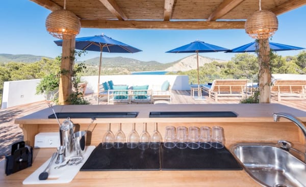 Nestled within a lush Mediterranean garden with a heated infinity pool, pool bar and rooftop terrace, this is a beautiful modern villa in southern Ibiza with sea views. The villa is split over two levels - the top level has a large living area with a state-of-the-art open kitchen, a large pool area and guest toilet. From all areas of this level, you can enjoy the beautiful sea views and the green hills in the background. This amazing villa also features a large roof terrace where you can enjoy the evenings and the nice views, with a bar and chill-out area. The villa has just been totally modernized with the highest quality materials and exquisite taste. Terraced grounds and a lush landscaped garden with mature trees and large lawn areas. Private, heated infinity pool with Roman-style steps, decked sunbathing area, outdoor shower. Pergola with bar area, several chill-out areas, covered terrace with al fresco dining facilities and barbecue. Rooftop terrace, bar and lounge area. stunning sea views. Please note the service rooms are only to be used by staff members working in the property or children 12 years old and under.