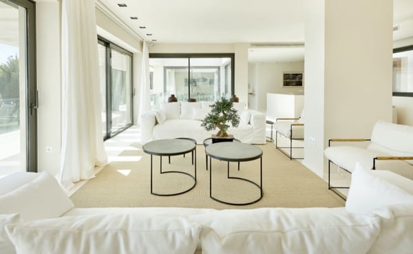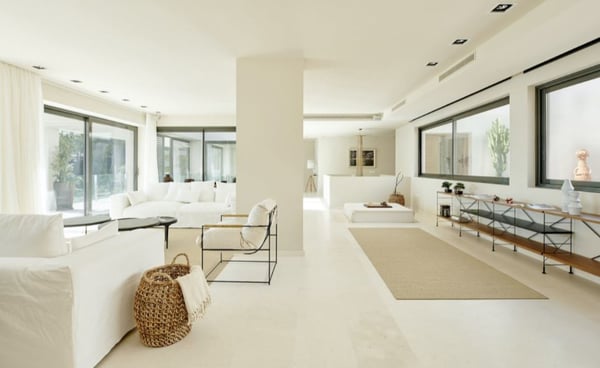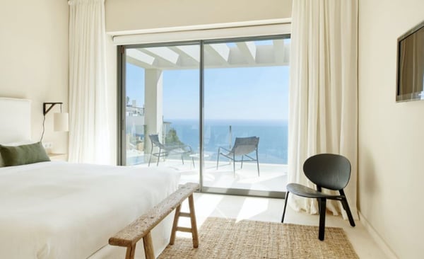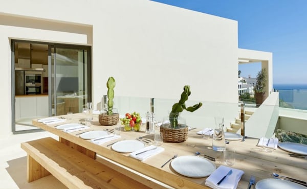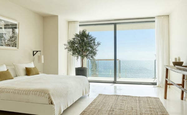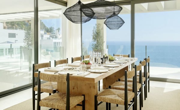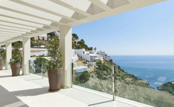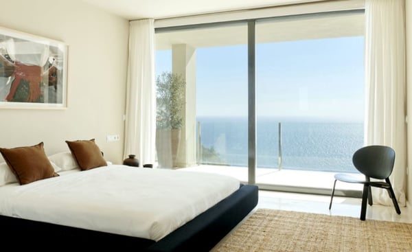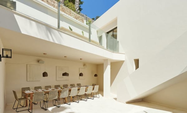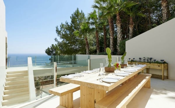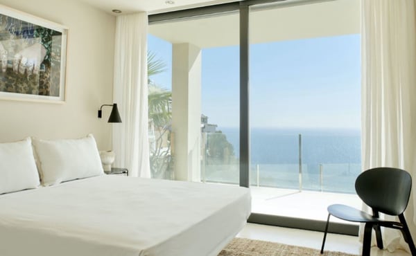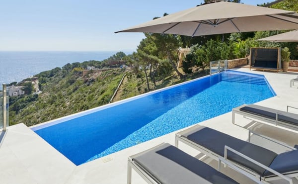 Dramatically built on a cliffside along a scenic stretch of coast between Ibiza Town and Santa Eulalia, this splendid villa with infinity pool affords some magnificent views over the Mediterranean sea off Ibiza's east coast This impeccably finished villa accommodates up to 14 guests in three luxury bedrooms and four service rooms recommended for younger guests or staff. The vista from the pool and the terrace is simply spectacular: whether you relax on the terrace sipping your favourite cocktail or take a dip in the pool or enjoy a meal in good company, this vista will frame every moment of your holiday. Here you are very well positioned to reach the villages of Jesús and Cala Llonga, two golf courses, Ibiza Town in 10 minutes' drive, and the beautiful private beach of Cala Olivera.
