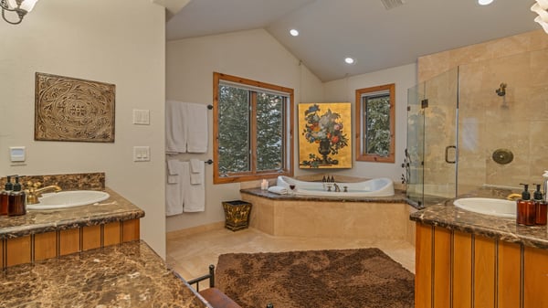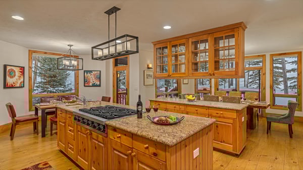 Ski Butlers offers you the best rental experience in the industry. No more lines. Ski Butlers is a full-service ski and snowboard company that delivers the equipment to you. Contact a villa specialist for more information. Unwind at the end of your days and enjoy Breckenridge Ski Area Mountain views at the meticulously designed and decorated Inglenook. This spacious, luxury home has rustic log accents and a comfortable mountain feel, perfect for a Colorado getaway. In winter, the shuttle can take you to and from the ski lifts or downtown, making your vacation truly hassle-free. On warmer days, walking to town is a breeze. There is plenty of entertaining space in this 5000-square-foot home with its open floor plan, post and beam interior, and large great room with comfortable seating, river rock gas fireplace, and plenty of natural light. A chef’s kitchen will delight hungry crowds with double ovens, two sinks, a gas cooktop, a large island, and bar seating. A cozy breakfast nook and perfect kid's table sit adjacent to the kitchen and an elegant dining room seats eight guests. Off the kitchen, you will find a deck with a grilling area, outdoor seating, and a private hot tub area for relaxing under the stars after an action-packed day. Guests will enjoy five tastefully decorated bedrooms, each filled with natural light and splashes of colour. The spacious primary king suite is on the main level with a TV, fireplace, and ensuite bath with a soaking tub and walk-in shower. Enjoy the cozy library and private office space on the main level and get lost in a book on the twin sleeper chair. On the upper level is a king suite with an ensuite as well as a room with two double beds and a loft with a queen sleeper sofa, desk, and game table. Relax by the fire in the cozy lower-level family room, complete with a TV and bumper pool, game table, wet bar, sink, and microwave. Adjacent to the family room are two more bedrooms, a queen suite with an ensuite bath and a festive jungle book bunkroom with two twin trundle beds and an ensuite bath. Other amenities to this spectacular home include a 3-bay garage with parking for 5 cars total, and a washer and dryer. 4-WHEEL DRIVE IS RECOMMENDED IN THE WINTER MONTHS Regretfully, weddings and events are not permitted. This is a pet-free home due to severe homeowner allergies. For groups who require more beds, rent one of our other luxury properties, Lazy Bear, with Inglenook, for a combined guest total of 27. They are less than half a mile from one another and create the perfect opportunity for larger gatherings. This home enjoys complimentary shuttle use, from mid-November through mid-April, using the convenient shuttle app to schedule pickups. The use of the shuttle is on a first-come, first-served basis. This home has WIFI and comes fully stocked with paper products (paper towels, toilet paper, tissues), bathroom toiletries (shampoo, conditioner, body wash, hand soap), and detergents (dish, dishwasher, and laundry) as well as clean bed linens and towels. In addition, the kitchens are stocked with aluminum foil, plastic wrap, trash bags, sponges, soap, salt and pepper, coffee, tea, cookware, bakeware, dishes, glasses, utensils, and standard small appliances. This home does not have air conditioning. Colorado's cool summer nights will keep this home comfortable by opening windows after the sun goes down, and then closing the windows and blinds during the day. Utilizing the overhead fans, if available, keeps airflow moving, and additional floor fans can be found in many bedroom closets. Can't live without it? A/C units may be available for rent for an additional fee. Inglenook Business License: 425680002 5,000 sq. ft.