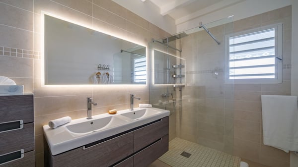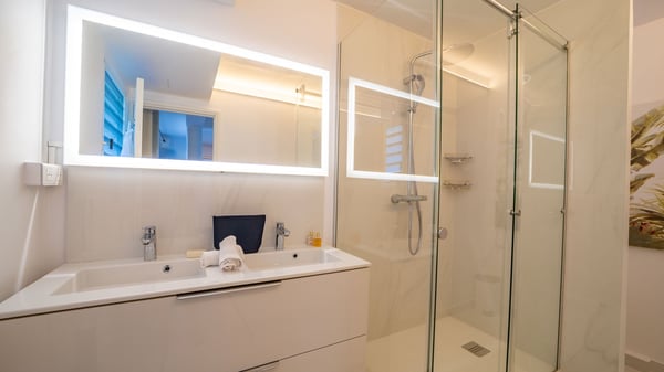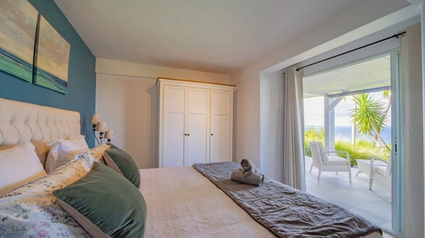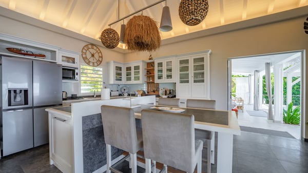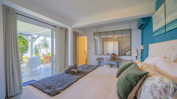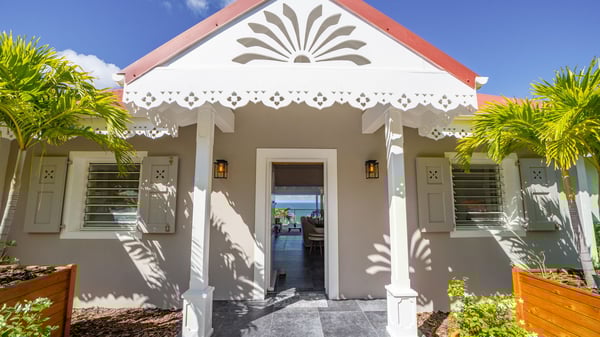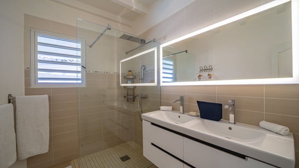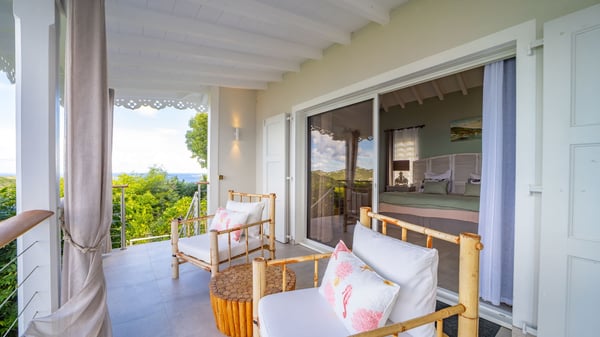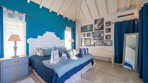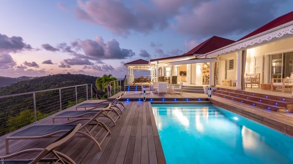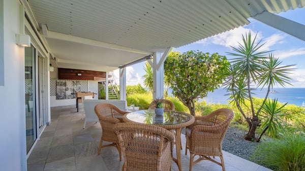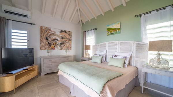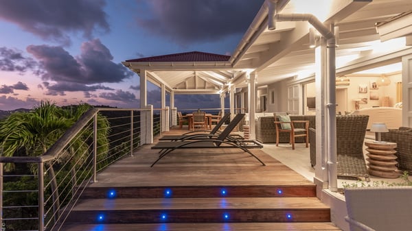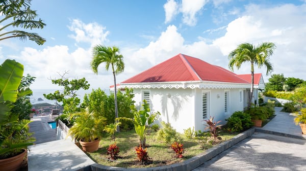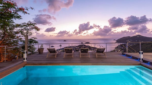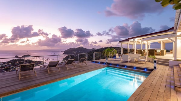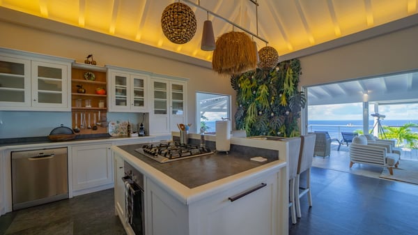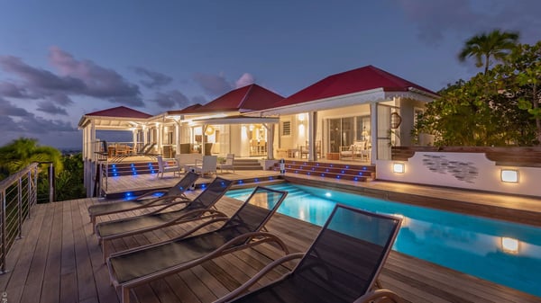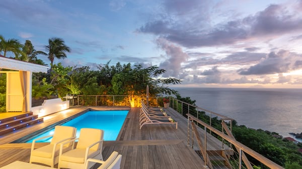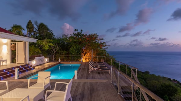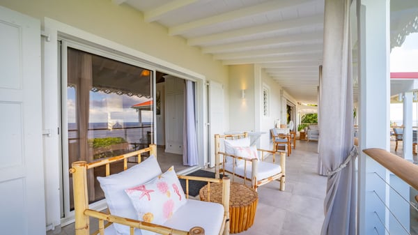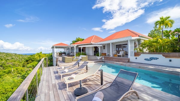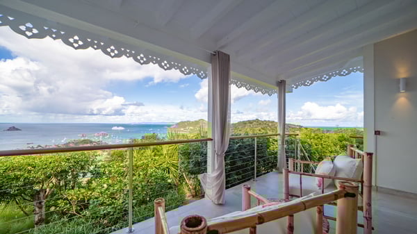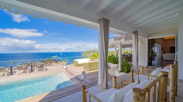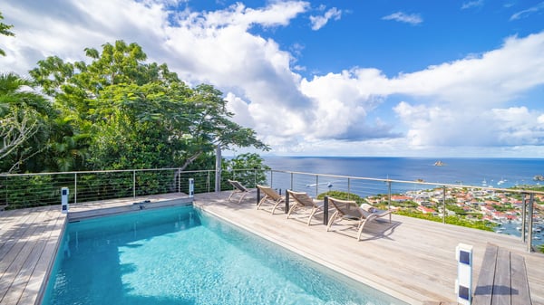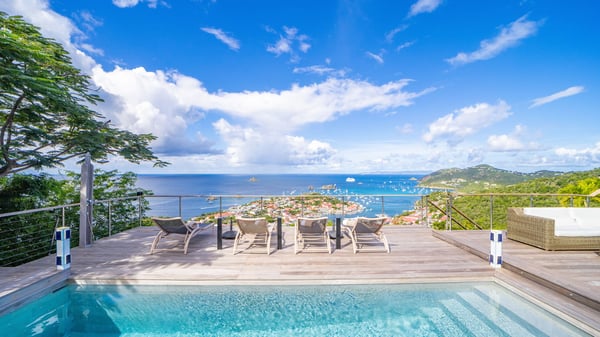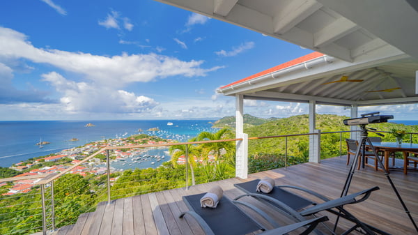 The rental villa St-Barts Ti Moun is a charming rental property offering breathtaking views of the ocean and harbour. Ideally located in Lurin, this vacation home with a private pool welcomes up to six guests in ultimate comfort, combining cozy interiors and well-appointed terraces overlooking spectacular sunsets. Spread across multiple levels, the vacation rental villa Ti Moun is a true haven of peace, bathed in natural light and refreshed by the trade winds. Facing a panoramic view that stretches from Gustavia’s harbour to the bay of St-Jean, Ti Moun features an exceptionally comfortable living room with plush sofas topped with cushions, beneath a high vaulted ceiling that enhances the sense of space. Driftwood accents blend beautifully with soft off-white tones, creating a wonderfully relaxing atmosphere. Close to the lounge, the fully equipped kitchen includes a central island with a dining counter, perfect for enjoying a snack at any time. Beyond the glass doors, the stunning view floods the space with light and beauty. At the front of villa Ti Moun, the terrace opens onto a dazzling panorama of the ocean, the harbour, Shell Beach, and the endless horizon, glowing each evening under the golden colours of the sunset. Beneath the covered area, a woven-fibre outdoor lounge and an al fresco dining table for six guests invite guests to unwind and enjoy delicious meals. A few steps down, a modern table offers a peaceful spot to sit and chat while admiring the extraordinary ocean view. Under the brilliant Caribbean sun, the pool sparkles on the wooden deck lined with sun loungers, the perfect place to relax in utmost privacy. The holiday rental Ti Moun consists of three air-conditioned bedrooms, each with an en-suite bathroom and ocean views. Two are located on the main level, including one that opens directly onto the pool, beneath the traditional Caribbean gingerbread trim, and feature twin beds convertible to a king. The third bedroom is on the lower level, with twin beds and a lovely private terrace. The maritime-inspired décor, in shades of deep blue and seafoam green, along with whitewashed or upholstered headboards, enhances the exquisite sense of comfort. A well-equipped fitness room is also available during your stay. With its exceptional views of the ocean and Gustavia harbour, Villa Ti Moun is the perfect destination for an unforgettable vacation for up to six guests in St-Barths.