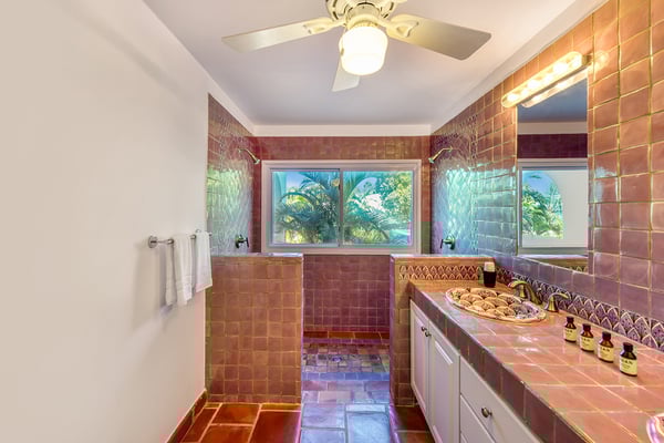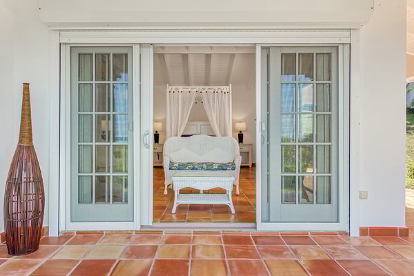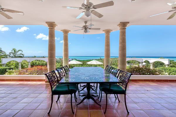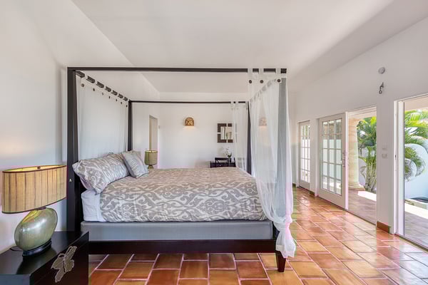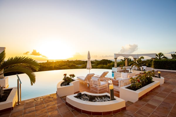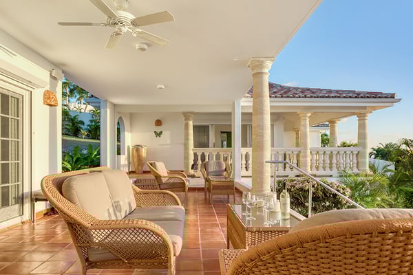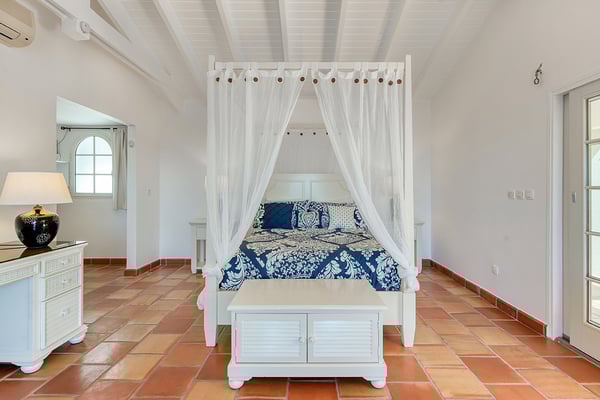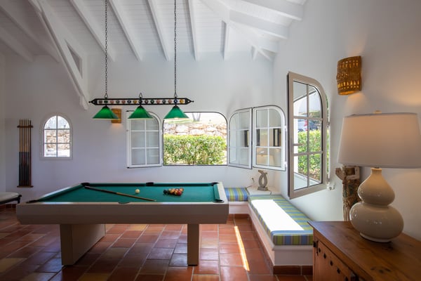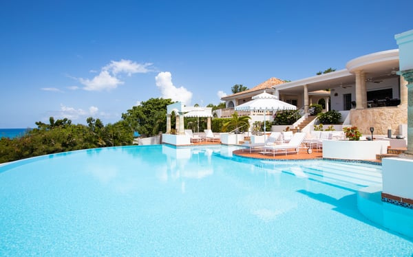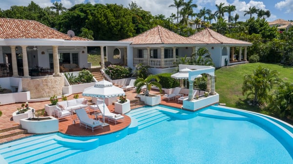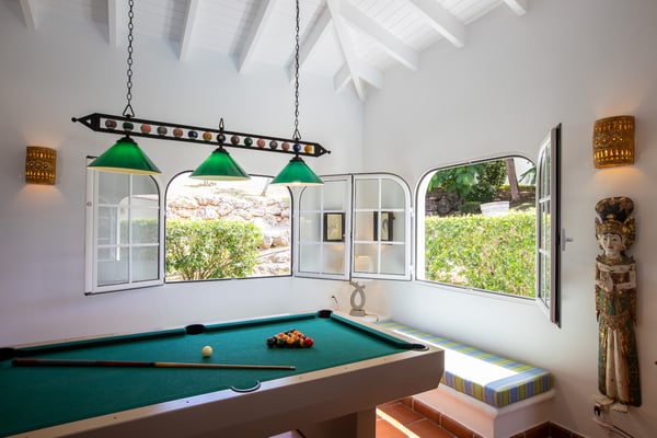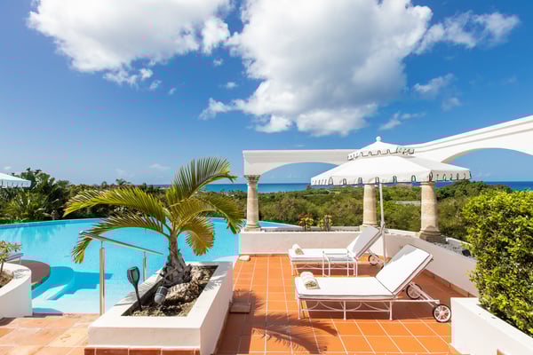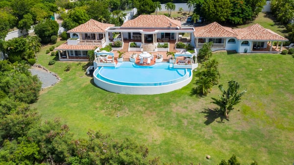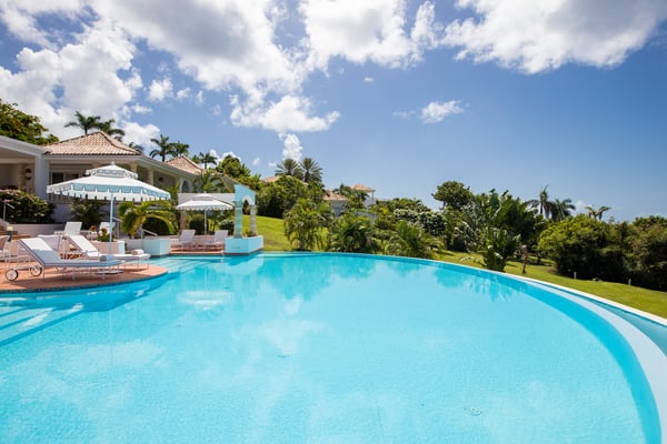Villa Mariposa is an elegant Caribbean style villa with a romantic tropical atmosphere. Lush pink bougainvillea and palm-filled gardens, set in green lawns, draw the eye straight to breathtaking panoramic views. The house is perfect for outdoor living with multi-level terraces that descend from the main level to the large horseshoe-shaped pool and beyond to the lawn. Pool heating is optional at an additional $350 per week. If you wish to relax inside, while still enjoying sea views, step into the large comfortable living room with a full-sized pool table. Adjacent to the interior dining and living room is a well-equipped kitchen fitted with everything required for a gourmet meal. The four exterior access bedrooms are equal in size and air-conditioned. Two are placed at each end of the villa; one upper and one lower. Each bedroom has sea or pool views plus private terraces. The ensuite bathrooms are uniquely decorated in richly colored. From the oversized double showers, you view the ocean. Villa Mariposa will enchant your next stay in St Martin with family or among friends and can be rented as a two, three or a four-bedroom home!