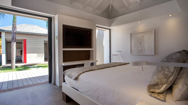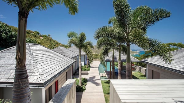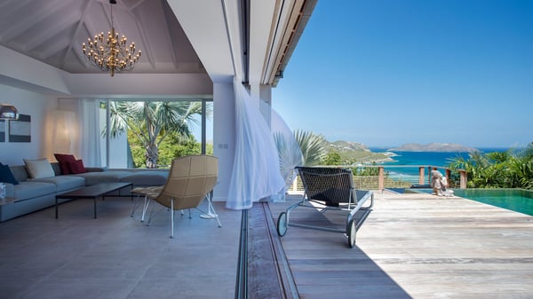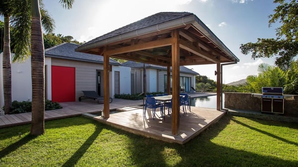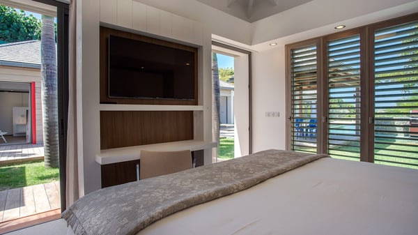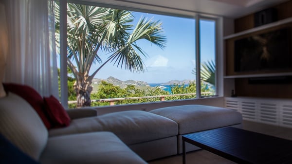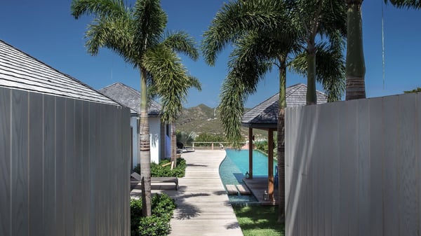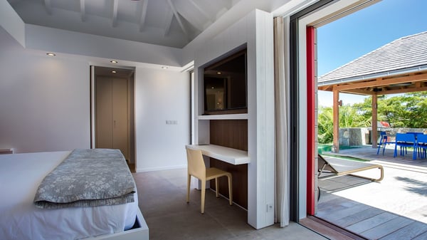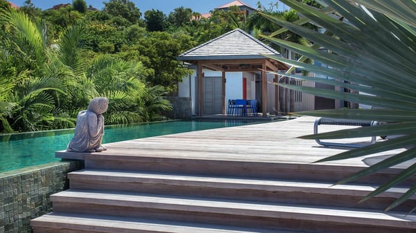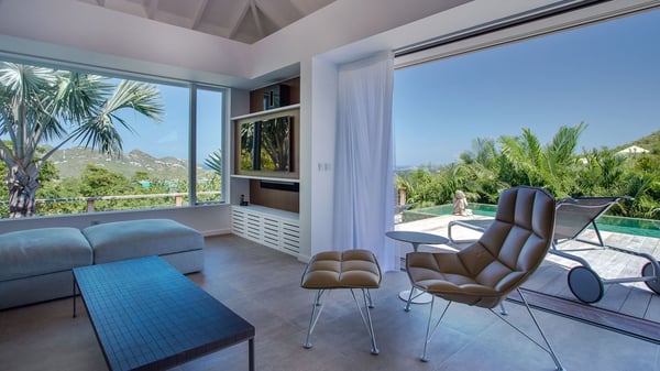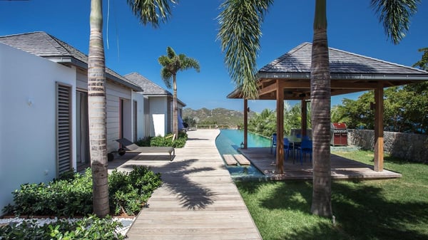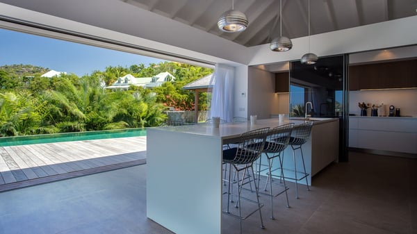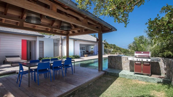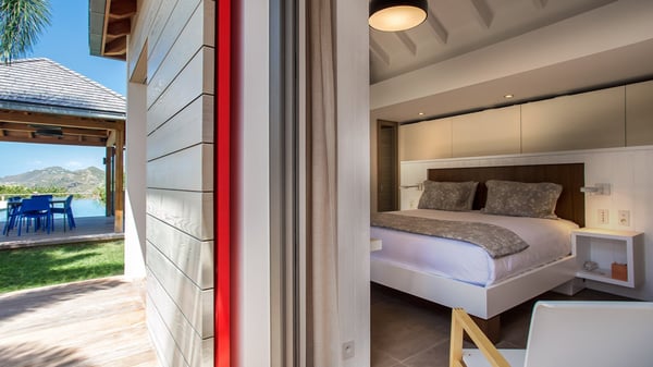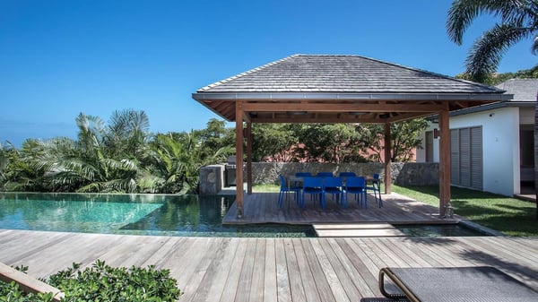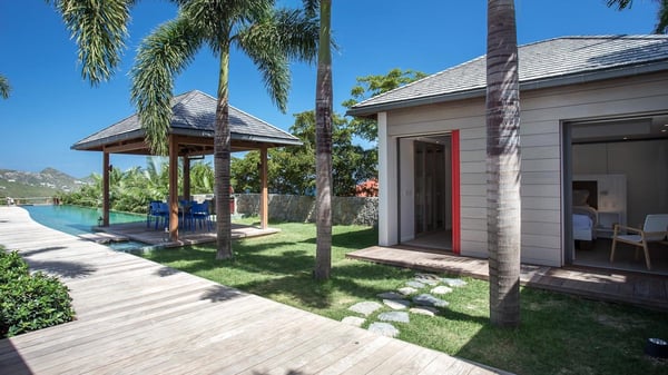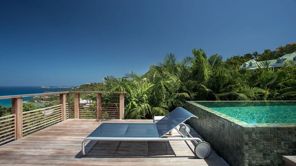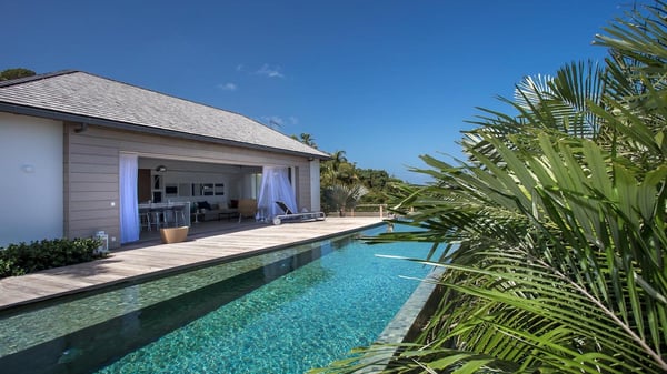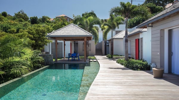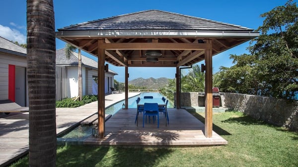 Nearby construction may result in noise disturbances. For further details on how this might affect your stay, please reach out to a Rental Escapes villa specialist. A true haven of peace and luxury, villa Angelique is a sumptuous property located in the heights of Saint-Jean. Upscale amenities and a stunning view over the rising sun are among the many assets of this four-bedroom house with a swimming pool. In the tropical beauty of the island of St-Barths, villa Angelique is a privileged place for an unforgettable vacation. Built over three levels and bungalows, villa Angelique features bright and comfy spaces. On the main level, the fully air-conditioned living room welcomes guests in a most refined decor, with a lounge open onto two sides on the terrace with a view over the ocean and the rolling hills. Modern sofas, armchairs and fine lighting create a peaceful atmosphere, close to the contemporary dining area for six and the well-equipped kitchen. Wood hints, striking white walls and vaulted ceilings create a pleasant feeling of volume. In this serene and luxurious atmosphere, guests get relaxed while watching the outstanding panorama. At the front, the terrace of Villa Angelique features a long, heated swimming pool in front of the view. At one end of the pool, there is a lovely gazebo with a covered dining room for eight guests, the perfect place to have dinner outdoors near the garden equipped with a barbecue. On the deck alongside the pool and a few steps below, loungers are set up for reading, chatting or sunbathing in the mild Caribbean air. In front of the breathtaking view over the ocean and the hills, time seems suspended in the heart of the tropical beauty. The vacation rental villa Angelique consists of four air-conditioned bedrooms with en-suite bathrooms throughout the property. Two bedrooms are in a bungalow on the main level close to the pool and can be connected, the third is in another bungalow on the same level; the fourth bedroom is on the upper level and has a lovely terrace. All are furnished with queen-size beds and HDTVs, in a modern and cozy decor. What’s more, a fitness room is available on the lower level, surrounded by Caribbean vegetation. Luxurious and very private, the holiday rental villa Angelique is the perfect place for an eight-person stay in St. Barths.