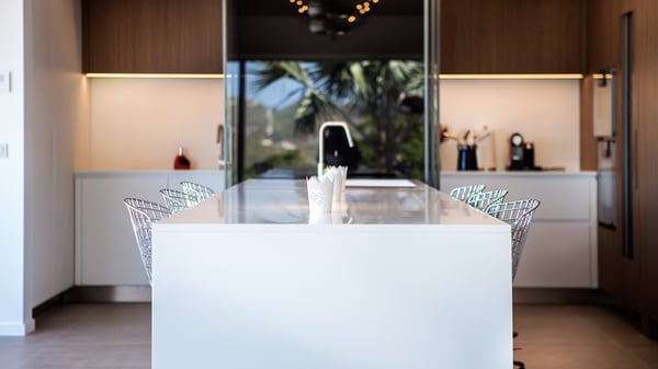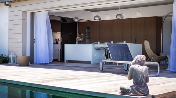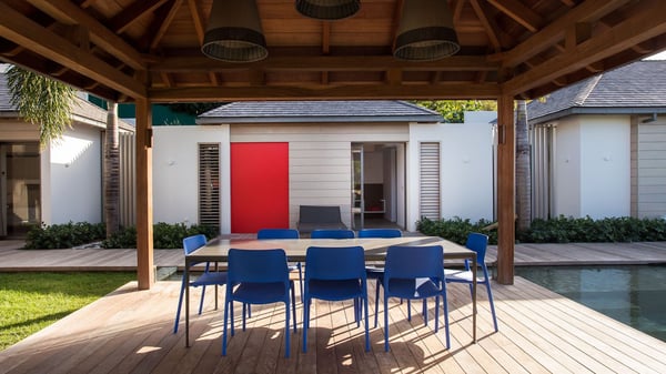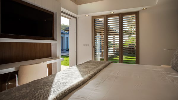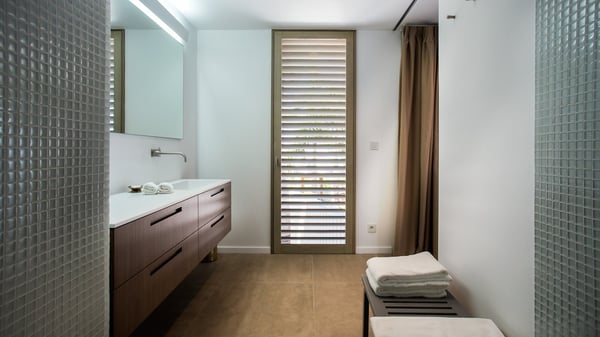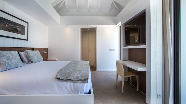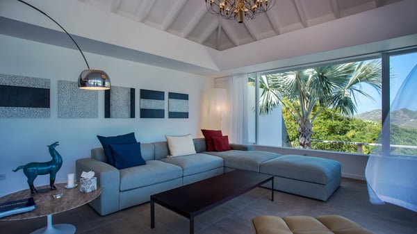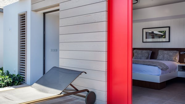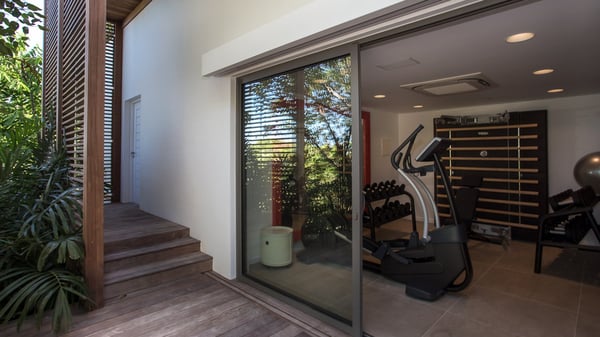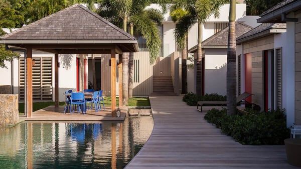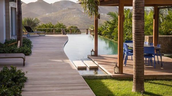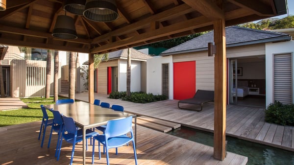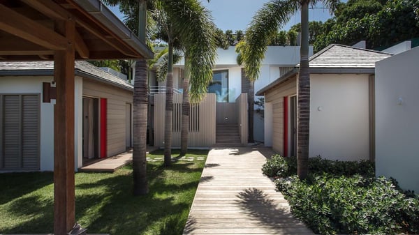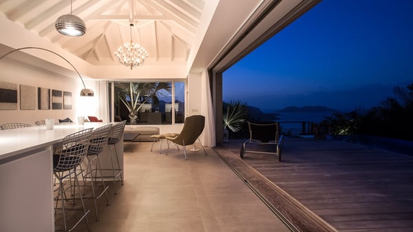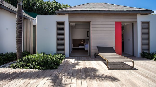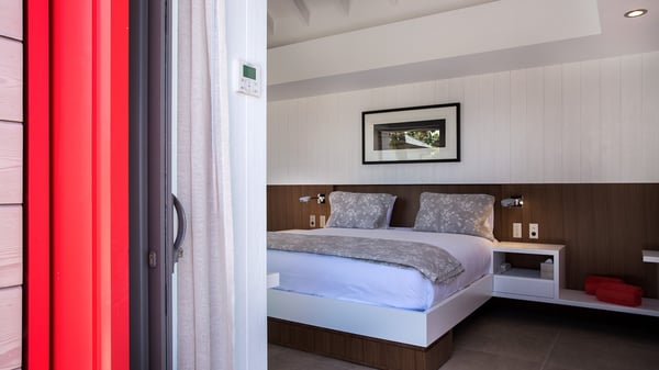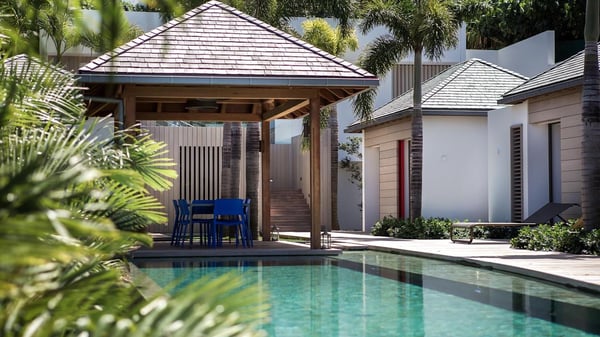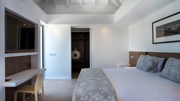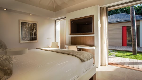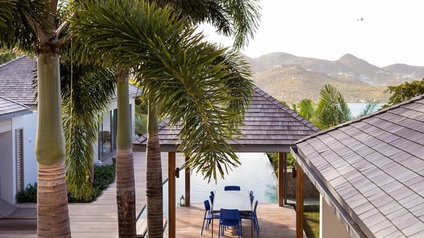 Nearby construction may result in noise disturbances. For further details on how this might affect your stay, please reach out to a Rental Escapes villa specialist. A true haven of peace and luxury, villa Angelique is a sumptuous property located in the heights of Saint-Jean. Upscale amenities and a stunning view over the rising sun are among the many assets of this four-bedroom house with a swimming pool. In the tropical beauty of the island of St-Barths, villa Angelique is a privileged place for an unforgettable vacation. Built over three levels and bungalows, villa Angelique features bright and comfy spaces. On the main level, the fully air-conditioned living room welcomes guests in a most refined decor, with a lounge open onto two sides on the terrace with a view over the ocean and the rolling hills. Modern sofas, armchairs and fine lighting create a peaceful atmosphere, close to the contemporary dining area for six and the well-equipped kitchen. Wood hints, striking white walls and vaulted ceilings create a pleasant feeling of volume. In this serene and luxurious atmosphere, guests get relaxed while watching the outstanding panorama. At the front, the terrace of Villa Angelique features a long, heated swimming pool in front of the view. At one end of the pool, there is a lovely gazebo with a covered dining room for eight guests, the perfect place to have dinner outdoors near the garden equipped with a barbecue. On the deck alongside the pool and a few steps below, loungers are set up for reading, chatting or sunbathing in the mild Caribbean air. In front of the breathtaking view over the ocean and the hills, time seems suspended in the heart of the tropical beauty. The vacation rental villa Angelique consists of four air-conditioned bedrooms with en-suite bathrooms throughout the property. Two bedrooms are in a bungalow on the main level close to the pool and can be connected, the third is in another bungalow on the same level; the fourth bedroom is on the upper level and has a lovely terrace. All are furnished with queen-size beds and HDTVs, in a modern and cozy decor. What’s more, a fitness room is available on the lower level, surrounded by Caribbean vegetation. Luxurious and very private, the holiday rental villa Angelique is the perfect place for an eight-person stay in St. Barths.