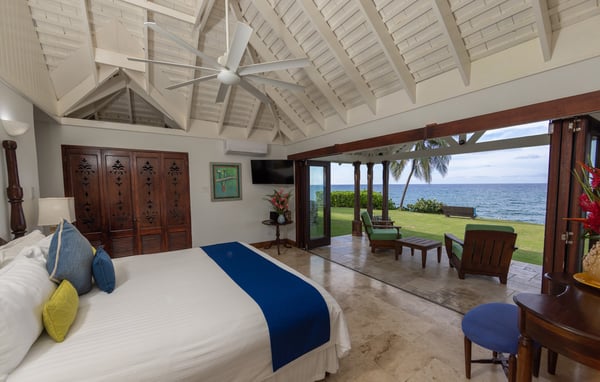The Tryall Club requires all villa and condo guests to become members during their stay via a Temporary Membership Fee ($) (plus a 15% service charge). Children between the ages of 13 and 15 pay at a discounted rate (plus a 15% service charge). Guests can also pay per day, for guests ages 16 and older, who stay for one to four days. This can be either prepaid or upon arrival at the Club. For children 12 years of age and younger, our Temporary Memberships are complimentary. Please contact a Villa Specialist for exact pricing! For a taste of paradise where waves kiss the shore and trade winds sway the palms, Karma Bay delivers an unforgettable escape. This stunning waterfront villa blends Asian and Caribbean influences with vibrant colors and luxurious touches. If you can pull yourself away, the main beach is just steps away, and the Club’s many amenities are a short golf cart ride. Karma Bay features six air-conditioned bedrooms, each with a media system and a private en suite bathroom with waterfall showers. Two suites offer open-air shower areas. Five bedrooms have king-sized beds, while one has twins that can convert to a king. Waterfront-facing rooms open onto private terraces. Four bedrooms connect to the main house via covered pavilions with ocean and garden views. Each bedroom is equipped with a personal cell phone for direct butler service. The spacious living room and veranda offer breathtaking sea views, while the expansive pool deck and sprawling lawns provide plenty of space to unwind. A barbecue lawn is perfect for casual outdoor gatherings. Guests can dine in the oceanfront gazebo or the elegant indoor dining room, where the villa’s talented chef will impress with culinary creativity. Karma Bay includes three complimentary golf carts for guest use.
