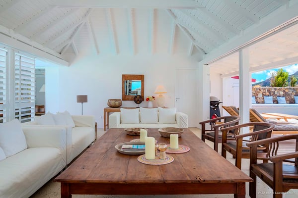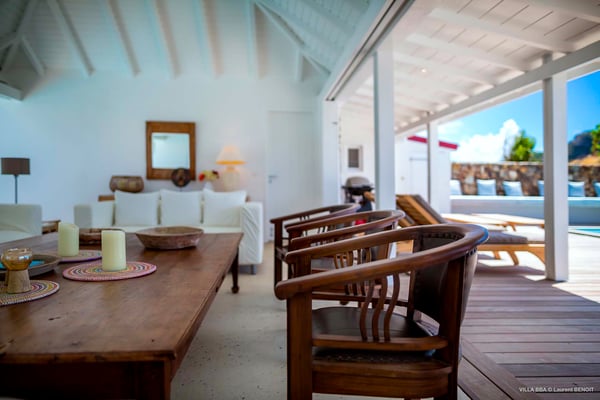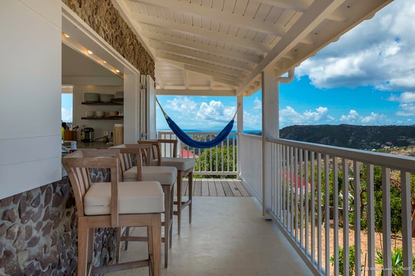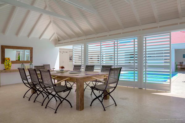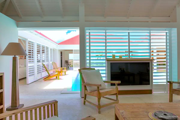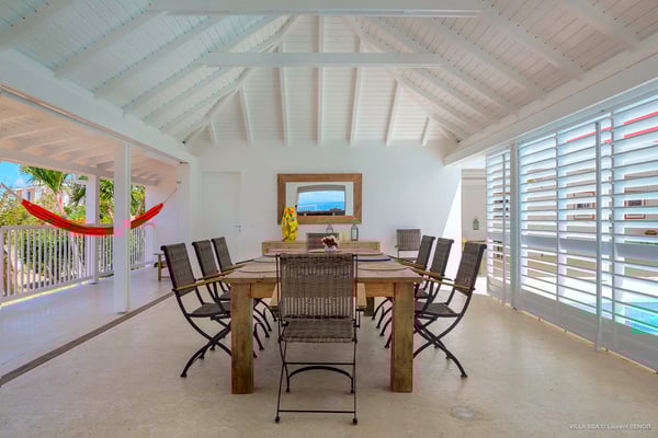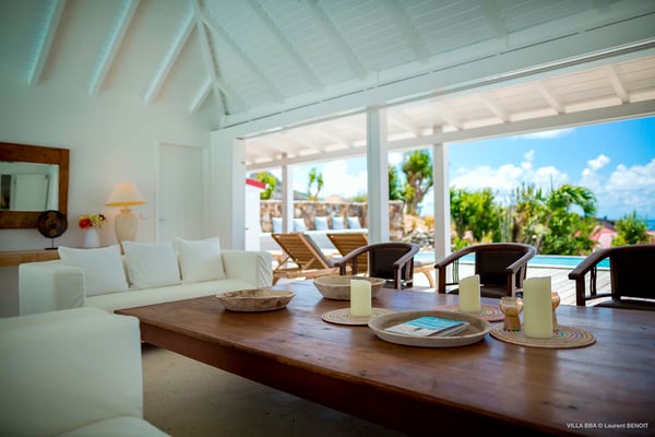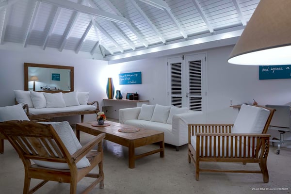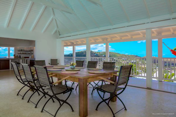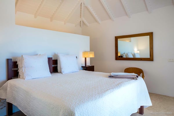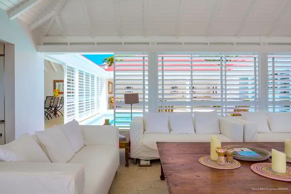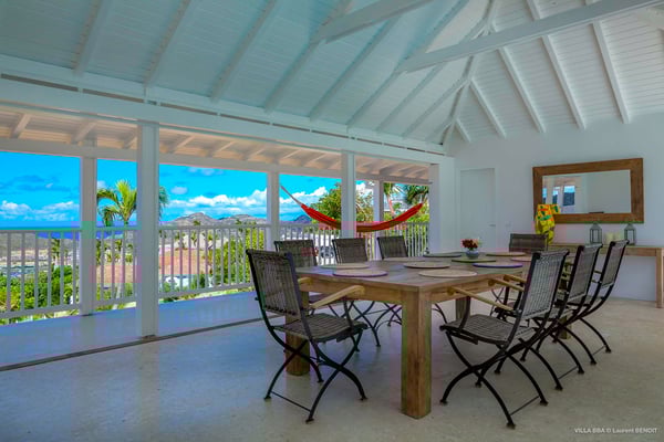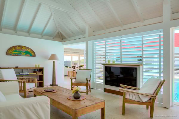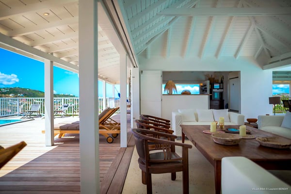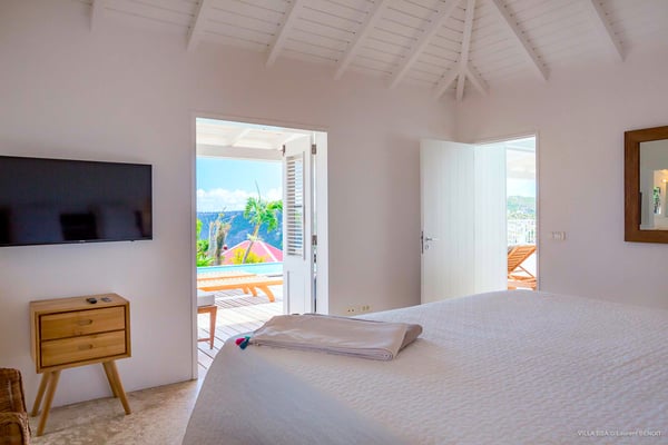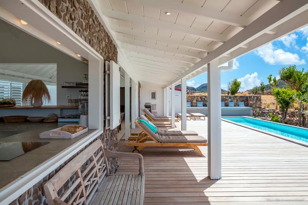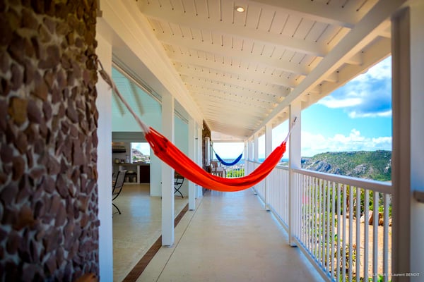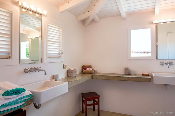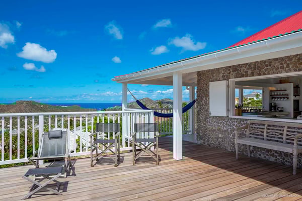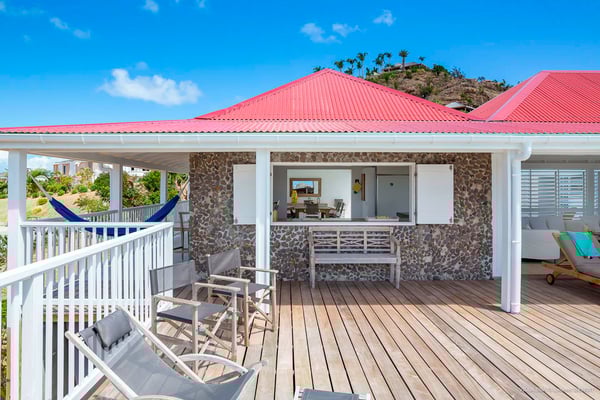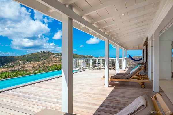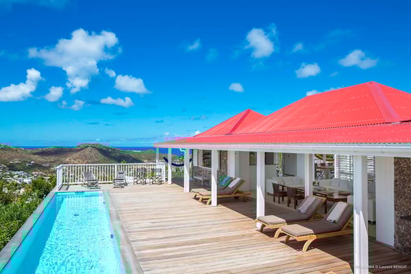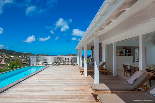 Villa Supersky is a magnificent three-bedroom, two-pool property in an exceptional setting. Ideally located in Saint-Jean in the Cricket area, Supersky offers splendid views over the rolling hills and the deep-blue ocean. Its luxurious amenities and bright spaces make it the perfect place for an unforgettable stay with family or friends in Saint-Barths. Built on one level, the vacation rental Supersky opens onto an outstanding panorama over the Caribbean nature. Designed around a central courtyard with a sparkling pool and bordered by a second, long swimming pool, Supersky welcomes you in a soothing and cozy atmosphere. Opening directly onto the pool terrace at the front and the central terrace at the rear, the lounge features a sofa, armchairs and a coffee table in a soft decor with fine touches of wood. The dining room is on the side of the villa and opens onto both the central pool and a long terrace that also serves the fully-equipped kitchen. On the other side of the villa, you’ll love the TV room where you’ll enjoy pleasant movie nights in a lovely and relaxing setting overlooking the courtyard pool. The front terrace offers a majestic view over the hills and the perfect horizon. You’ll experience delightful swimming sessions in the sparkling pool and sunbathing sessions on the nearby deckchairs. In the tropical breeze, there are hammocks inviting you to marvel at the idyllic scenery. Accessible from the living room, the dining room and the TV lounge, the central terrace features a swimming pool in a very private atmosphere. There is also a covered outdoor area at the rear of the villa, overlooking the pool in a privileged atmosphere. The holiday rental Supersky consists of three air-conditioned bedrooms with en-suite bathrooms located at the corners of the property for utmost privacy. Spacious and bright with a beige decor, they open onto St-Barths nature, with bedroom 1 onto the terrace. There are mirrors, TVs and comfortable fabrics in the bedrooms, the best place to relax after great days exploring the island's treasures. Set in St-Jean’s beautiful surroundings, Villa Supersky is the perfect place for a fantastic vacation in St-Barths.