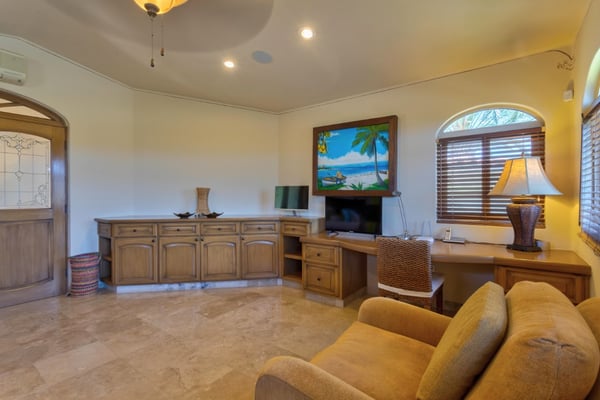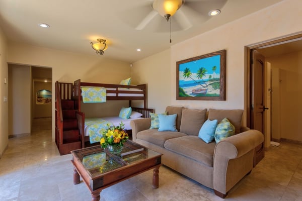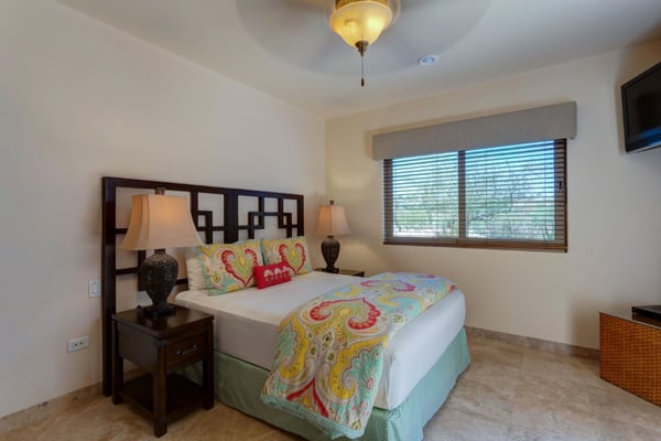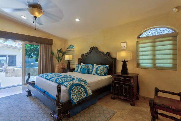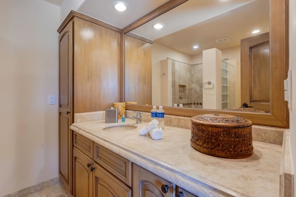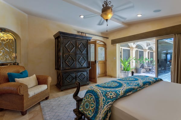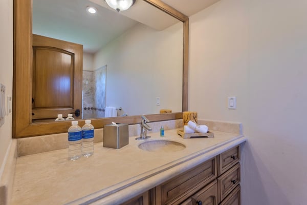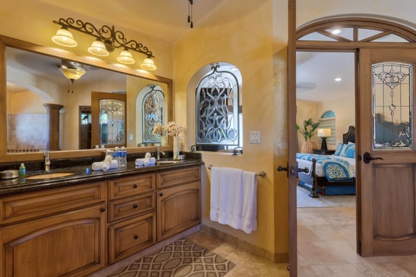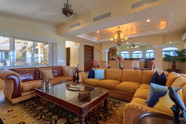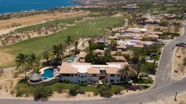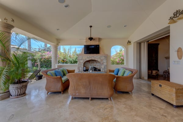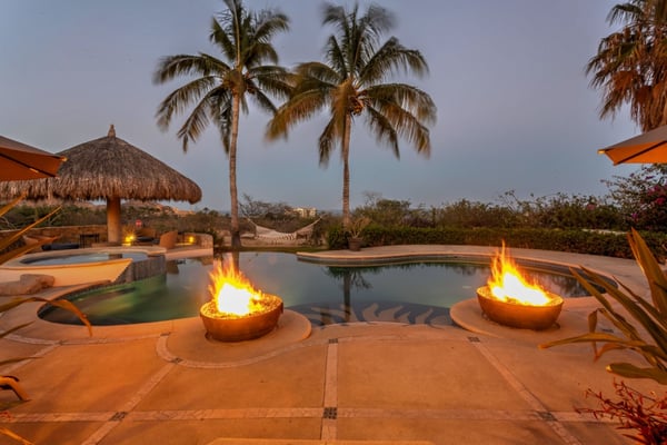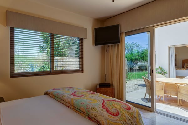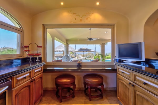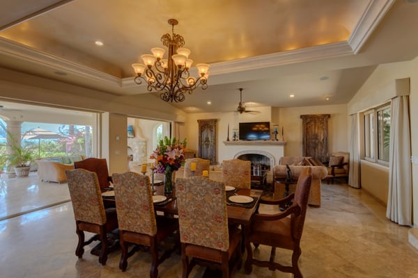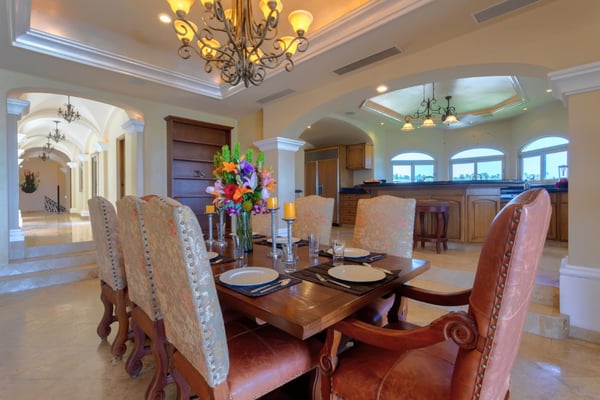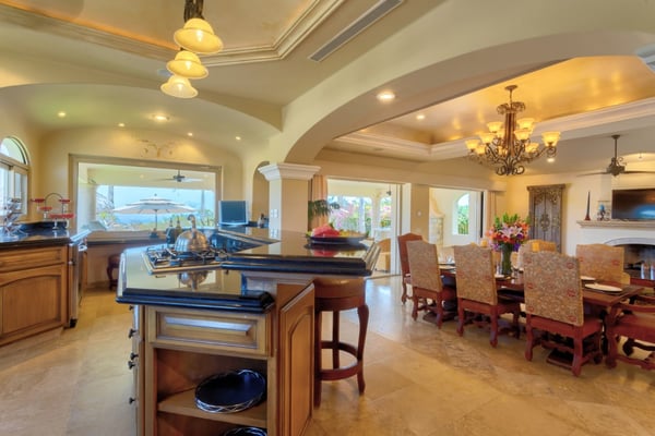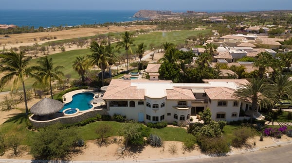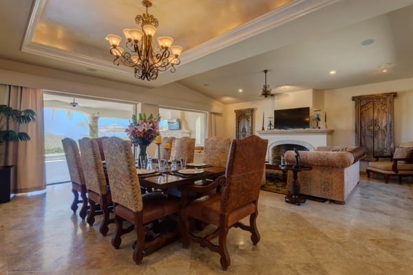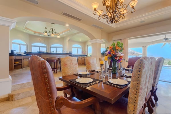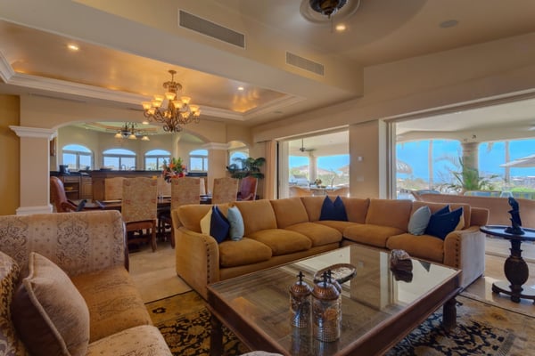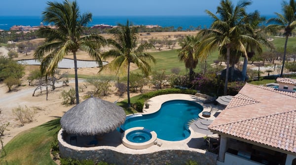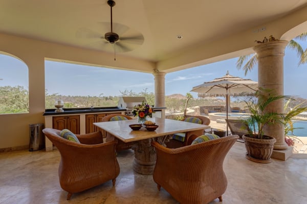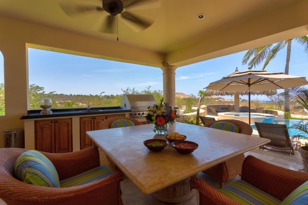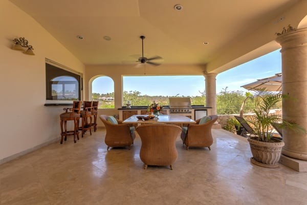 Construction is taking place nearby and may create some noise issues. Contact a Rental Escapes villa specialist for more information about how this may impact your stay. Introducing Villa Esquina, a stunning split-level villa nestled on the 1st green of the Cabo del Sol Golf Course. With its prime location and spacious layout, this 5-bedroom retreat is perfect for a family getaway or group retreat. The main floor features a fully equipped kitchen and a convenient butler's kitchen, ideal for preparing meals and snacks for your group. The adjacent dining room and living area open up to a large shaded exterior dining and living space, offering panoramic views of the golf course and ocean beyond. Here, you'll find a built-in gas BBQ, a small fridge for refreshing beverages, and a luxurious pool and Jacuzzi where you can relax and unwind in style.