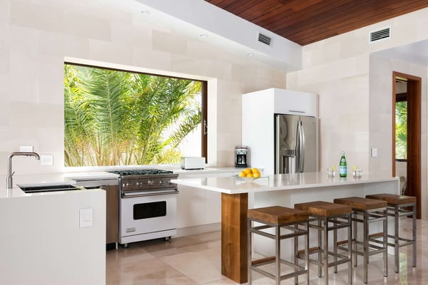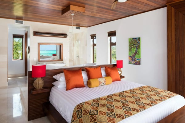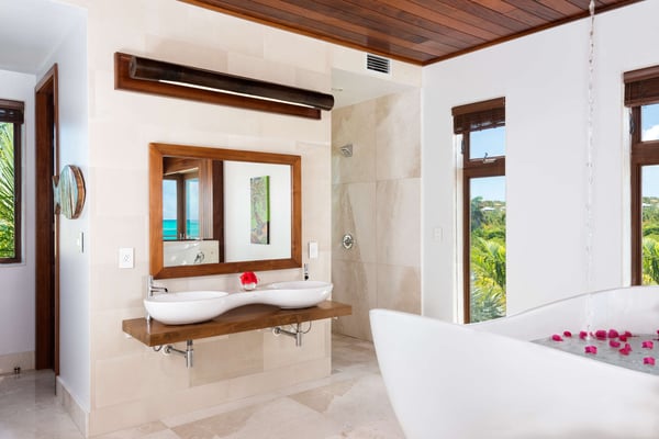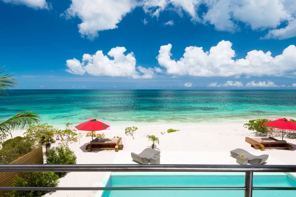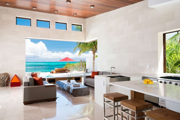From its innovative architecture to it’s far-reaching views, Beach Kandi is a sweet sensory treat. Positioned on the shores of Grace Bay, framing sensational, unobstructed seascapes and offering direct access to one of the best reefs on the island, this contemporary villa is a triumph of indoor-outdoor design. An infinity pool, set into a pale limestone terrace that blends seamlessly with the sugary sand beyond it, is yours to enjoy. Dive in to rinse off the salt after a morning kayak or spend quiet afternoons reclining on the sunbathing shelf, then choose where to dry off: on one of the shaded triple day beds, a gently curved lounger, or the sumptuous outdoor sectional sofa. With an outdoor shower and barbecue, you’ll barely need to go indoors. The great room, with a double-height ceiling and pocketing glass doors that eliminate the corners entirely, is a striking open-to-the-elements living space, where hardwood accents and bright pops of colour add warmth and character to the clean architectural lines. Distinct sitting, dining, and cooking areas include sofas arranged for the best ocean views, with a cleverly concealed TV, a dining area that seats six comfortably, and an open kitchen fitted with stainless steel appliances and gleaming white surfaces. With its ocean-view sink and huge over-counter window that slides open to let in the sound of whispering palms, it’s a space you’ll be eager to cook in. The two-bedroom suites, positioned one directly above the other, promise privacy for two couples. Infused with subtle Asian accents, both feature corner doors and ocean views; one opens directly onto the pool terrace, the other onto a private, sun-kissed balcony. The lavish bathrooms are the ultimate indulgence, however, featuring oversized soaking tubs filled by a dramatic, overhead outlet, and separate Kohler walk-in showers.