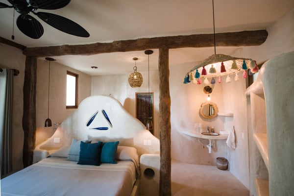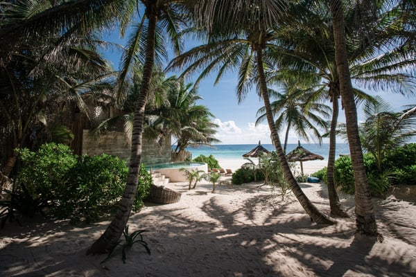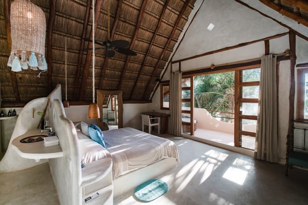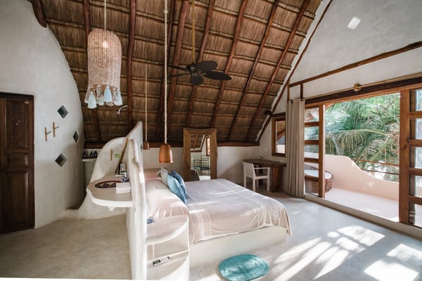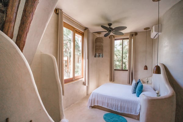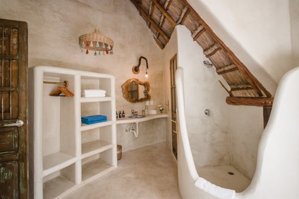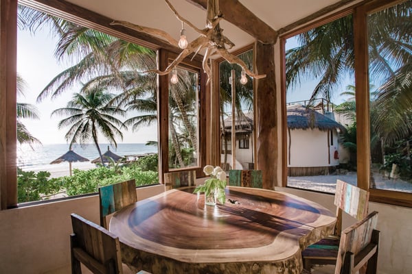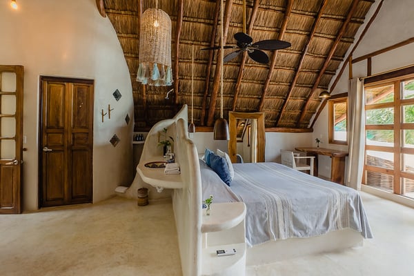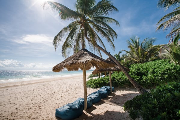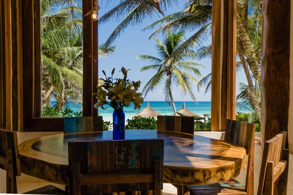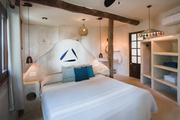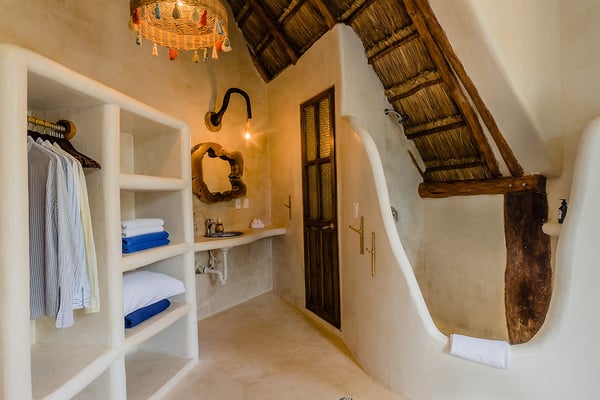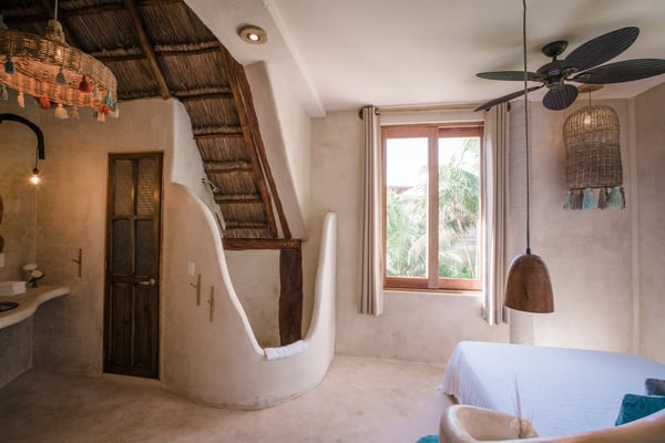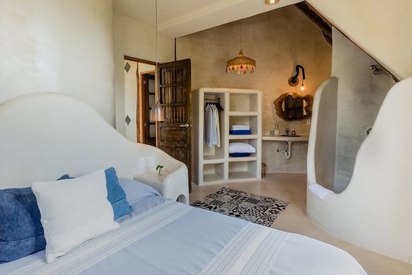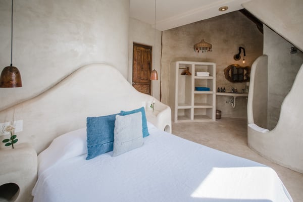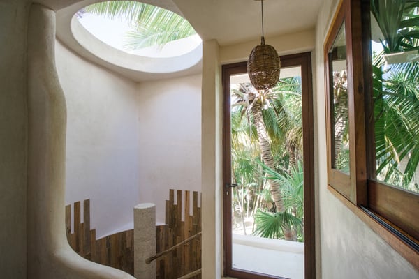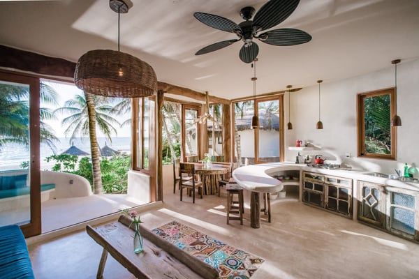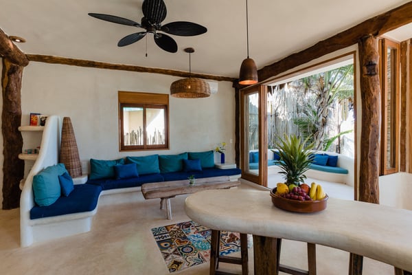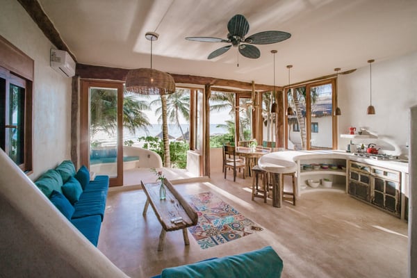 Casa Bonita combines the perfect blend of rustic and luxury to create a space that feels authentic and warm with a location that can't be surpassed. Enjoy the pristine splendor of the white sand beach and turquoise Caribbean Sea at your doorstep, providing you with unrestricted beach time and stunning views. Meander only a few steps to enjoy the best restaurants, boutiques, and the Sanara yoga studio next door. No shoes required. Curved walls, warm woods, and natural textiles at Bonita combined with the abundance of lush natural greenery and private beachfront provide the ultimate peaceful holiday experience that is in harmony with nature. Open the walls of glass doors that face the sea to invite the tropical breeze and sound of the waves into your private living area. Loungers and a daybed are reserved for your personal use on the beach next to the sea.