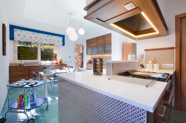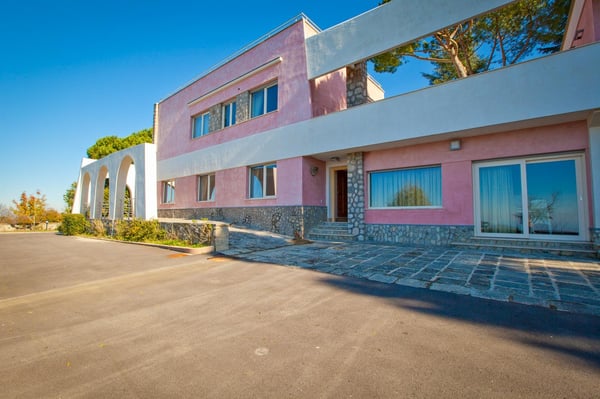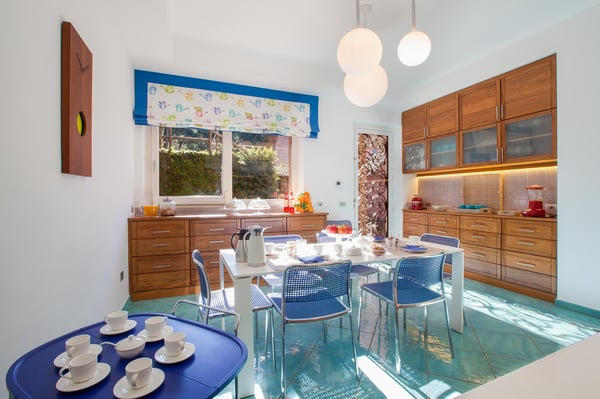 Set on a hilltop of the Sorrentino coast, Annia is a perfectly preserved 1950's luxury villa, showing its beauty with pride. It is located few kilometers from the lively and bustling Sorrento and at walking distance from the closest village. The modernist design of this property, with distinctive features such as large windows, exterior color accents, and open plan living, will please those who appreciate a minimalist look and great functionality of the space. From its terraces and from almost every room you can enjoy stunning sea views and unforgettable sunsets with the Bay of Naples and glitzy Capri in the distance. The quiet location of the villa is just what you need after a day of touring on the busy streets of the coast. Added bonuses for guests with limited mobility are the easy access from the road, no steps from the parking lot to the villa, and the internal elevator. During the summer months, the garden offers organic fruits and vegetables ready to be picked and enjoyed.