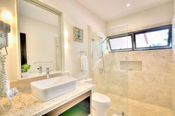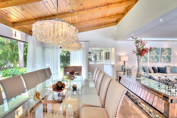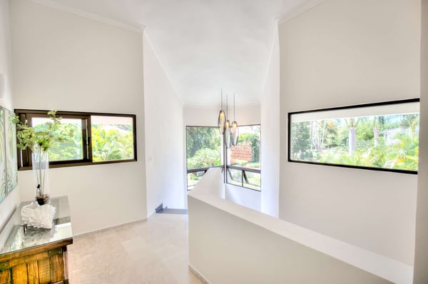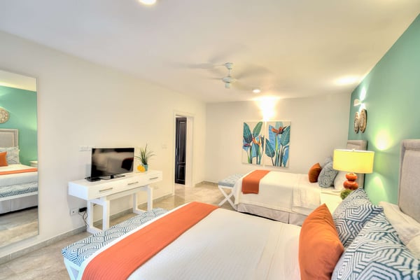 All guests must register with the Casa de Campo Concierge office, and for a small daily fee ($30 per adult per night & $15 per child per night), are granted access to resort areas and amenities. Casa de Campo Resort facilities and amenities include golf courses ($), the fitness centre ($), racquet center ($), restaurants ($) and bars ($). Contact Rental Escapes for more information about pricing. Casa Blue is a luxurious villa perfectly located just a short walk from the renowned Minitas Beach. With breathtaking views from its expansive pool terrace and palapa, this elegant retreat combines modern design with Caribbean charm, offering a perfect setting for relaxation and entertainment. Accommodating up to eight guests in four exquisite bedrooms, it’s ideal for families seeking a resort-like experience in a private paradise. The villa’s interiors exude sophistication, with immaculate white walls, rich wood ceilings, marble floors, and striking chandeliers that frame the dining area for 14 guests. The polished stone terrace surrounds a stunning swimming pool and jacuzzi, seamlessly blending with the lush greenery and open sky. Spend serene days lounging poolside, cooling off in the pool, or relaxing in the hot tub. The palapa offers a shaded retreat for sipping drinks, enjoying al fresco meals, or unwinding under the moonlit sky. Casa Blue features one king bedroom with a bathroom showcasing dual rain showers and a walk-in closet. Three additional bedrooms, each with two full-size beds, feature private bathrooms, TVs, and ceiling fans. Three of the bedrooms are located on the second floor, while one is on the ground floor, ensuring flexibility and comfort for guests. With elegant décor, luxurious amenities, and its prime location less than a quarter mile from Minitas Beach, Casa Blue offers an unforgettable Dominican getaway.