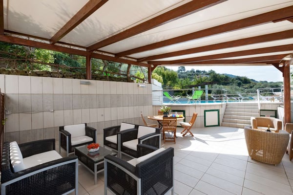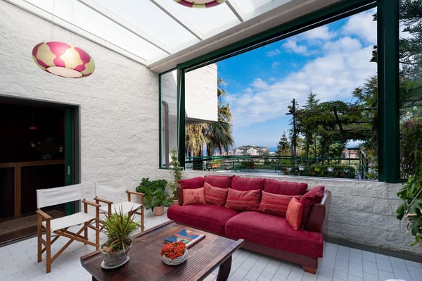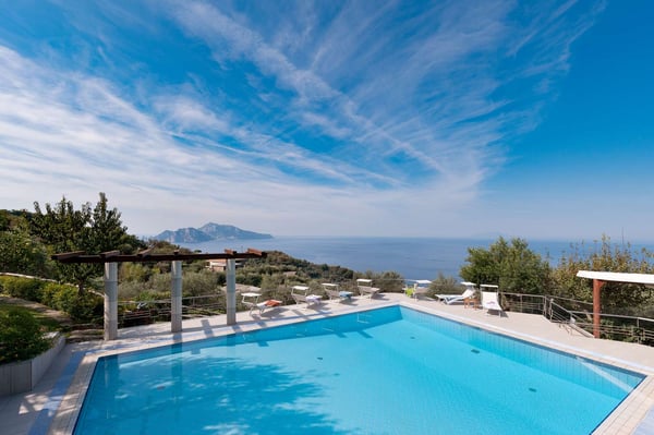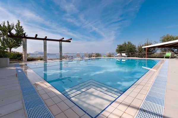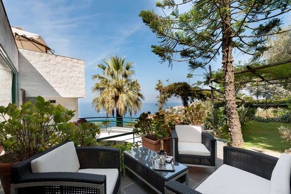 Villa Bonsanti is a modern and luminous three-story villa located on the coast in front of the island of Capri and Ischia, with a view of the entire Gulf of Naples. It features a private swimming pool (8 mts x 12 mts ), a wide, private terrace with a view of the sea and a beautiful patio lounge area living-porch equipped with comfortable sofas. The Garden is about 2000 sq. meters (6500 sq feet) large, shaded by an ancient lemon pergola and trees is equipped with a table, chairs, two sun umbrellas, deck chairs and sun lounger chairs, and part of the garden is equipped with games for children – a wide area of the lawn between olive and lemon trees, flowers, and Mediterranean plants. CIN: IT063044C2NG97ADBC