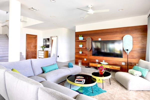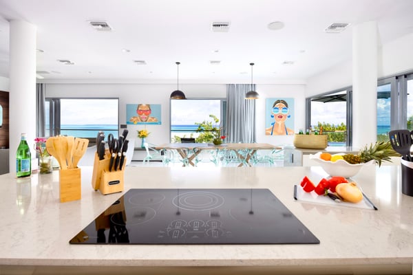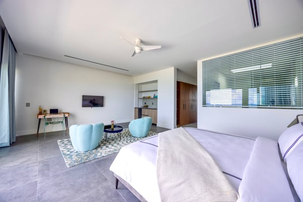 Welcome to this serene hillside villa in one of the most beautiful places on the island. Villa Skyline is a unique hideaway, resting atop Blue Mountain with breathtaking lookouts across the island and the ocean. Like the other villas, it is also elegantly furnished with finely selected designer pieces of furniture from Roche Bobois. The villa features imported kitchen and bathroom furniture from Italy, as well as top-of-the-line appliances and accessories from Europe and the USA. This villa boasts 5 spacious bedrooms, each with an ensuite luxurious bathroom and private terrace. Two newly added high-end guest suites come with kitchenettes and private balconies, delivering an even more exclusive oceanfront experience.Each room also includes a workspace.