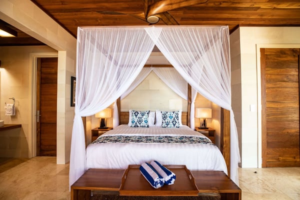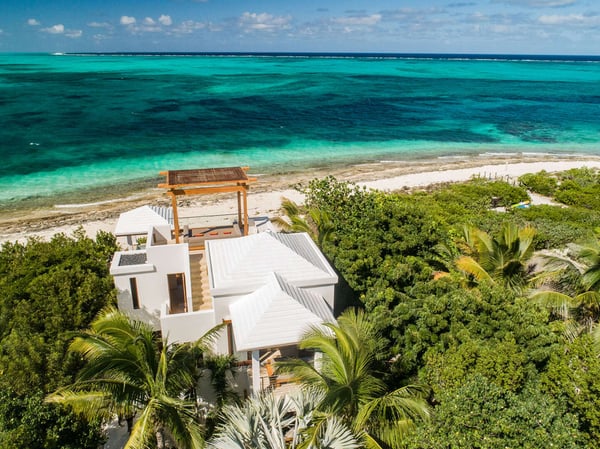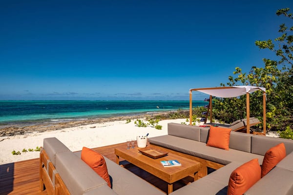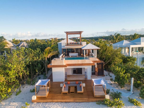 A small, perfectly formed beach retreat filled with quirky features and arty vibes. Located directly on the beach at Turtle Cove and a short walk from the marina, Beach Cake is an intimate retreat where the inside is outside, the downstairs is upstairs, and the garden is soft white sand. The inverted layout – the bedrooms are on the beach level, with the living room, kitchen and pool above – ensures guests can fully appreciate the spectacular views throughout the day while the pool and dining areas remain out of sight of beachgoers. Gorgeous decks and ceilings made with Balinese teak, and a design that blurs the boundaries between indoors and outdoors imbues it with a tropical appeal, while the vibrant artworks, funky light fixtures and colourful accessories lend it a fresh, youthful feel. Two spacious bedrooms furnished with four poster beds are located on the lower level. Each boasts an exotic outdoor bathroom with rain shower and the principal bedroom, which opens directly onto the beach, also features an open-air bath. This level also includes a large hardwood deck, directly over the sand, with seating and daybeds. Upstairs the warm timber tones of the open plan living room and kitchen continue out onto a second deck where seating and dining areas and a pale blue pool all offer unobstructed beach and ocean views. A third-floor observation deck with a large daybed offers 360-degree views encompassing the beach and ocean in front, and the marina behind.
