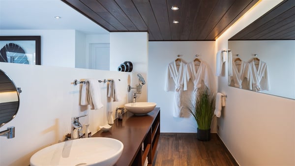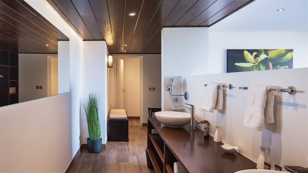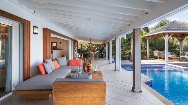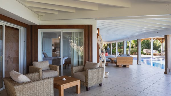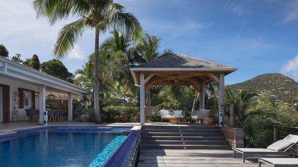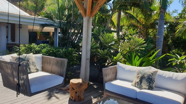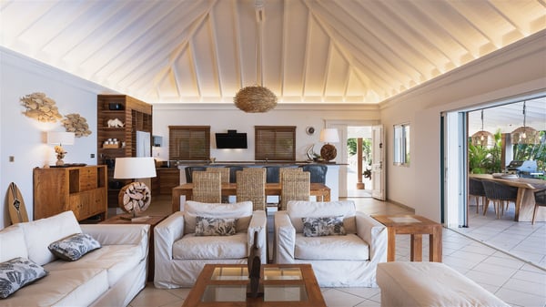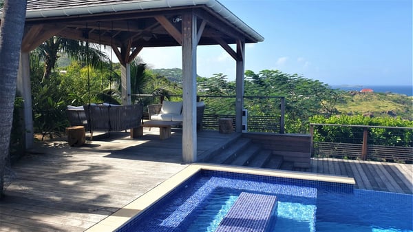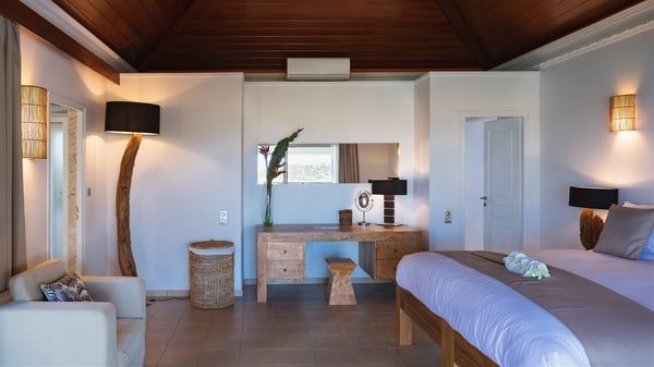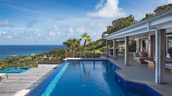 The charming holiday rental Endeavour is located on the heights of Toiny in the heart of a beautiful environment. With a breathtaking view over the Petit-Cul-de-Sac lagoon and the neighbouring hills, and nestled at the end of a road, this idyllic luxury retreat offers peacefulness and exclusive privacy. This quiet and modern holiday home in St Barths is very comfortable and features a sea and wooden décor. The tastefully cream and neutral tones perfectly blend with the white walls and high vaulted ceiling. You'll love to relax in the spacious air-conditioned living space, beautifully decorated with an ethnic-chic design: soft fabrics, white cozy sofas, armchairs covered with cushions and wooden coffee tables are there for pleasant moments. This great room faces the splendid view over the ocean through the large floor-to-ceiling doors opening onto the terrace. The inside dining room is furnished with a massive wooden table that can accommodate up to six guests for gourmet meals prepared in the well-equipped kitchen with a breakfast bar. Under the high, whitewashed, vaulted ceiling, you'll feel comfortable and relaxed. Take a few steps outside and enjoy the splendid and expansive terrace with a heated infinity swimming pool and a Jacuzzi at the corner, facing the hypnotizing horizon. Sun loungers surround the pools in a perfect setup dedicated to sunbathing. An outdoor lounge area with large sofas is located under the covered terrace, next to the outdoor dining room where you’ll have your alfresco meals swept by the cool trade winds. A second welcoming outdoor lounge space is under the gazebo, where you can gather, have a drink, read or watch the breathtaking panorama of the sky reflected in the ocean. The holiday rental Enveavour in St. Barths is composed of three beautiful air-conditioned bedrooms, featuring either king or twin beds that can be converted into a king. Each room has its own private bathroom with a bathtub or a semi-outdoor shower. The decoration is refined and warm, with cushions and fabrics for a warm, cozy feeling. Two of the bedrooms are located on the main level of the villa with access to the terrace and enjoy an ocean view, while the third bedroom is located on the lower floor. There is also a well-equipped fitness room for those wishing to do some exercise.