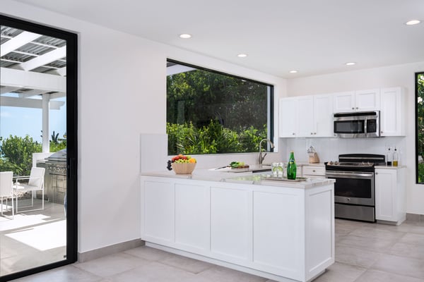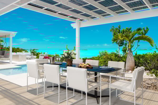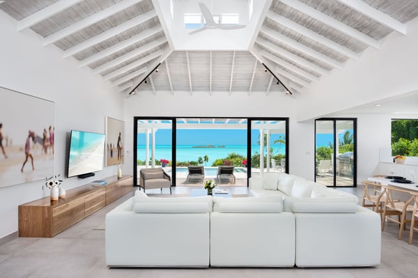 Sandy Shore is a 4-bedroom all-suite beachfront villa located on the Southside of Providenciales in the Turtle Tail region. The villa boasts an open-concept kitchen and living room area, perfect for entertaining while also allowing guests to truly appreciate the best of the Turks and Caicos, with incredible ocean views of the island’s Caicos Banks. The villa has one primary suite with a king bed and ocean views, while bedrooms 2, 3, and 4 enjoy tropical garden views and private walk-out decks. Sandy Shore’ exterior pool deck offers guests ample lounge space and furnishings, and a shallow lounge pool, perfect for guests of all ages. From the pool deck, follow the villa’s own local stone rock pathway directly to the beach lounge. While no beaches in the Turks and Caicos are private, Sandy Shore is about as private as it gets, with only a few other homes sharing the same beach and next to no foot traffic. The ocean entry is sandy and shallow. The bay where the villa is located protects the villa and waterfront year-round from big waves and heavy winds. Within the bay, depths do not exceed 5′, so the Cays (islands) seen from the beach can be walked out to with ease. Guests of Sandy Shore enjoy an on-call management team ready to assist with any concierge requests, such as booking excursions or your own private massage or yoga session at the villa. Amenities include beach kayaks, high-speed wifi throughout, a large 5-burner gas grill, laundry facilities, and a fully air-conditioned interior. The villa also comes with a daily housekeeping service and an on-call management team.