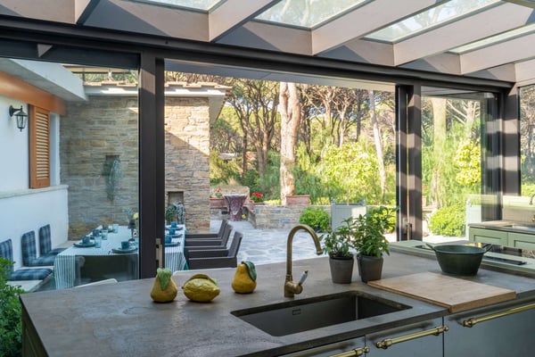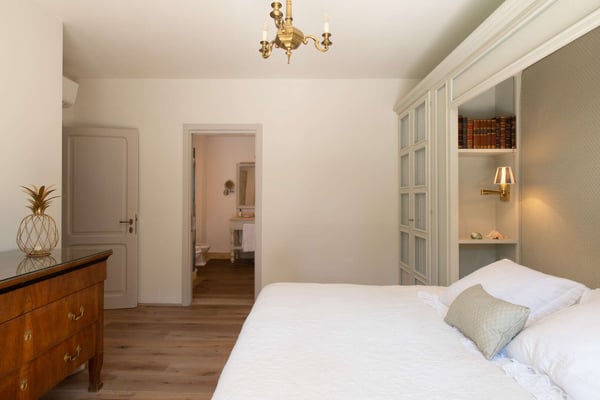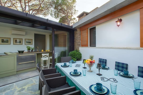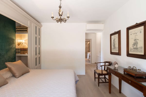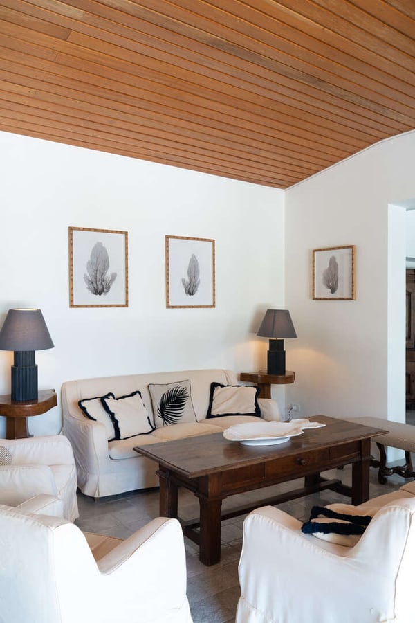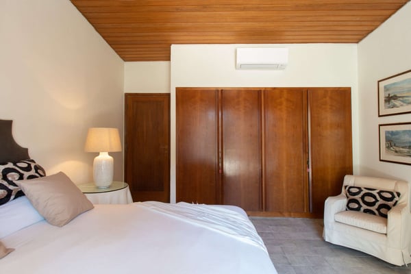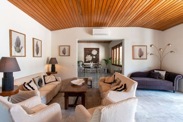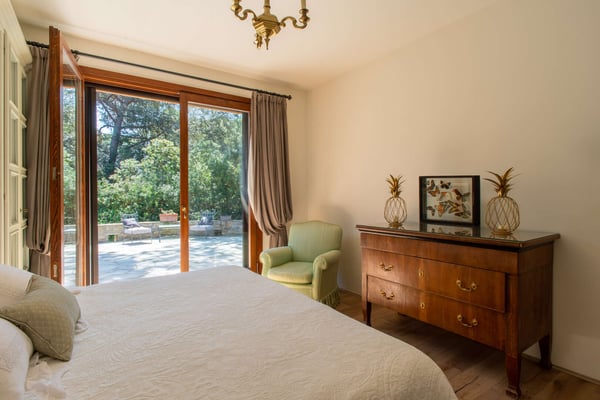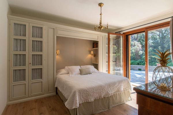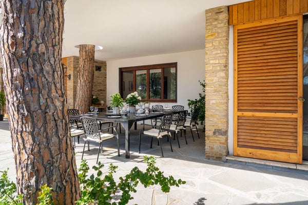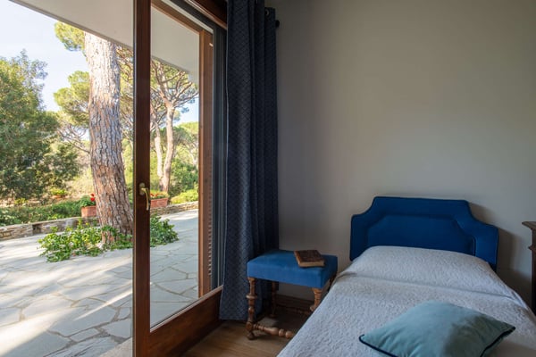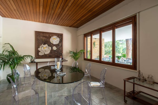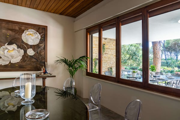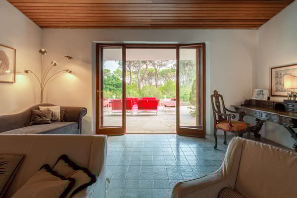 Villa Gerani is immersed in a beautiful pine tree forest, on a private beach, inside a gated community called pineta di Roccamare. The villa has a beautiful private garden of 10 acres and it’s only a few steps from the sea and the long white sandy beach of Roccamare. The beach of Roccamare is considered one of the most beautiful beaches in Italy’ recognized also by the European blue flag status, which guarantees for amazingly clear and clean water. The Pineta di Roccamare is a private gated community with controlled access. The Villa Gerani was built in 1963 by the famous Italian architect Ugo Miglietta for Wanda Ferragamo, Salvatore Ferragamo’s wife and belongs today to her grandson Salvatore Ferragamo junior. The Villa Gerani is surrounded by pinewood forest with a beautiful lawn and garden, and a spacious stone terrace full of geraniums (which give the villa its name), on the beachfront side of the villa you will find a large patio overlooking the pool area, and a path of about 90 meters leads from the terrace or pool directly to the beach where the house disposes of a private beach bungalow and a changing area. The main entrance of the villa opens into a beautiful living and dining room, with a fireplace and a study and TV room. The dining room with its large French windows looks onto the terrace and garden beachfront side of the villa that enjoys two living corners of opposing couches and a large table for outdoor dining. On the garden side, you find a beautiful new kitchen with another smaller more intimate outdoor living and dining option. The environments are all very bright and lead out on the terrace that surrounds the entire house. A total of seven en-suite master bedrooms are available for guests on the main floor of the Villa. The lower floor includes a large garage for two cars, a laundry room, a pantry room with two extra fridges and two bedrooms and two bathrooms for the exclusive use of the guest’s villa staff. CIN: IT053006C28BWU68HA