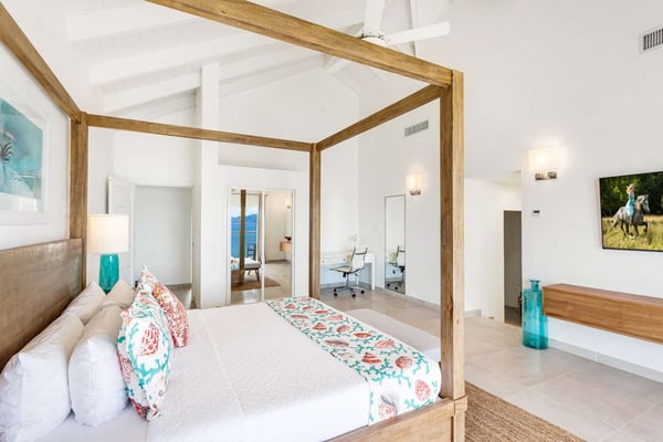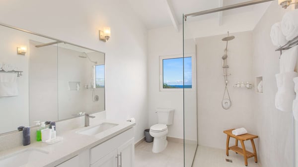 Villa Angel Point is a luxurious five-bedroom retreat on Anguilla's tranquil Caribbean coast. Completely renovated in 2023, this contemporary villa in Anguilla offers breathtaking views of St. Martin from its sun-soaked terraces, furnished with comfortable loungers and sofas surrounding the private pool. The poolside area is an oasis of relaxation with covered seating, a barbecue grill, and ample space to unwind. For the adventurous, kayaks and paddleboards are available to explore the nearby Little Harbor beach, just a short paddle away. The villa seamlessly blends indoor and outdoor living with floor-to-ceiling sliding doors that invite the refreshing ocean breeze. The spacious common area features two living rooms, perfect for entertaining, and a modern kitchen equipped with high-end appliances. Guests can enjoy meals at the custom wooden dining table or al fresco on the harbor terrace. The villa comprises two separate houses, each with three generously sized bedrooms. Conveniently located in Little Harbour, Angel Point is just minutes from the ferry port, airport, adjacent villas such as Indigo Villa, and island attractions like golf and tennis. It’s the ideal escape for those seeking tranquility and luxury in a stunning Caribbean setting. Angel Point is divided into two parts, the main house and the bungalow. This increases your privacy and expands its capabilities.