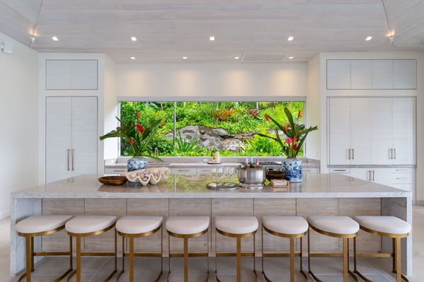 - Grand kitchen with marble island seating and a stunning tropical garden backdrop
