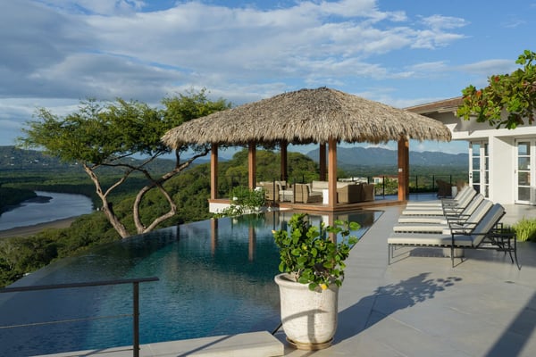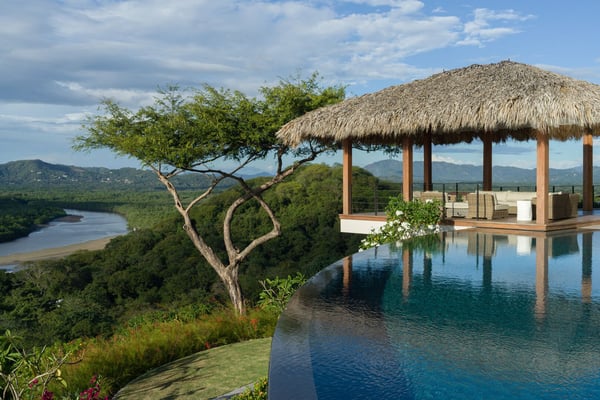 Infinity pool beside an open air palapa overlooking a winding river.Infinity pool beside an open air palapa overlooking a winding river.