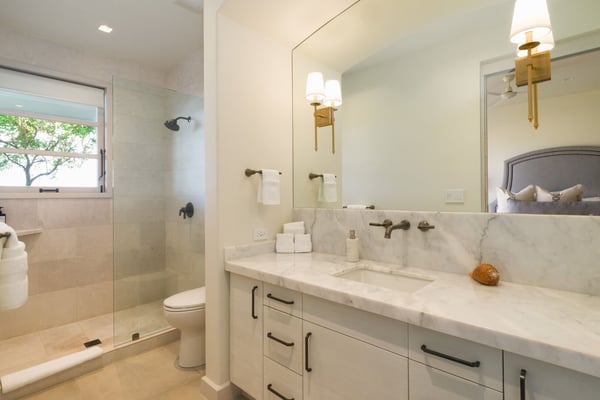 - Marble vanity with - Refresh in this light filled bathroom with soft tones and warm brass accents - Marble vanity with