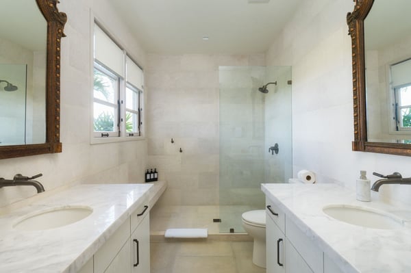 - Unwind in this bright bathroom with double vanities and carved antique mirrors